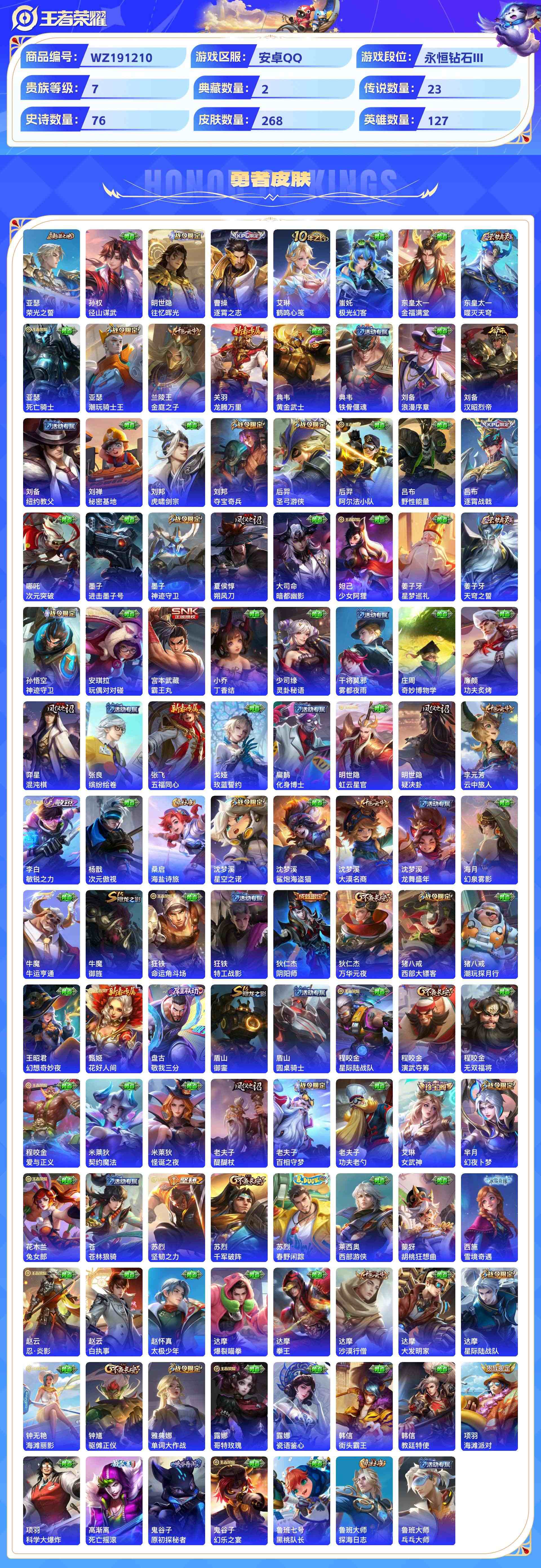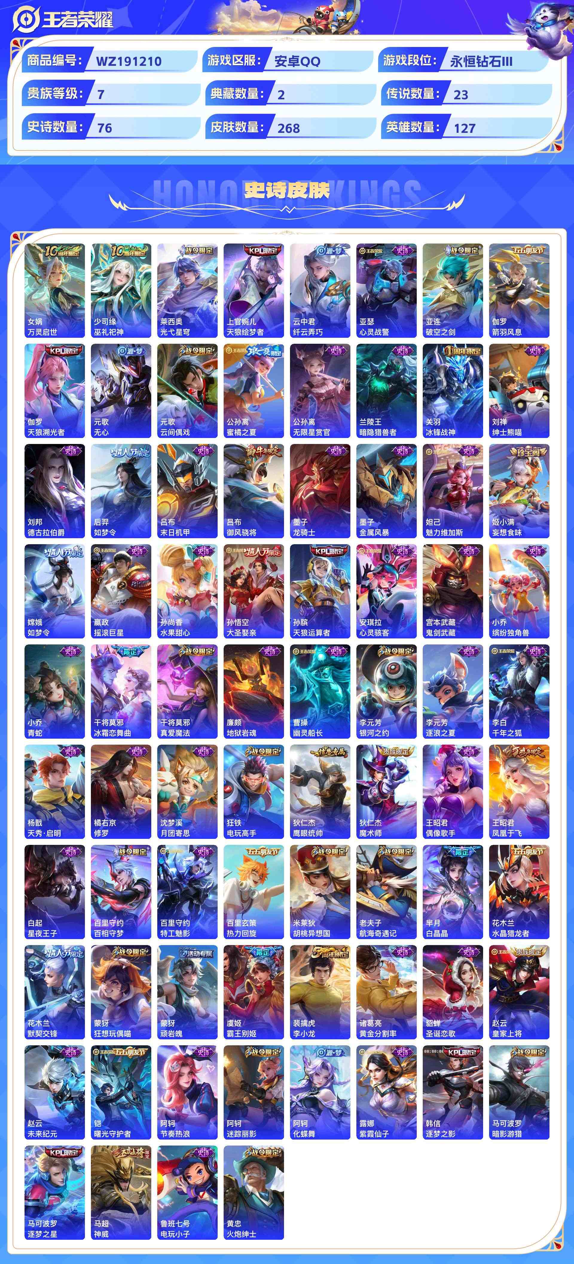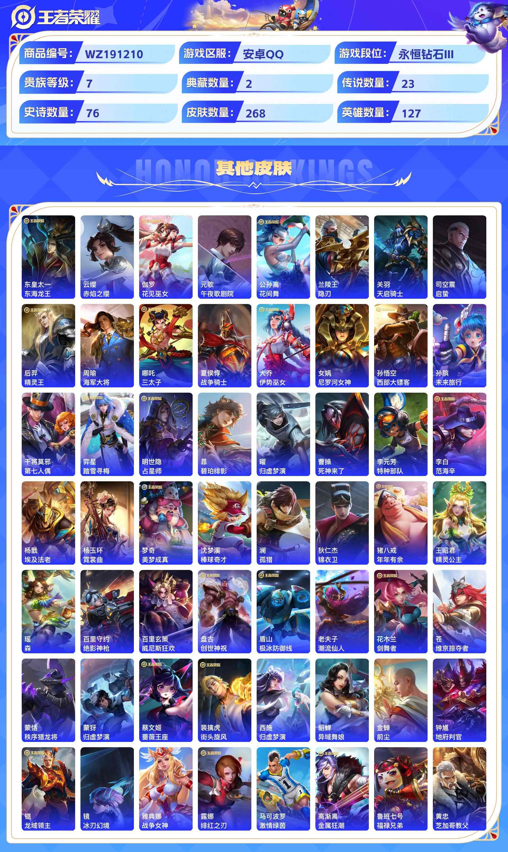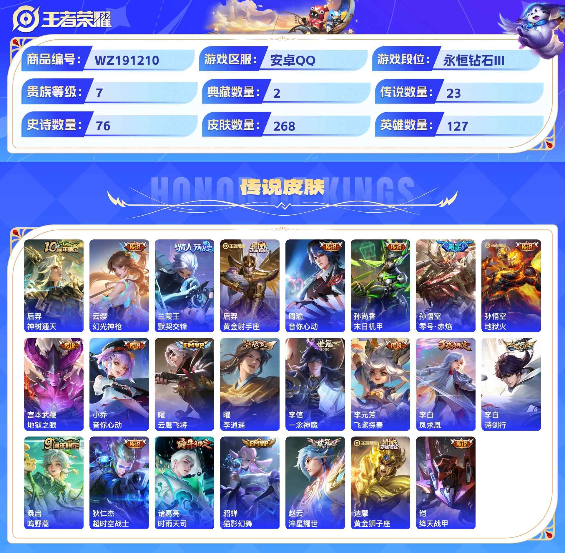 wz191210|精品号【荣耀典藏】全息碎影鸣剑·曳影【传说皮肤】神树通天幻光神呛默契交锋黄金射手座音你心动末日机甲零号·赤焰地狱火地狱之眼音你心动云鹰飞将李 一念神魔飞鸢探春凤求凰诗剑行鸣野蒿超时空战士时雨天司猫影幻舞淬星耀世黄金狮子座绛天战甲安卓qq 贵族7级 268皮 2典藏 23传说 76史诗2星传说4个性按键