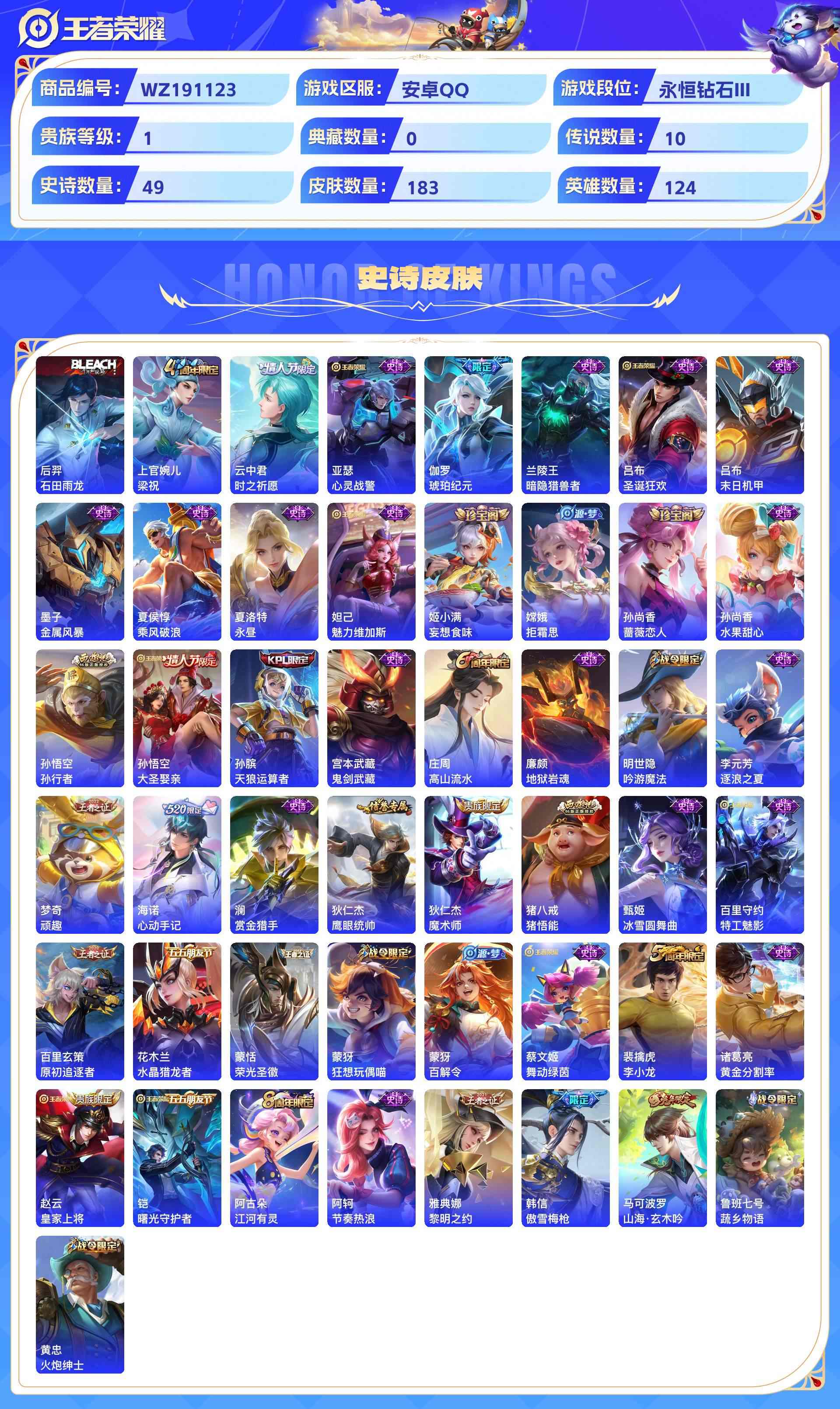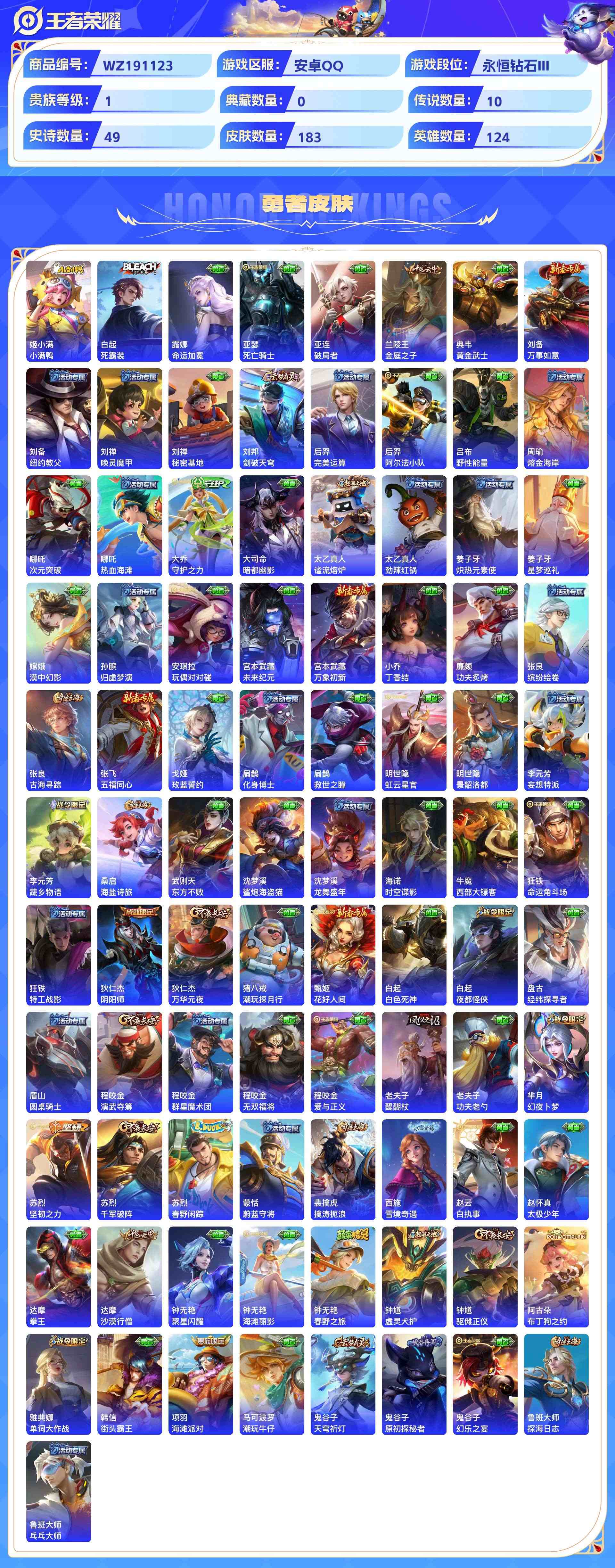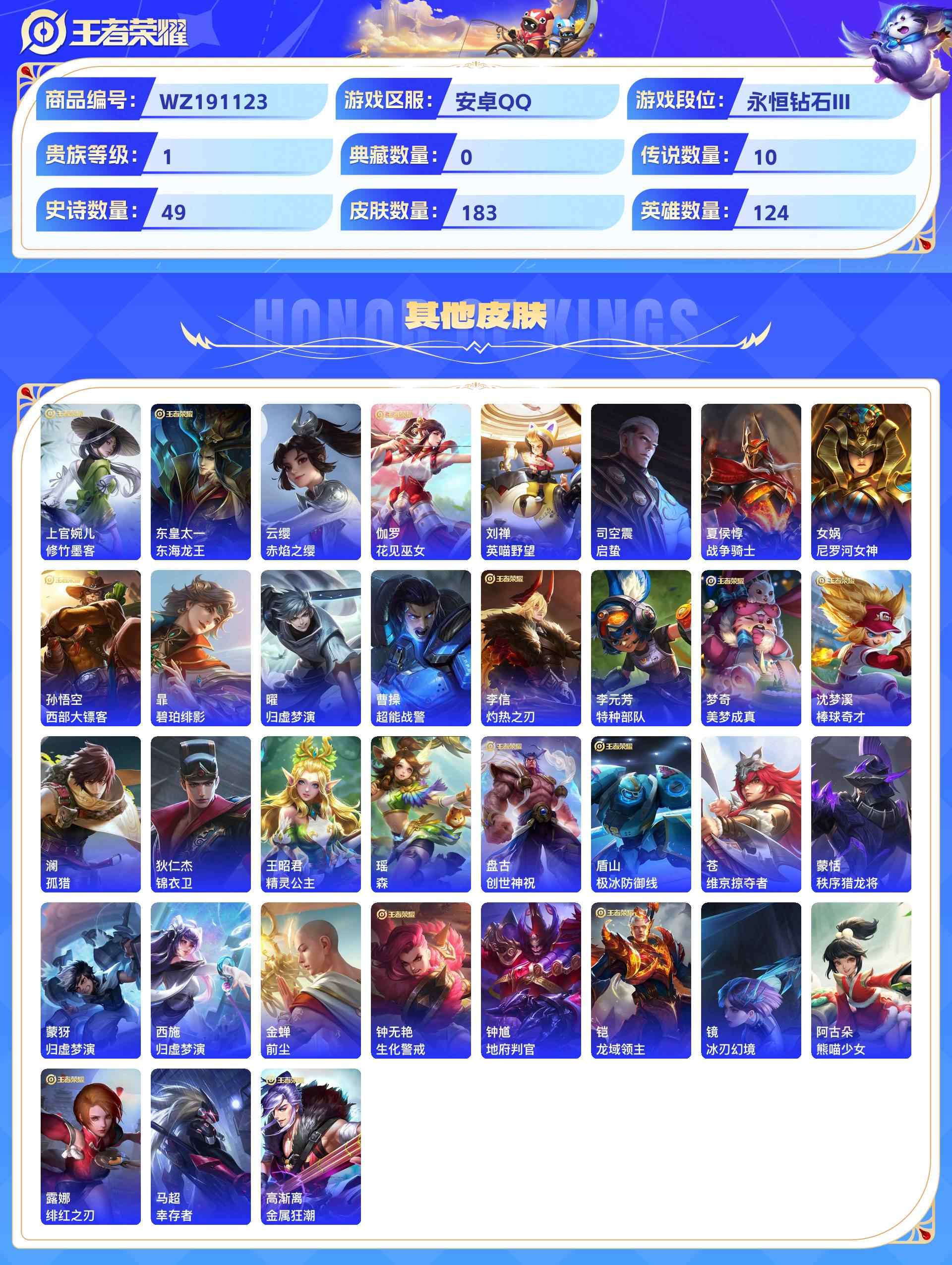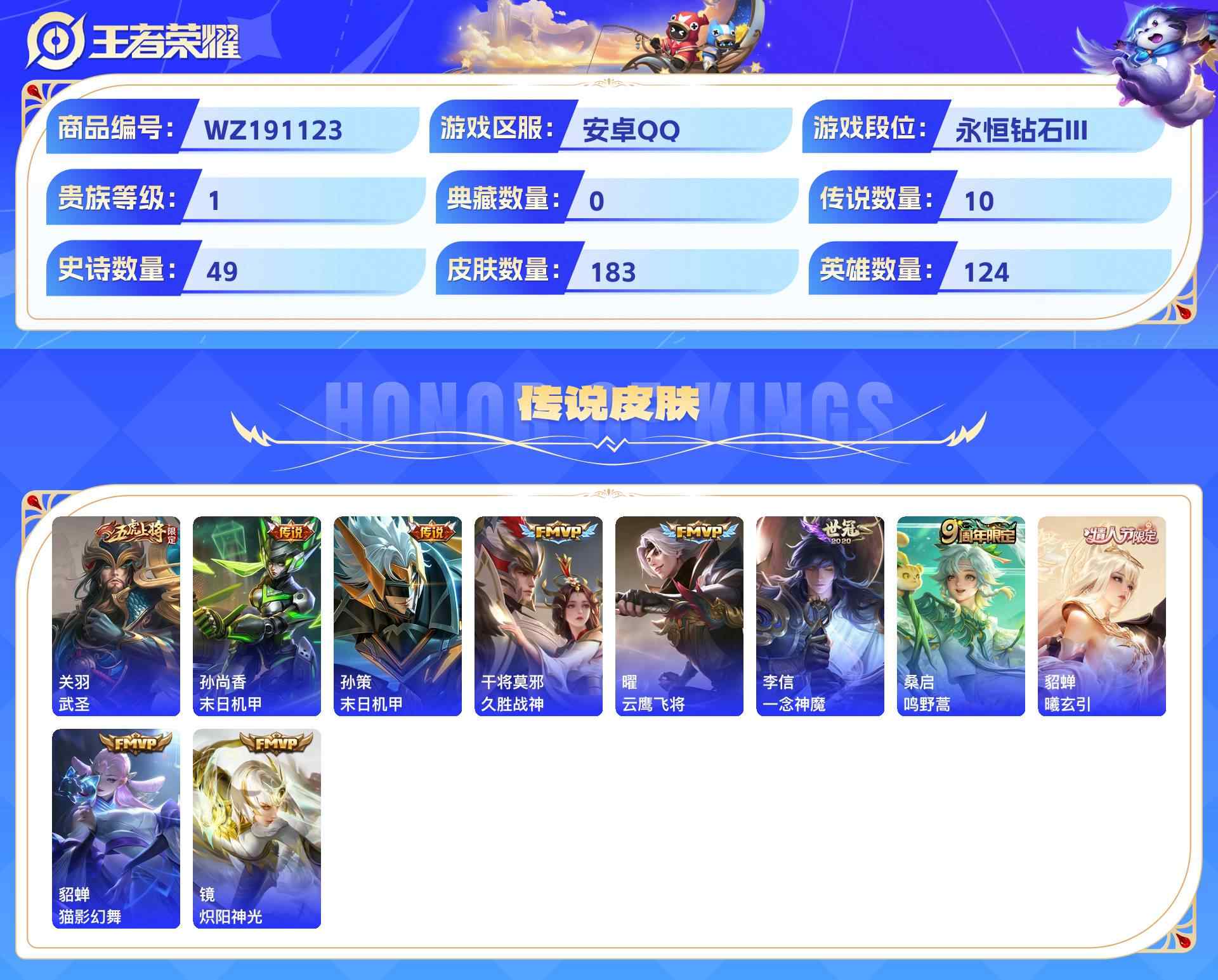 wz191123|精品号【传说皮肤】武圣末日机甲末日机甲久胜战神云鹰飞将一念神魔鸣野蒿曦玄引猫影幻舞炽阳神光安卓qq 贵族7级 183皮 10传说 49史诗1星传说7个性按键