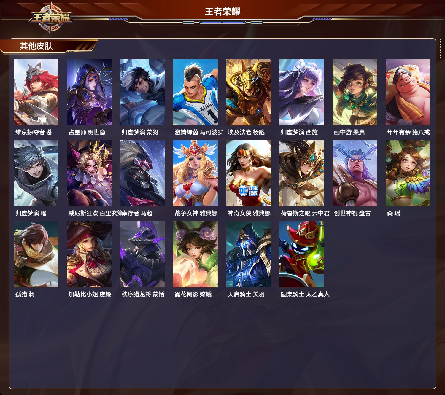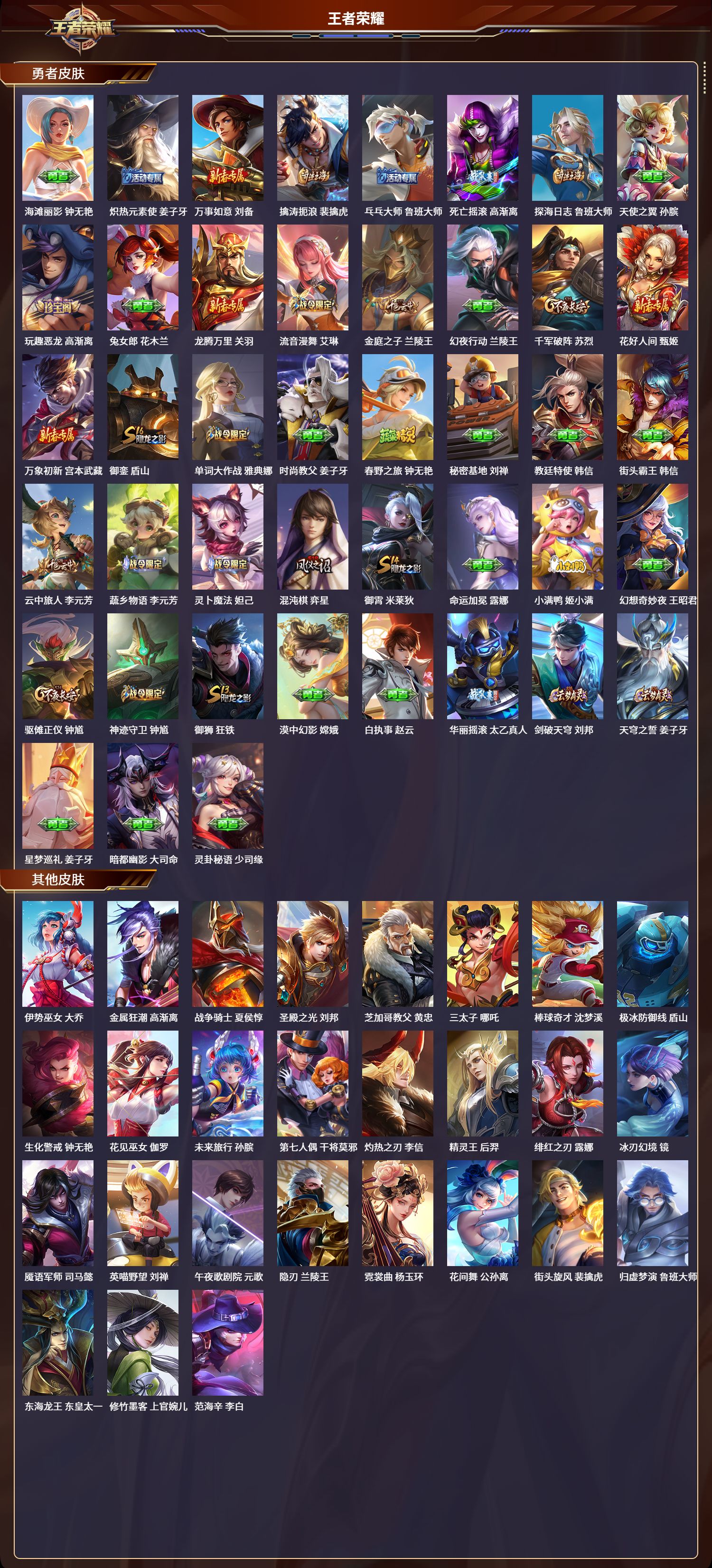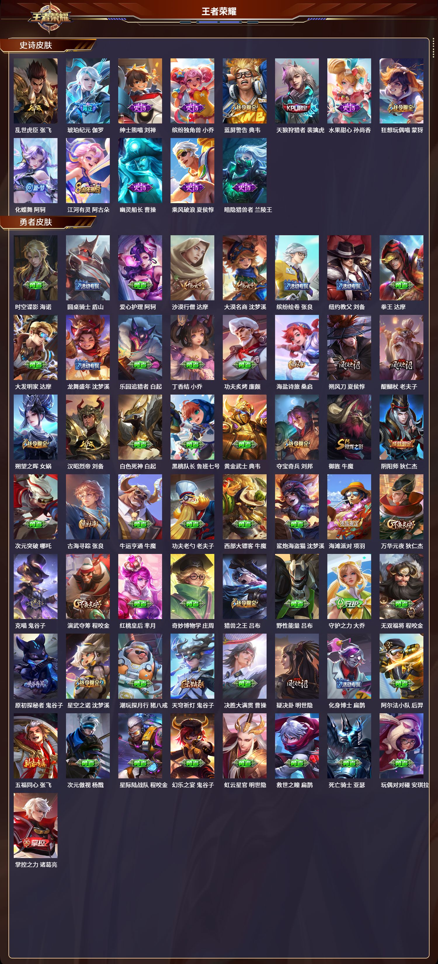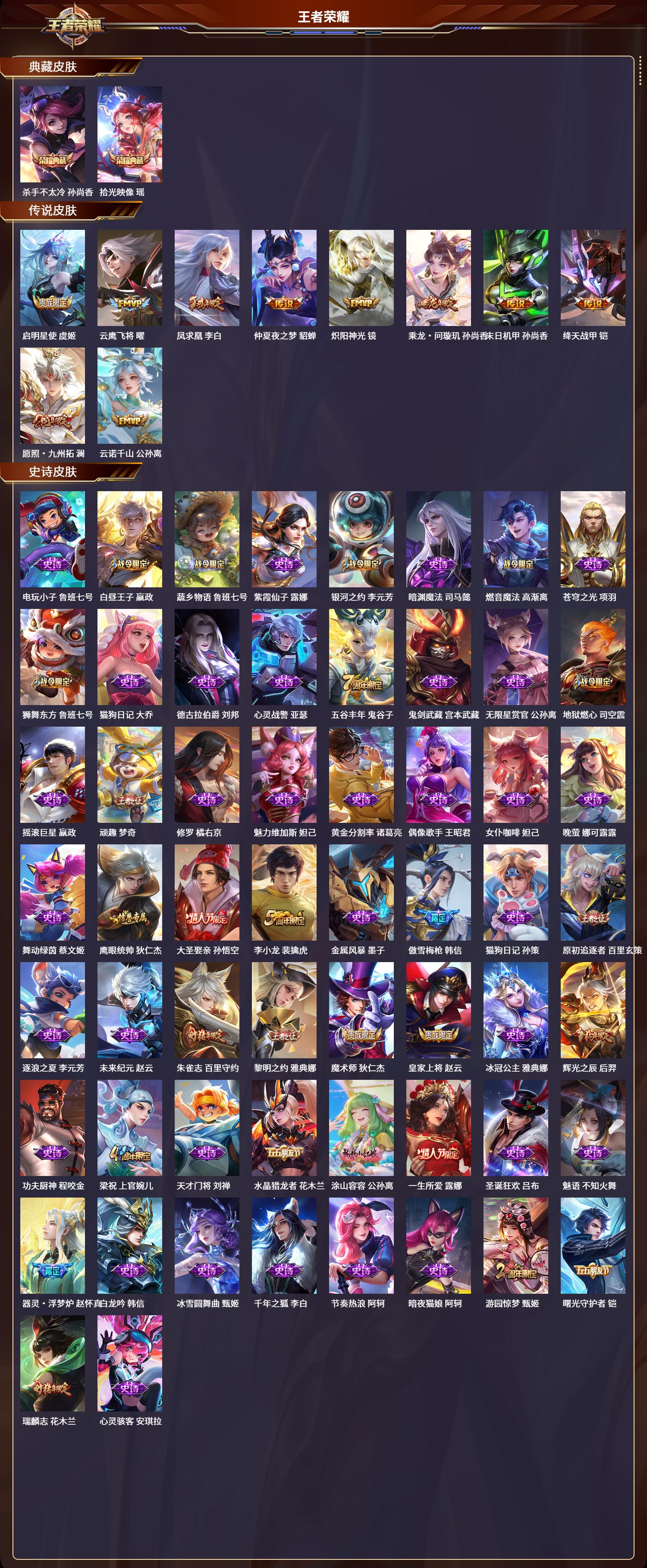 安卓qq/尊贵铂金/233皮肤/125英雄/2典藏/0珍品无双/0无双/0珍品传说/10传说/71史诗/9稀有英雄【2 典藏皮肤】杀手不太冷 孙尚香拾光映像 瑶【10 传说皮肤】启明星使 虞姬云鹰飞将 曜凤求凰 李白仲夏夜之梦 貂蝉炽阳神光 镜乘龙·问璇玑 孙尚香末日机甲 孙尚香绛天战甲 铠愿照·九州拓 澜云诺千山 公孙离【71 史诗皮肤】电玩小子 鲁班