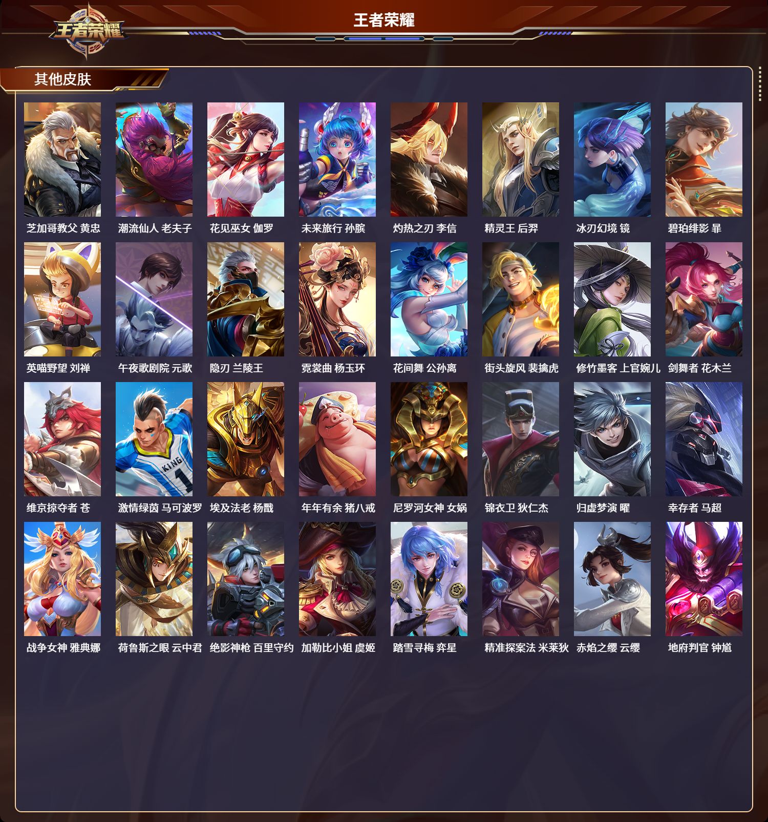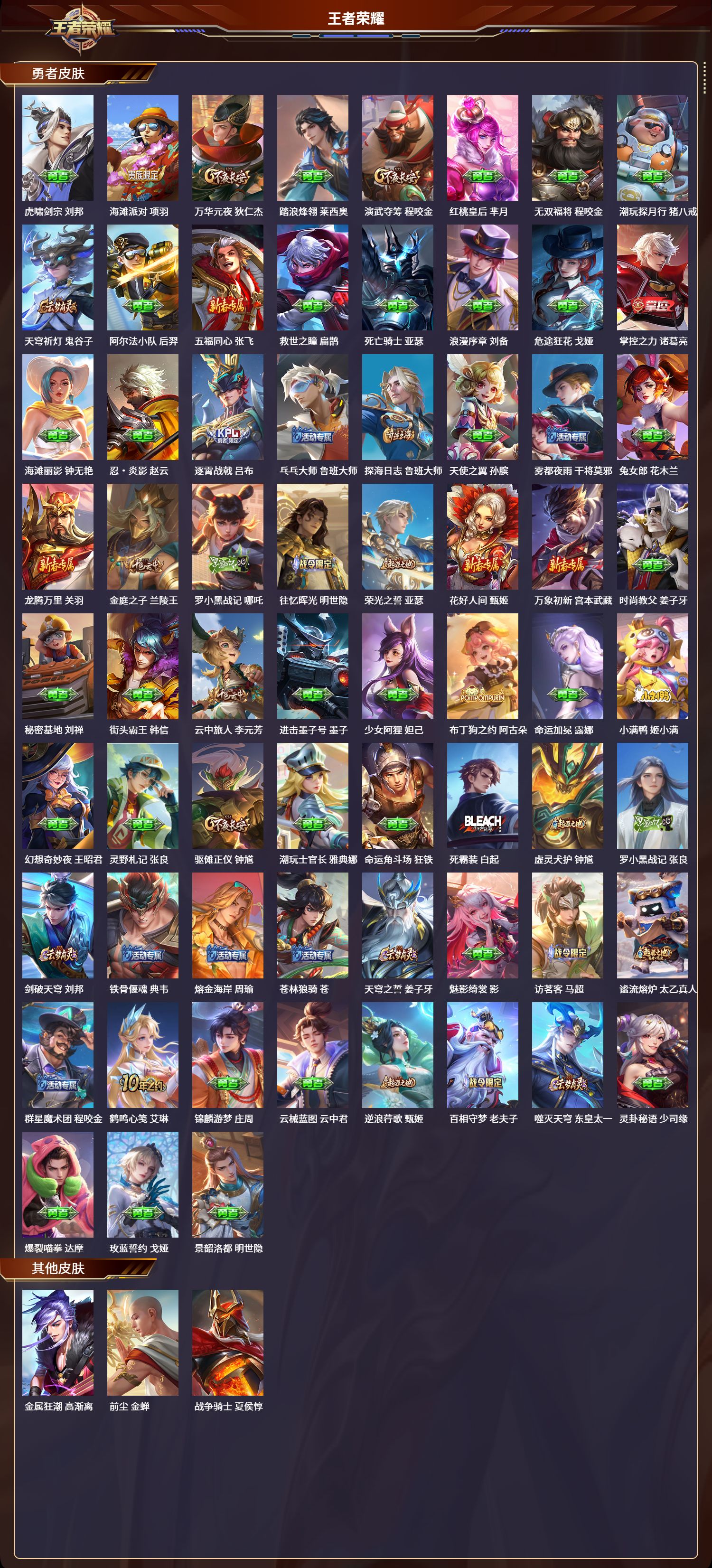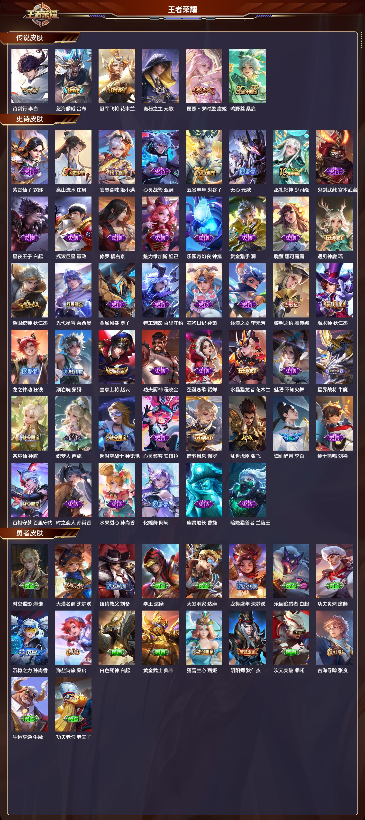 安卓qq/无双王者/175皮肤/123英雄/0典藏/0珍品无双/0无双/0珍品传说/6传说/46史诗/7稀有英雄【6 传说皮肤】诗剑行 李白怒海麟威 吕布冠军飞将 花木兰诡秘之主 元歌愿照·岁时盈 虞姬鸣野蒿 桑启【46 史诗皮肤】紫霞仙子 露娜高山流水 庄周妄想食味 姬小满心灵战警 亚瑟五谷丰年 鬼谷子无心 元歌巫礼祀神 少司缘鬼剑武藏 宫本武藏星