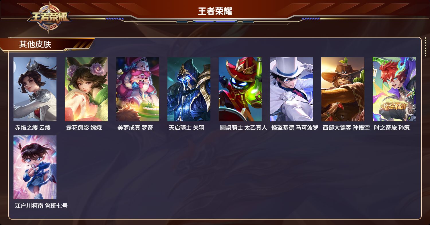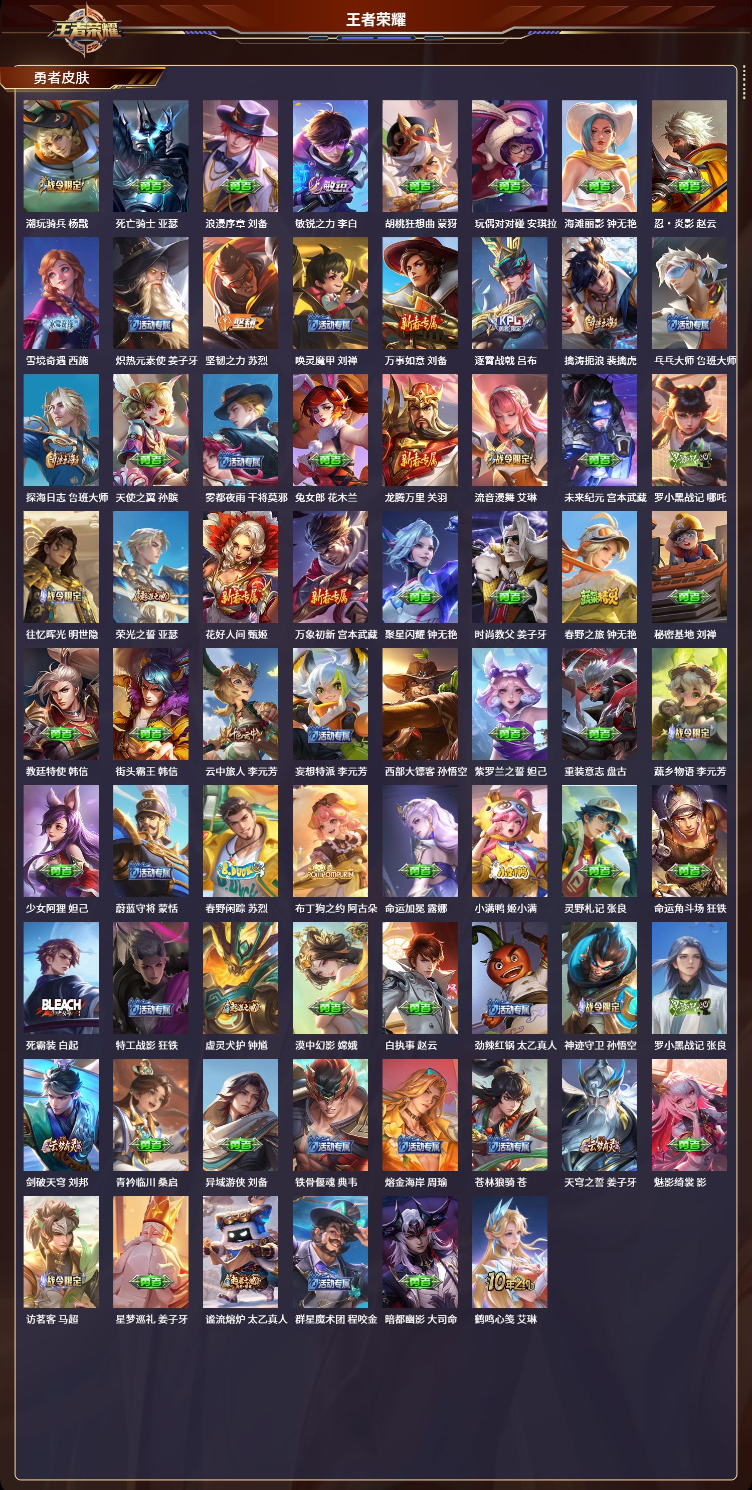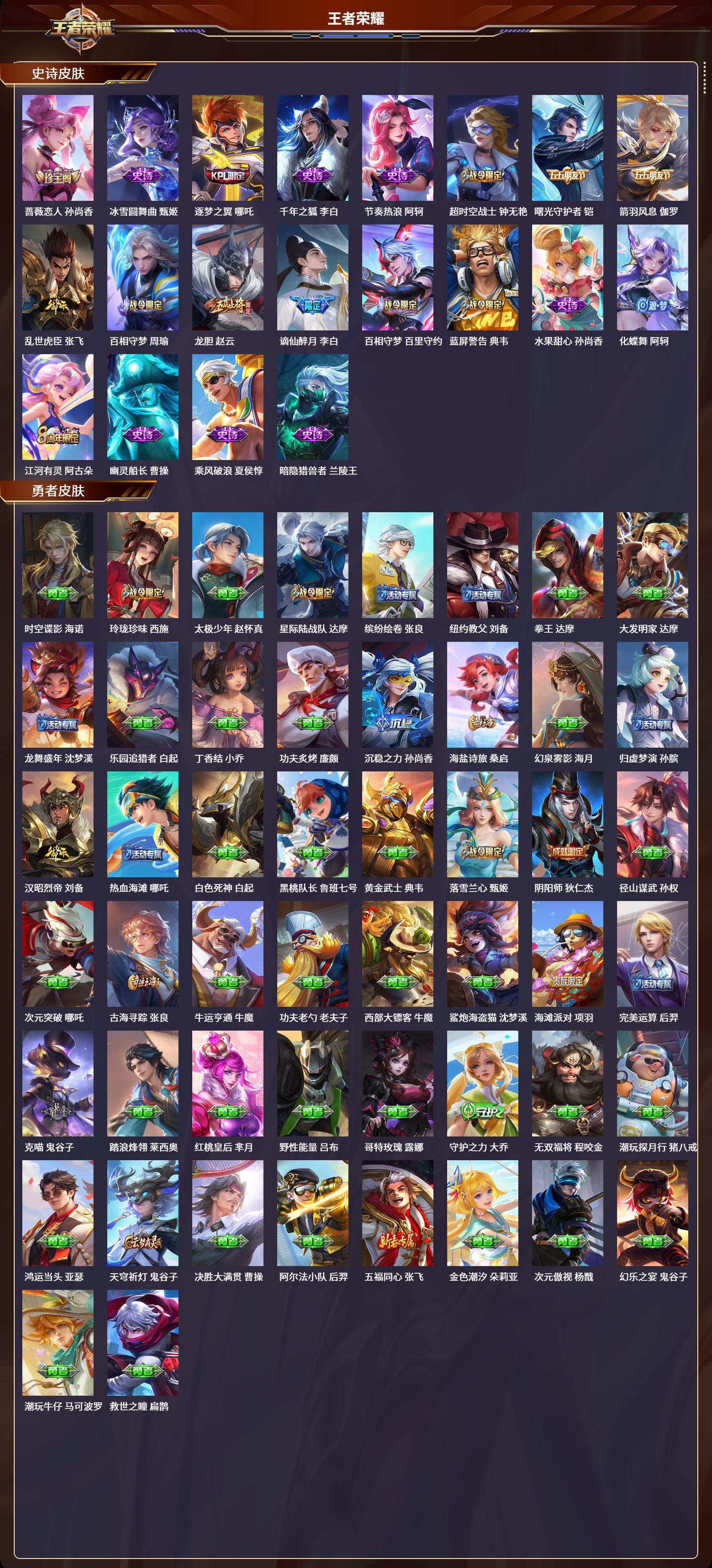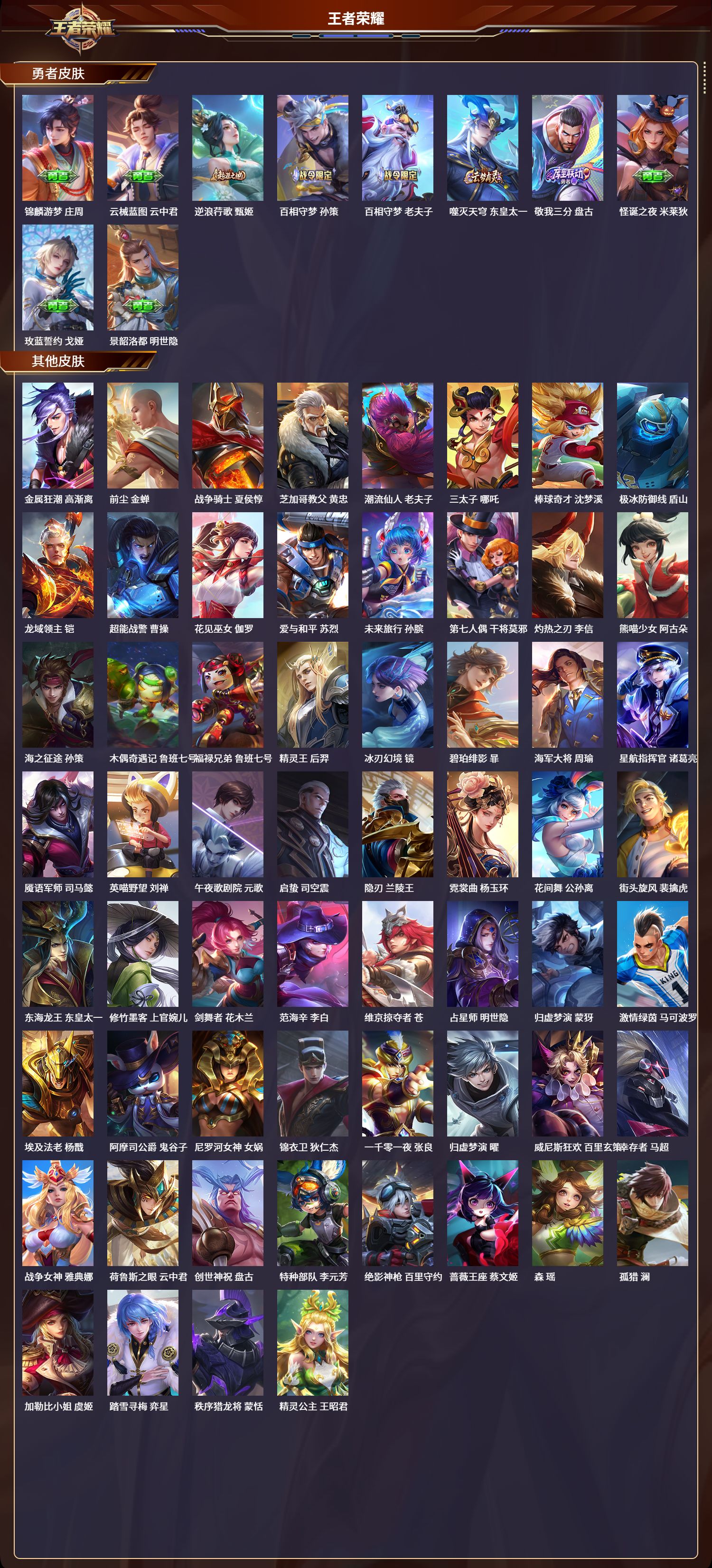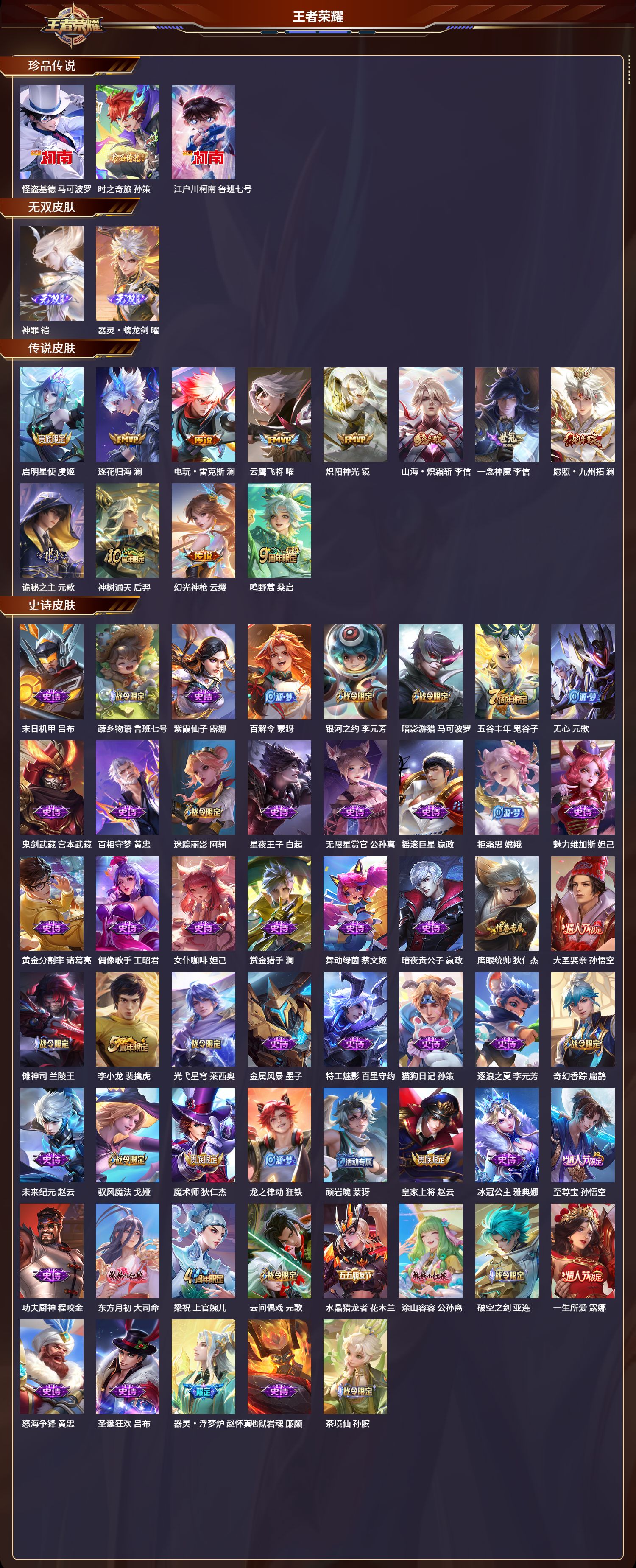 安卓qq/非凡王者/286皮肤/124英雄/0典藏/0珍品无双/2无双/3珍品传说/12传说/73史诗/8稀有英雄【3 珍品传说】怪盗基德 马可波罗时之奇旅 孙策江户川柯南 鲁班七号【2 无双皮肤】神罪 铠器灵·螭龙剑 曜【12 传说皮肤】启明星使 虞姬逐花归海 澜电玩·雷克斯 澜云鹰飞将 曜炽阳神光 镜山海·炽霜斩 李信一念神魔 李信愿照·九州拓 澜
