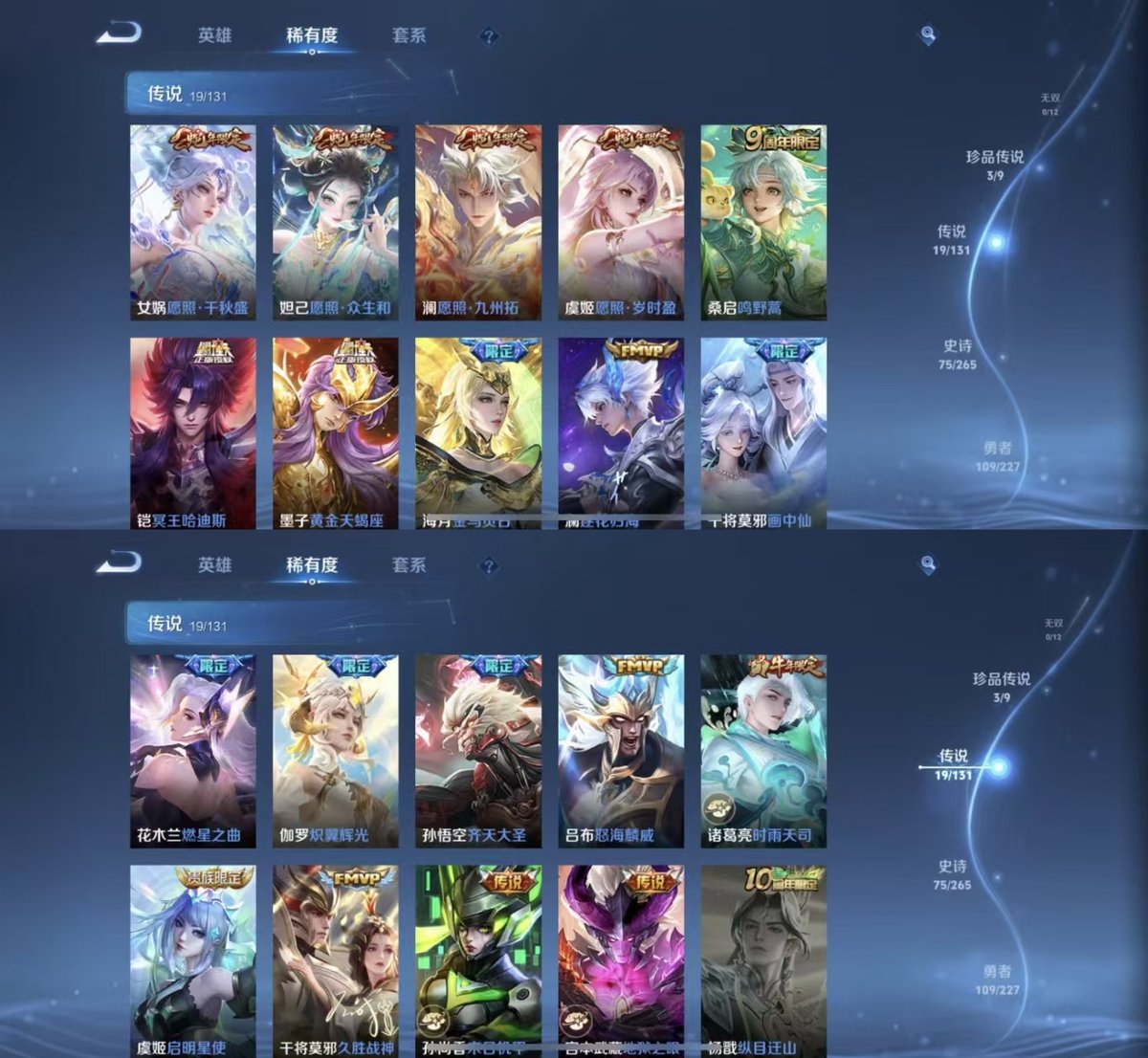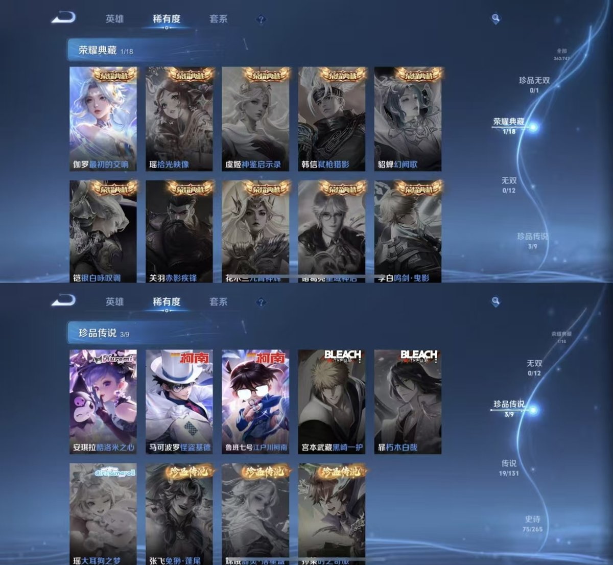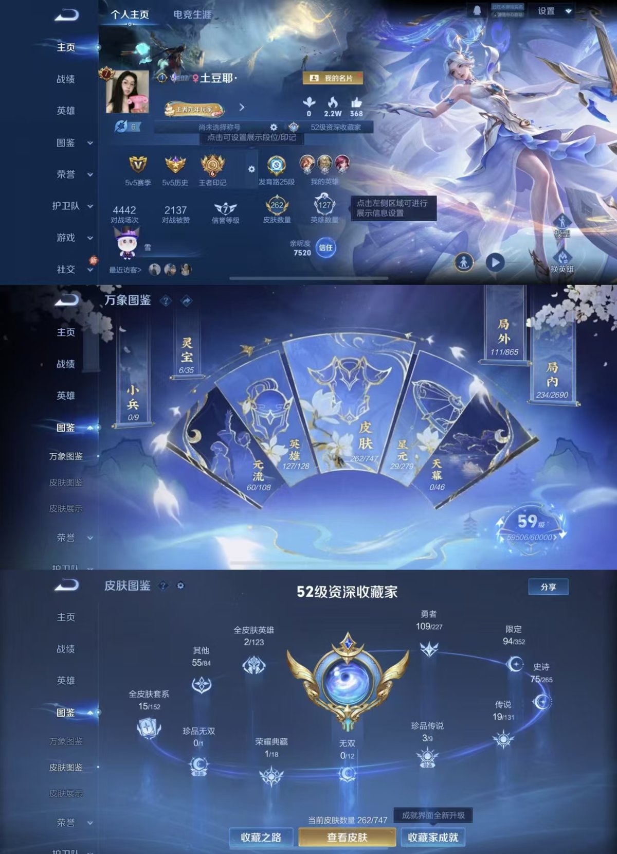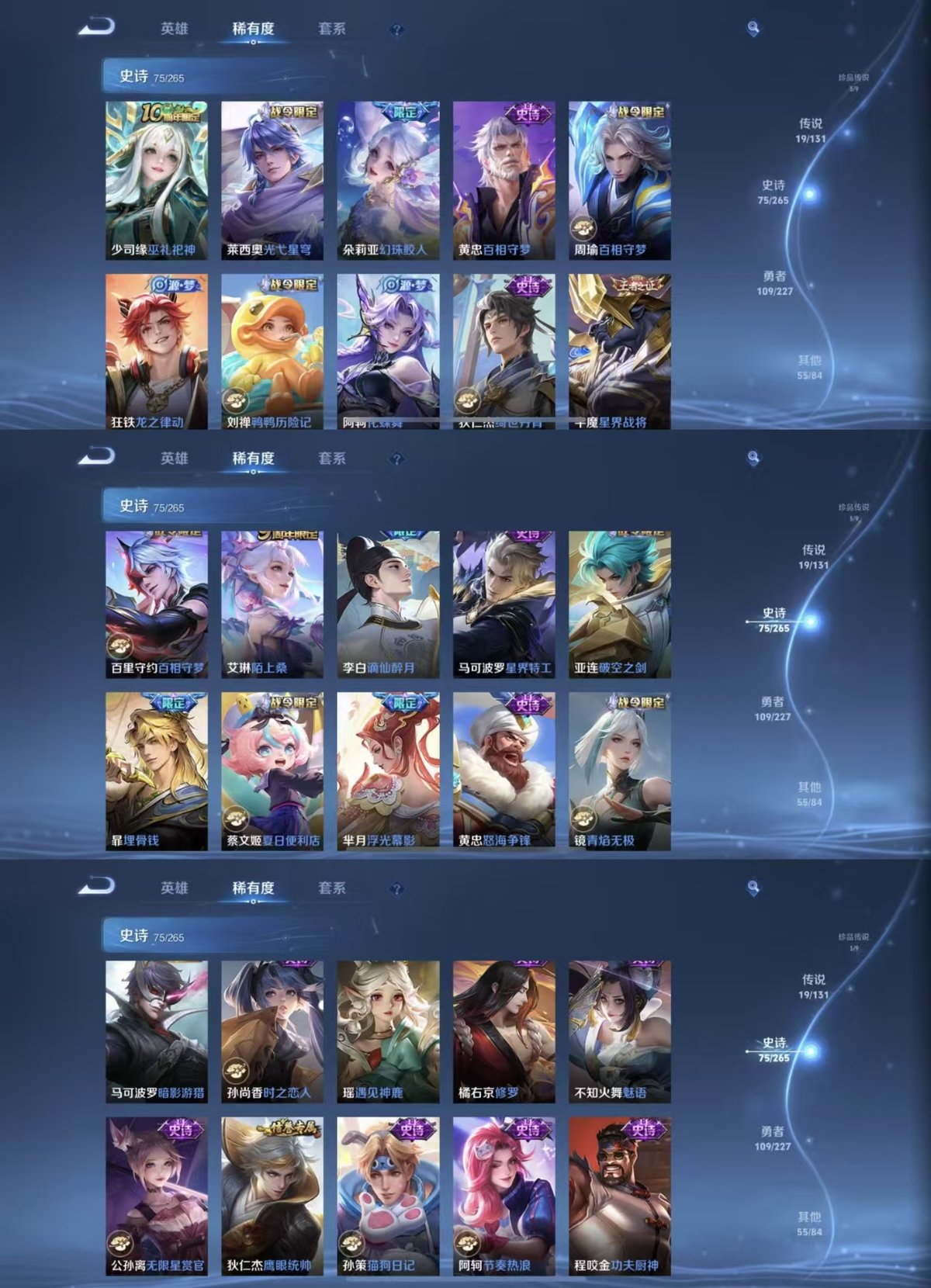 2299025-实名: 可修改 贵族等级: v8 英雄数: 127 皮肤数: 262 荣耀水晶: 最初的交响 珍品传说: 江户川柯南怪盗基德酷洛米之心 传说皮: 久胜战神末日机甲-孙尚香地狱之眼炽翼辉光燃星之曲画中仙澜逐花归海金乌负日黄金天蝎座铠冥王哈迪斯 限定皮: 李小龙时雨天司魔法小厨娘孙行者五谷丰年怒海麟威山海·碧波行齐天大圣鸣野蒿陌上桑逐霄战