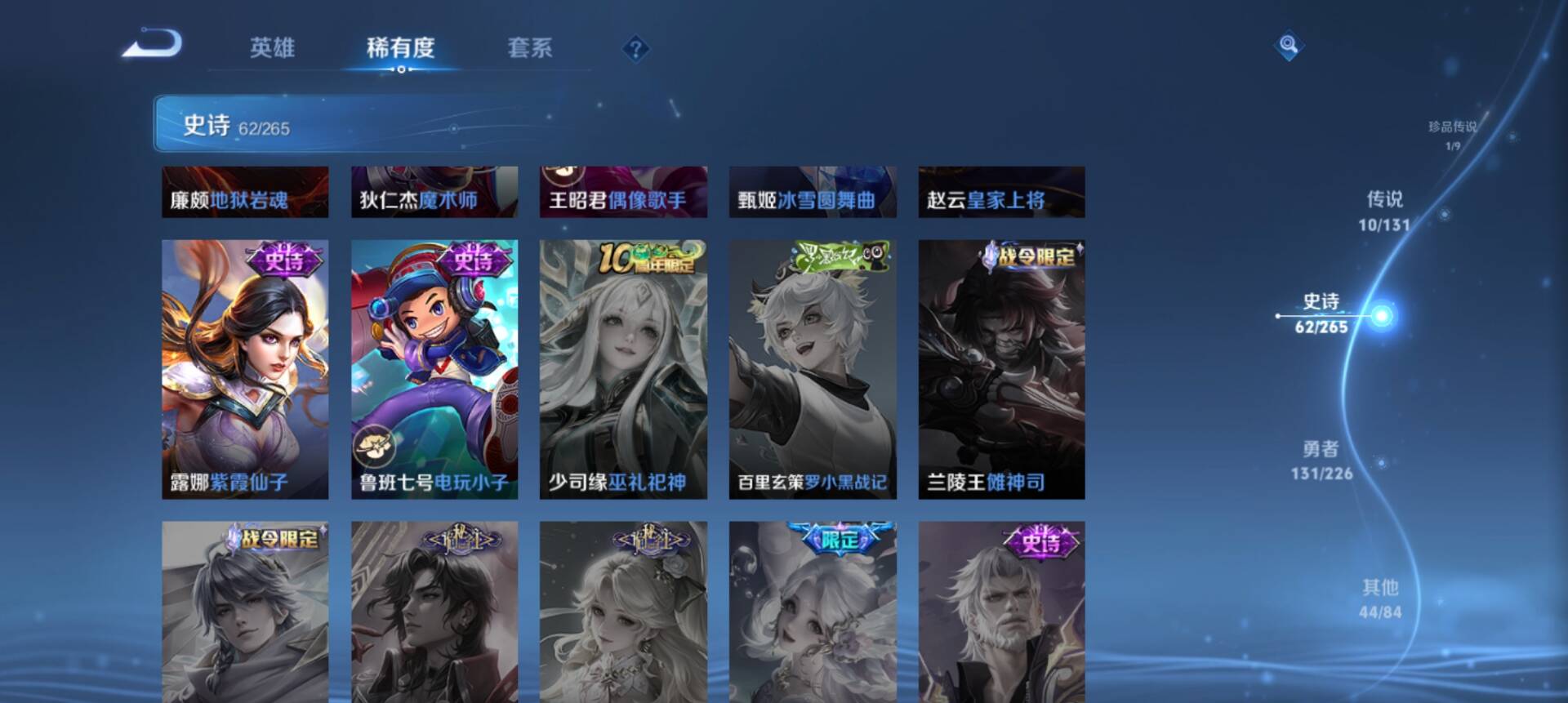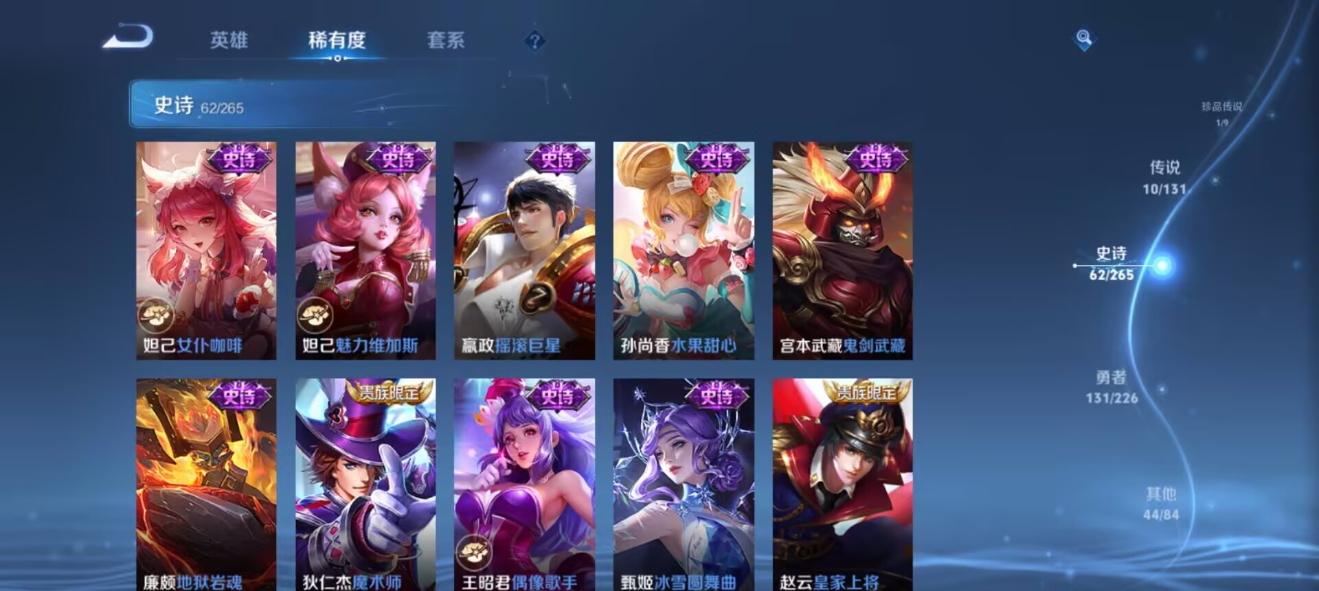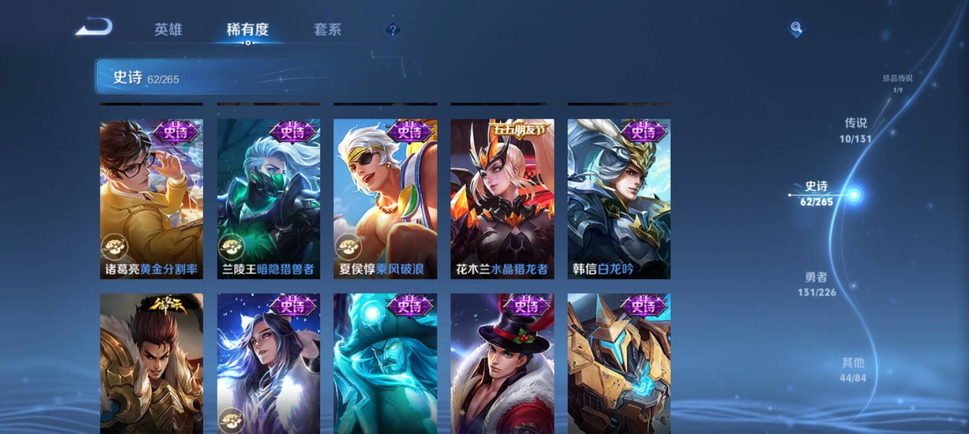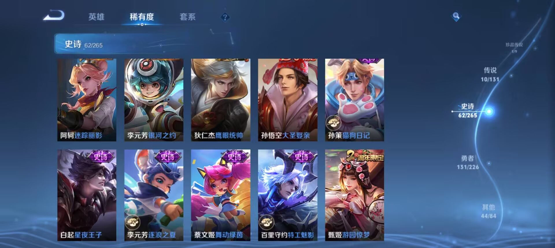 126英雄-249皮肤-珍品传说1 典藏1 传说10 史诗62 限定83 英雄126 皮肤249 稀有英雄9 贵族0级 总场次7580 皮肤价值: 【珍品传说1】 马可波罗怪盗基德 【荣耀典藏1】 韩信弑呛猎影 【传说皮肤10】 后羿神树通天 达摩黄金狮子座 司空震愿照山河定 澜愿照九州拓 桑启鸣野蒿 马超无双