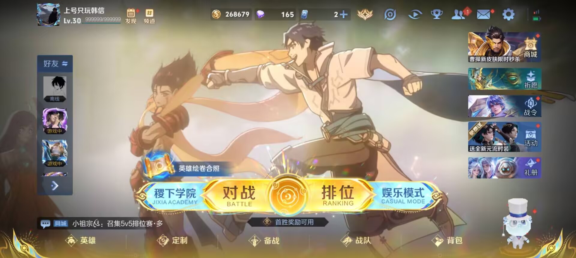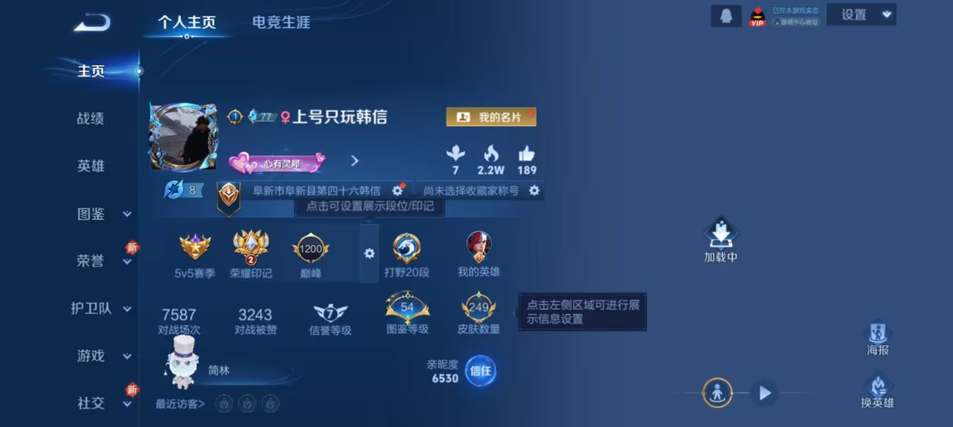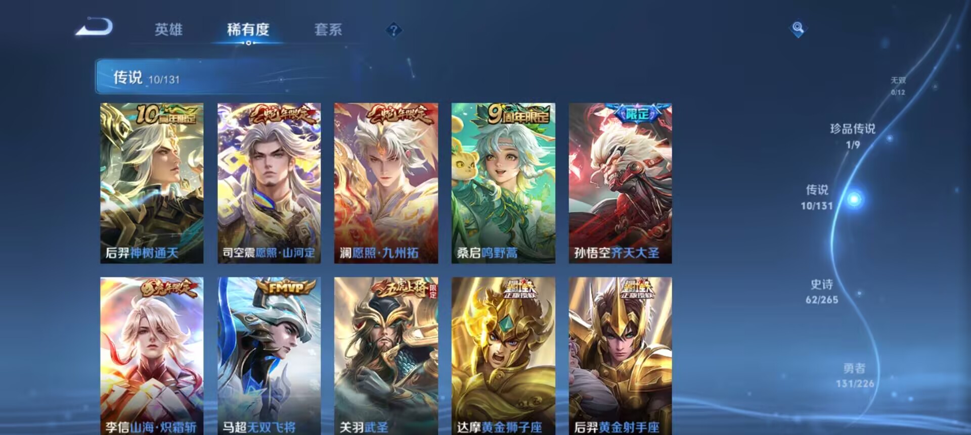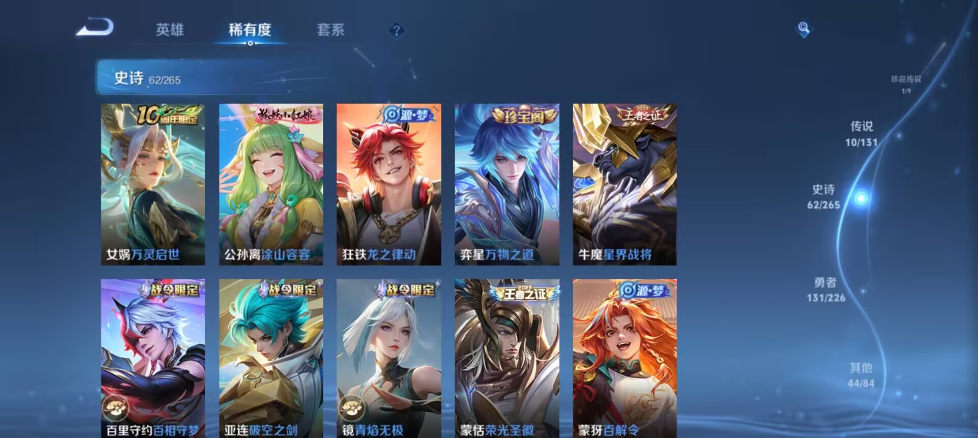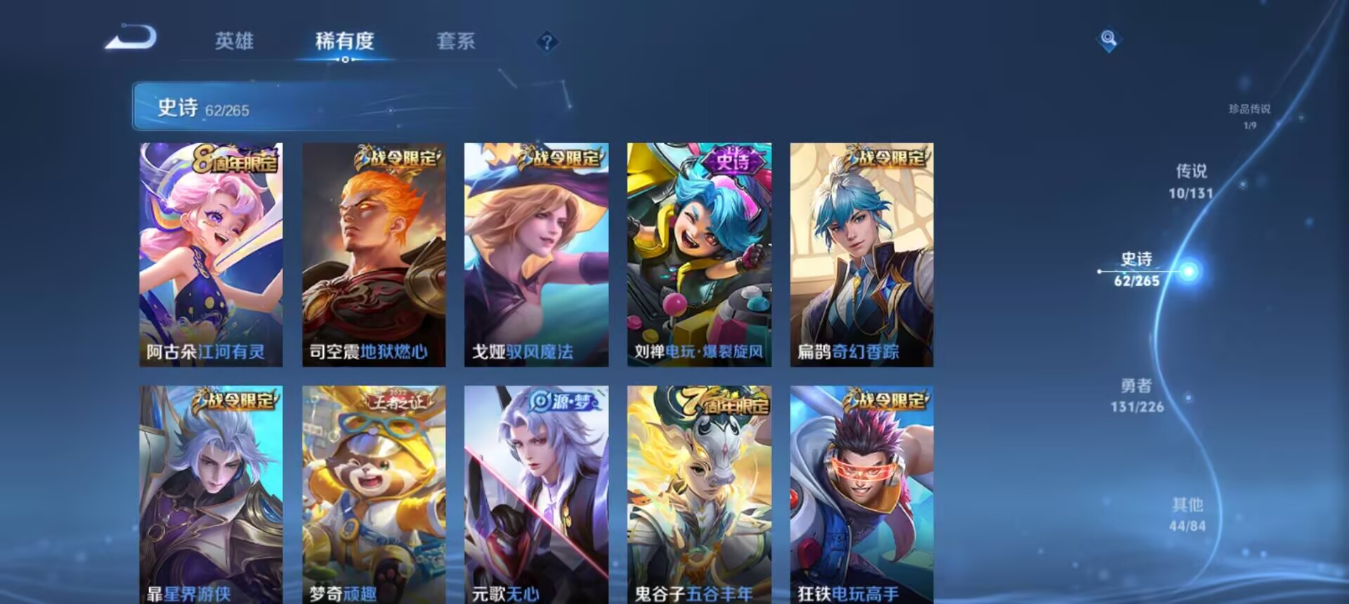 126英雄-249皮肤-珍品传说1 典藏1 传说10 史诗62 限定83 英雄126 皮肤249 稀有英雄9 贵族0级 总场次7580 皮肤价值: 【珍品传说1】 马可波罗怪盗基德 【荣耀典藏1】 韩信弑呛猎影 【传说皮肤10】 后羿神树通天 达摩黄金狮子座 司空震愿照山河定 澜愿照九州拓 桑启鸣野蒿 马超无双