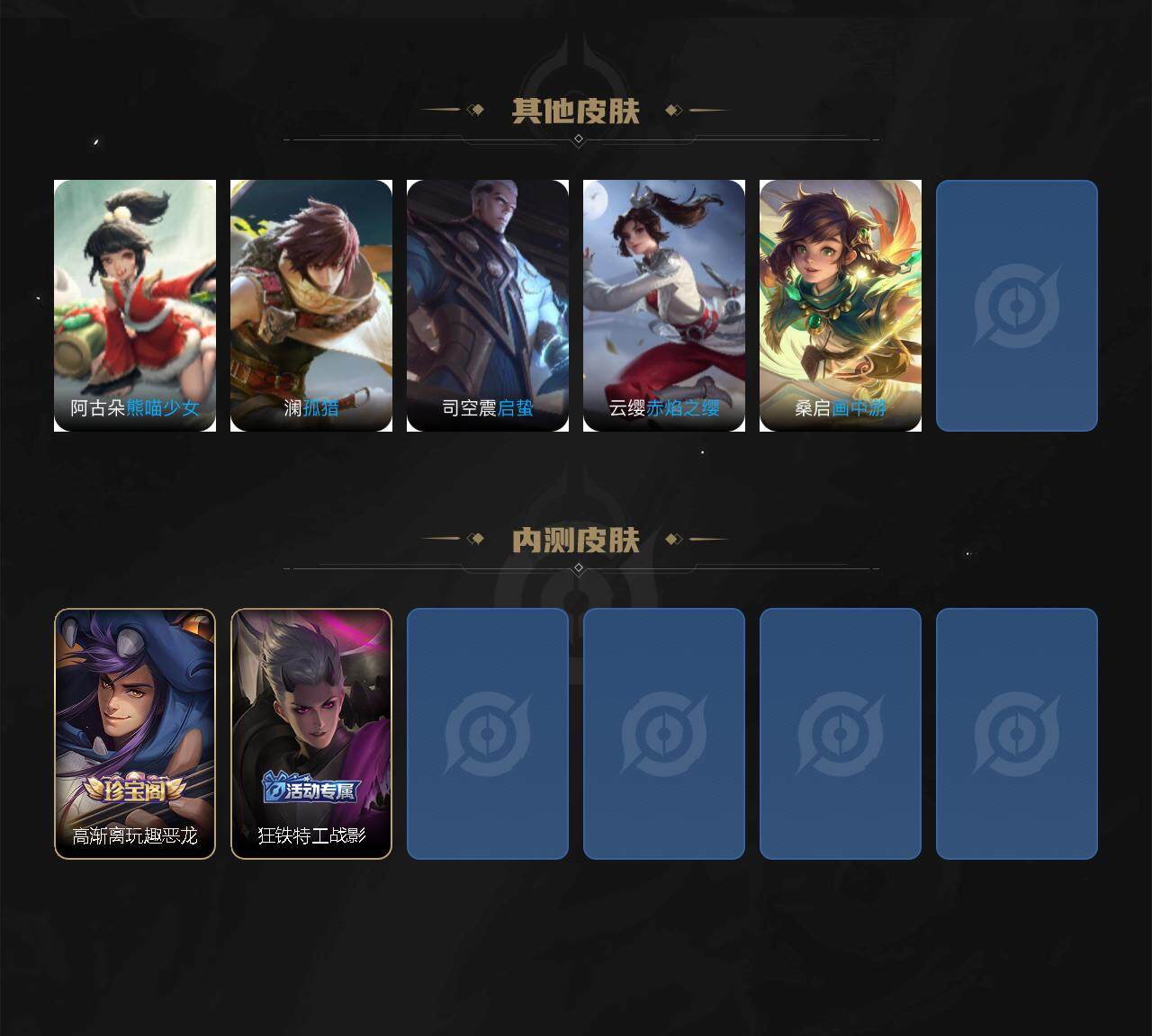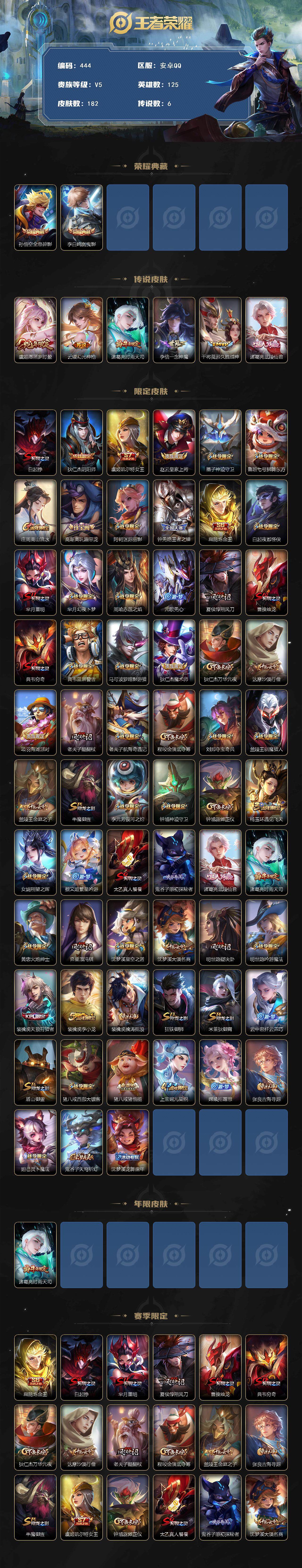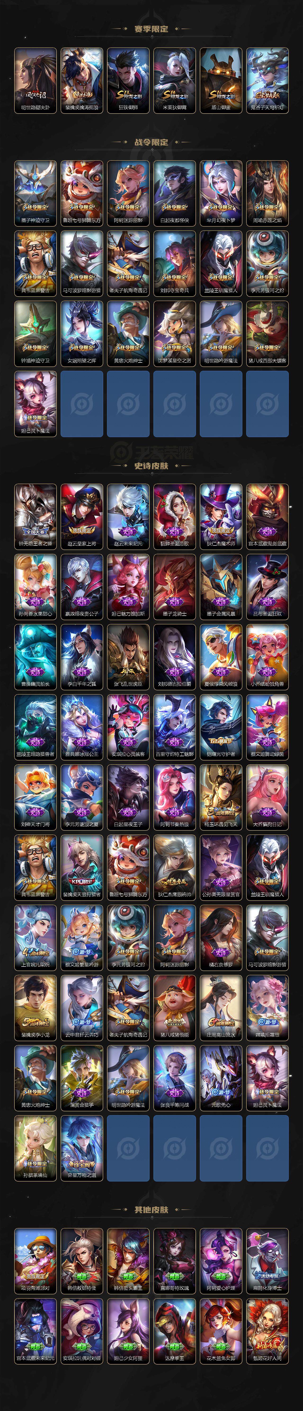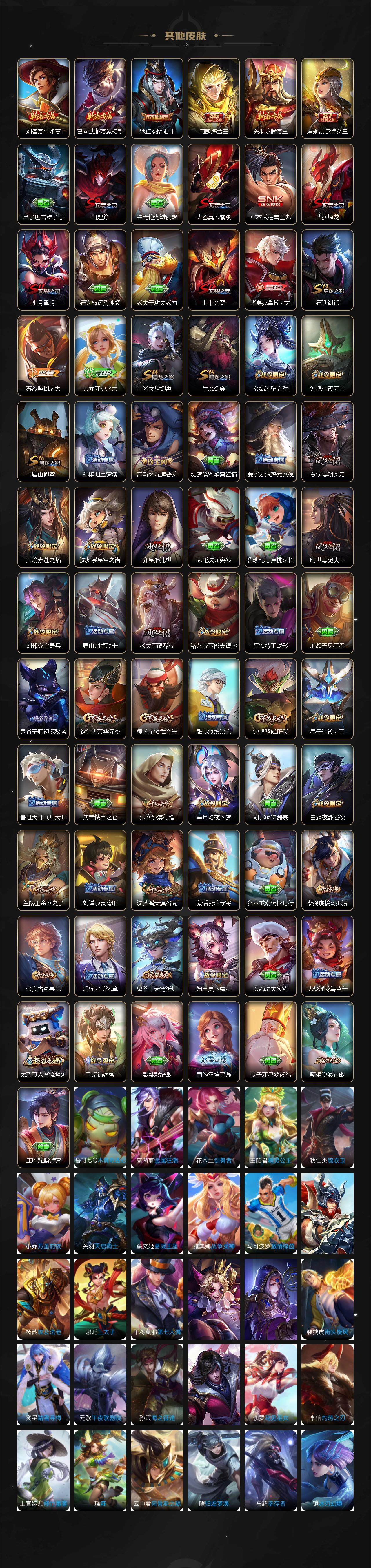 125英雄-182皮肤-贵族5/皮肤182/典藏2/传说6/史诗55/英雄125/影全皮/全息碎影 孙悟空/鸣剑·曳影 李白/愿照·岁时盈 虞姬/幻光神呛 云缨/时雨天司 诸葛亮/一念神魔 李信/久胜战神 干将莫邪/武陵仙君 诸葛亮/狰 白起/阴阳师 狄仁杰/凯尔特女王 虞姬/皇家上将 赵云/神迹守卫 墨子/狮舞东方 鲁班七号/高山流水 庄周/玩趣恶龙 高渐离/迷踪丽影 阿轲/王者之锤 钟无艳/炼金王 扁鹊/夜都怪侠