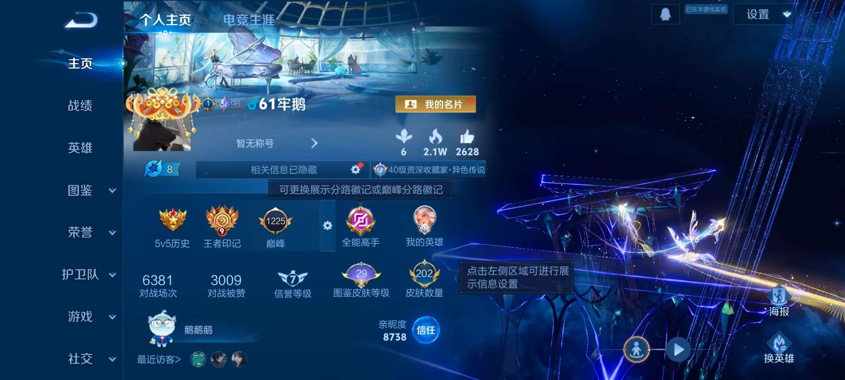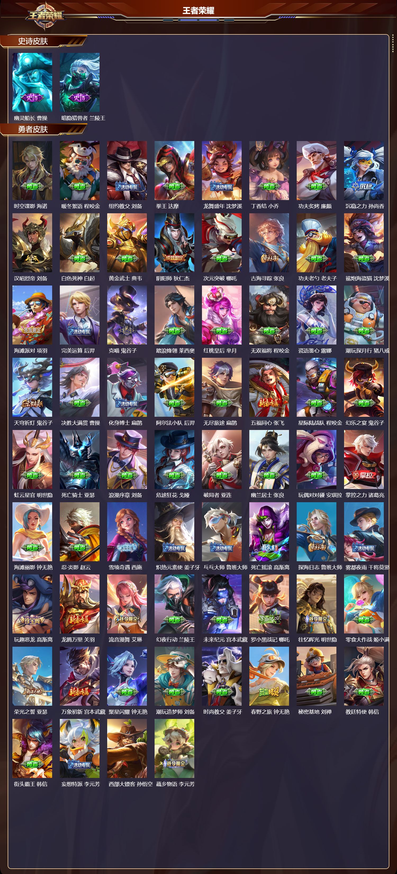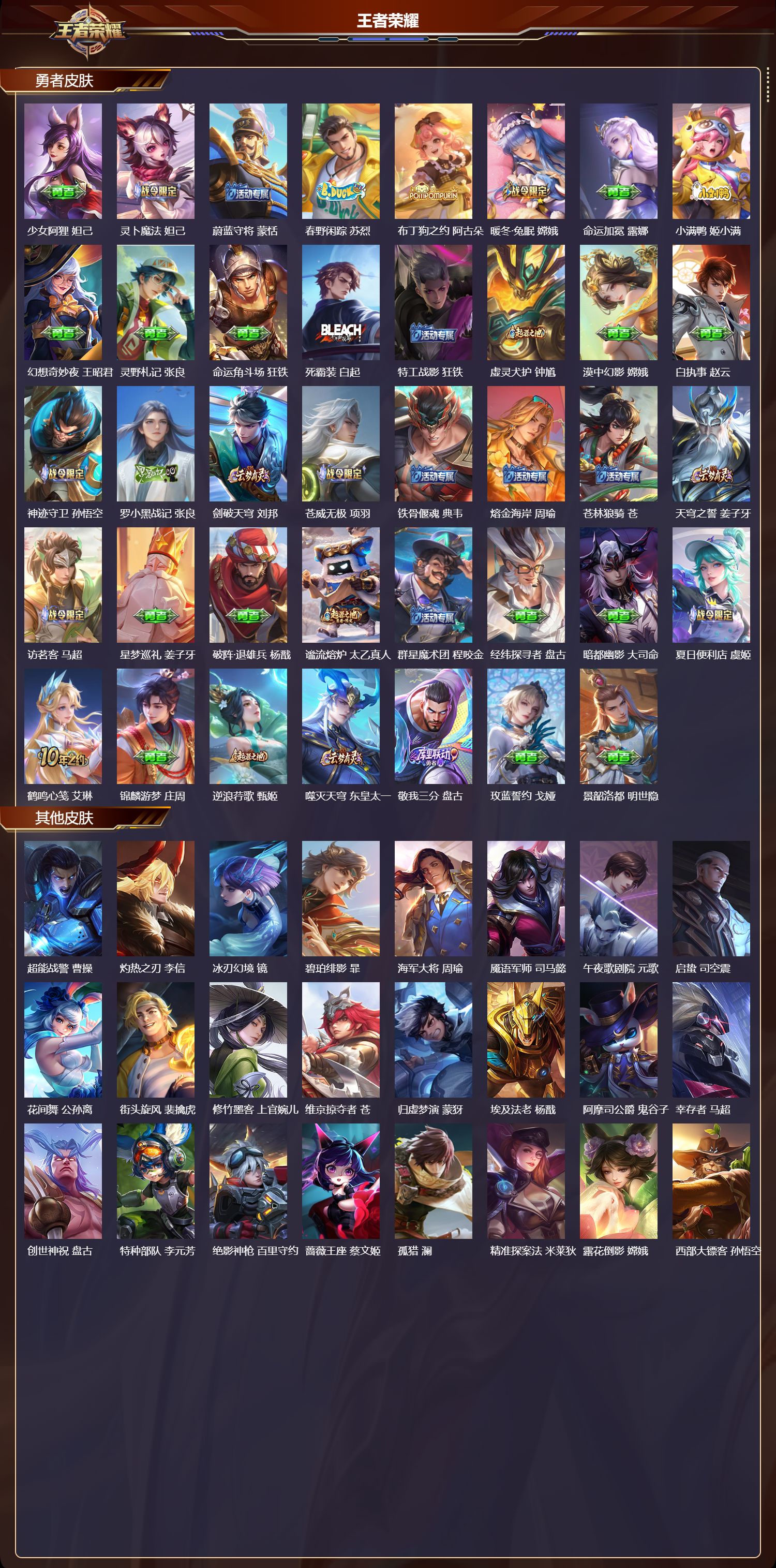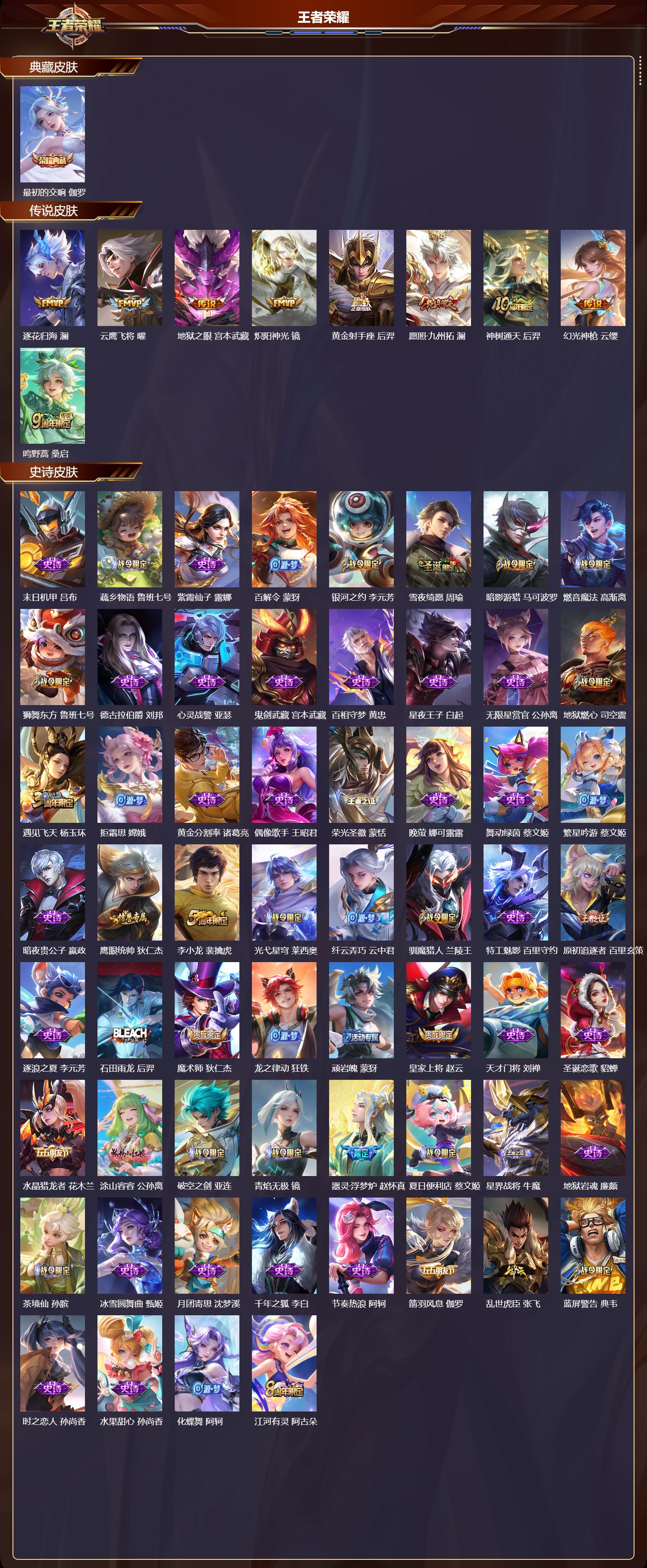 安卓qq/最强王者/202皮肤/124英雄/1典藏/0珍品无双/0无双/0珍品传说/9传说/62史诗/8稀有英雄【1 典藏皮肤】最初的交响 伽罗【9 传说皮肤】逐花归海 澜云鹰飞将 曜地狱之眼 宫本武藏炽阳神光 镜黄金射手座 后羿愿照·九州拓 澜神树通天 后羿幻光神呛 云缨鸣野蒿 桑启【62 史诗皮肤】末日机甲 吕布蔬乡物语 鲁班七号紫霞仙子 露娜百解