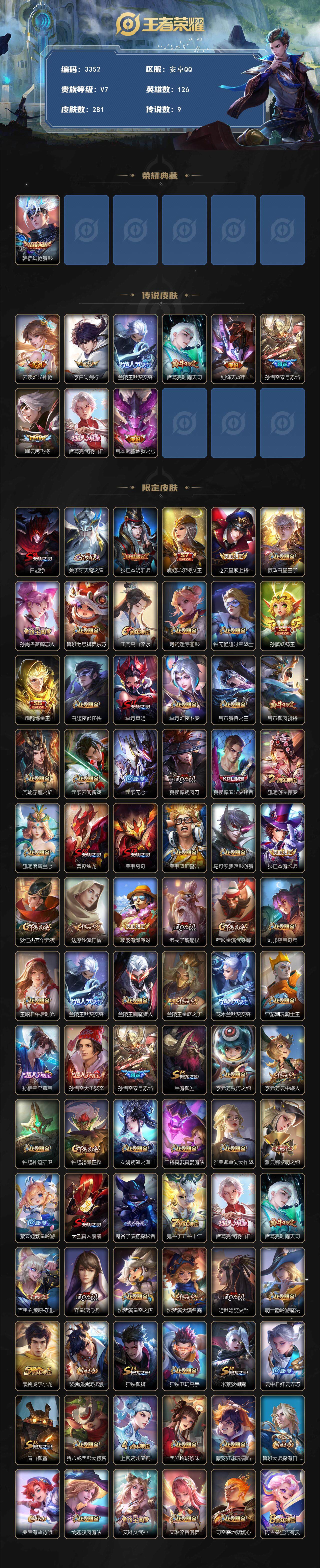 [14483470]安卓q-v6-最强王者段位-126英雄-281皮肤-1典藏皮肤-9传说-73史诗 【英雄全皮】:鬼谷子全皮,戈娅全皮,影全皮 【荣耀典藏】:韩信弑呛猎影 【传说皮肤】:云缨幻光神呛,李白诗剑行,兰陵王默契交锋,诸葛亮时雨天司,铠绛天战甲,孙悟空零号赤焰,曜云鹰飞将,诸葛亮武陵仙君,宫本武藏地狱之眼 【限定皮肤】:白起狰,姜子牙天穹之誓,狄仁杰阴阳师,虞姬凯尔特女王,赵云皇家上将,嬴政白昼王子,孙尚香蔷薇恋人,鲁班七号狮舞东方,庄周高山流水,阿轲迷踪丽影,钟无艳超时空战士,孙膑妖精王,扁鹊炼金王,白起夜都怪侠,芈月重明,芈月幻夜卜梦,吕布猎兽之王,吕布御风骁将,周瑜赤莲之焰,元歌云间偶戏,元歌无心,夏侯惇朔风刀,夏侯惇匿光决锋者,甄姬游园惊梦,甄姬落雪兰心,曹操烛龙,典韦穷奇,典韦蓝屏警告,马可波罗暗影游猎,狄仁杰魔术师,狄仁杰万华元夜,达摩沙漠行僧,项羽海滩派对,老夫子醍醐杖,程咬金演武夺筹,刘邦夺宝奇兵,王昭君午后时光,兰陵王默契交锋,兰陵王驯魔猎人,兰陵王金庭之子,花木兰默契交锋,亚瑟潮玩骑士王,孙悟空至尊宝,孙悟空大圣娶亲,孙悟空零号赤焰,牛魔御旌,李元芳银河之约,李元芳云中旅人,钟馗神迹守卫,钟馗驱傩正仪,女娲朔望之晖,干将莫邪真爱魔法,雅典娜单词大作战,雅典娜黎明之约,蔡文姬繁星吟游,太乙真人饕餮,鬼谷子原初探秘者,鬼谷子五谷丰年,诸葛亮武陵仙君,诸葛亮时雨天司,百里玄策原初追逐者,弈星混沌棋,沈梦溪星空之诺,沈梦溪大漠名商,明世隐疑决卦,明世隐吟游魔法,裴擒虎李小龙,裴擒虎擒涛扼浪,狂铁御狮,狂铁电玩高手,米莱狄御霄,云中君纤云弄巧,盾山御銮,猪八戒西部大镖客,上官婉儿梁祝,西施玲珑珍味,蒙犽狂想玩偶喵,鲁班大师探海日志,桑启海盐诗旅,戈娅驭风魔法,艾琳女武神,艾琳流音漫舞,司空震地狱燃心,阿古朵江河有灵,张良古海寻踪,鬼谷子天穹祈灯,沈梦溪龙舞盛年,刘邦剑破天穹,程咬金群星魔术团,周瑜熔金海岸 【年限皮肤】:吕布御风骁将,诸葛亮时雨天司 【赛季限定】:孙膑妖精王,扁鹊炼金王,白起狰,芈月重明,夏侯惇朔风刀,曹操烛龙,典韦穷奇,狄仁杰万华元夜,达摩沙漠行僧,老夫子醍醐杖,程咬金演武夺筹,兰陵王金庭之子,张良古海寻踪,牛魔御旌,李元芳云中旅人,虞姬凯尔特女王,钟馗驱傩正仪,雅典娜黎明之约,太乙真人饕餮,鬼谷子原初探秘者,百里玄策原初追逐者,弈星混沌棋,沈