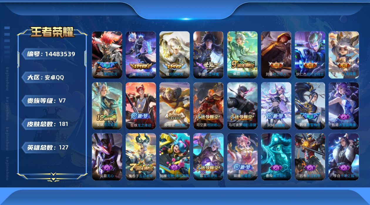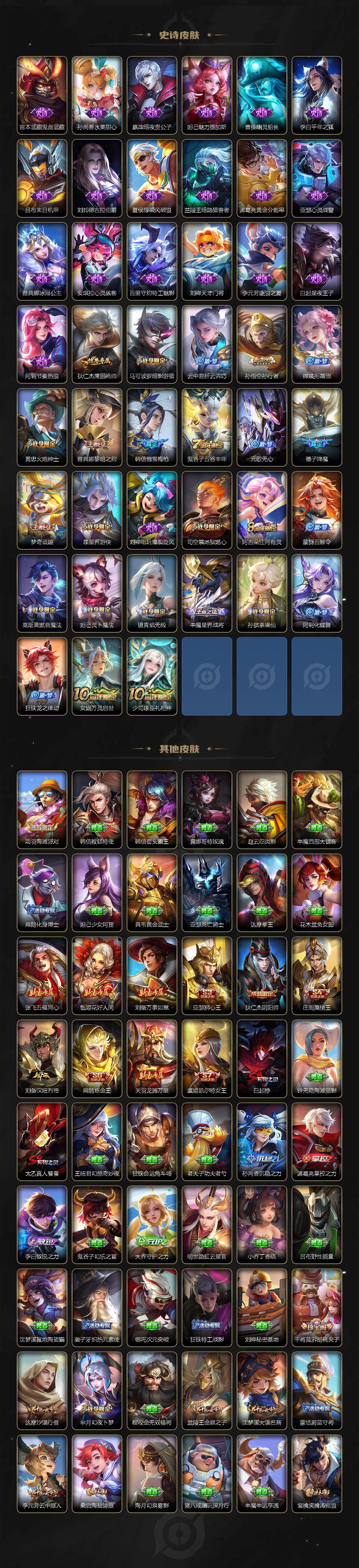 [14483539]安卓q-v7-最强王者段位-127英雄-181皮肤-9传说-50史诗 【传说皮肤】:后羿神树通天,桑启鸣野蒿,马超琥珀纪元,澜逐花归海,李元芳飞鸢探春,镜炽阳神光,李信一念神魔,刘备时之恋人,狄仁杰超时空战士 【限定皮肤】:白起狰,姜子牙天穹之誓,狄仁杰阴阳师,虞姬凯尔特女王,赵云皇家上将,墨子降魔,庄周蜃楼王,扁鹊炼金王,芈月幻夜卜梦,元歌无心,马可波罗暗影游猎,狄仁杰魔术师,达摩沙漠行僧,项羽海滩派对,韩信傲雪梅呛,兰陵王金庭之子,亚瑟狮心王,孙悟空孙行者,李元芳云中旅人,干将莫邪胡桃夹子,雅典娜黎明之约,太乙真人饕餮,鬼谷子五谷丰年,黄忠火炮绅士,梦奇顽趣,沈梦溪大漠名商,裴擒虎擒涛扼浪,云中君纤云弄巧,嫦娥拒霜思,鲁班大师探海日志,桑启海盐诗旅,暃星界游侠,艾琳流音漫舞,司空震地狱燃心,阿古朵江河有灵,张良古海寻踪,蒙犽百解令,高渐离燃音魔法,妲己灵卜魔法,鬼谷子天穹祈灯,马超琥珀纪元,沈梦溪龙舞盛年,刘邦剑破天穹,镜青焰无极,项羽苍威无极,周瑜熔金海岸 【赛季限定】:庄周蜃楼王,扁鹊炼金王,白起狰,达摩沙漠行僧,兰陵王金庭之子,张良古海寻踪,亚瑟狮心王,李元芳云中旅人,虞姬凯尔特女王,雅典娜黎明之约,太乙真人饕餮,梦奇顽趣,沈梦溪大漠名商,裴擒虎擒涛扼浪,鲁班大师探海日志,桑启海盐诗旅,鬼谷子天穹祈灯,刘邦剑破天穹,姜子牙天穹之誓 【战令限定】:芈月幻夜卜梦,马可波罗暗影游猎,艾琳流音漫舞,黄忠火炮绅士,司空震地狱燃心,暃星界游侠,高渐离燃音魔法,妲己灵卜魔法,镜青焰无极,项羽苍威无极 【史诗皮肤】:赵云皇家上将,貂蝉圣诞恋歌,甄姬冰雪圆舞曲,王昭君偶像歌手,狄仁杰魔术师,廉颇地狱岩魂,宫本武藏鬼剑武藏,孙尚香水果甜心,嬴政暗夜贵公子,妲己魅力维加斯,曹操幽灵船长,李白千年之狐,吕布末日机甲,刘邦德古拉伯爵,夏侯惇乘风破浪,兰陵王暗隐猎兽者,诸葛亮黄金分割率,亚瑟心灵战警,雅典娜冰冠公主,安琪拉心灵骇客,百里守约特工魅影,刘禅天才门将,李元芳逐浪之夏,白起星夜王子,阿轲节奏热浪,狄仁杰鹰眼统帅,马可波罗暗影游猎,云中君纤云弄巧,孙悟空孙行者,嫦娥拒霜思,黄忠火炮绅士,雅典娜黎明之约,韩信傲雪梅呛,鬼谷子五谷丰年,元歌无心,墨子降魔,梦奇顽趣,暃星界游侠,刘禅电玩爆裂旋风,司空震地狱燃心,阿古朵江河有灵,蒙犽百解令,妲己灵卜魔法,高渐离燃音魔法,镜青焰无极
