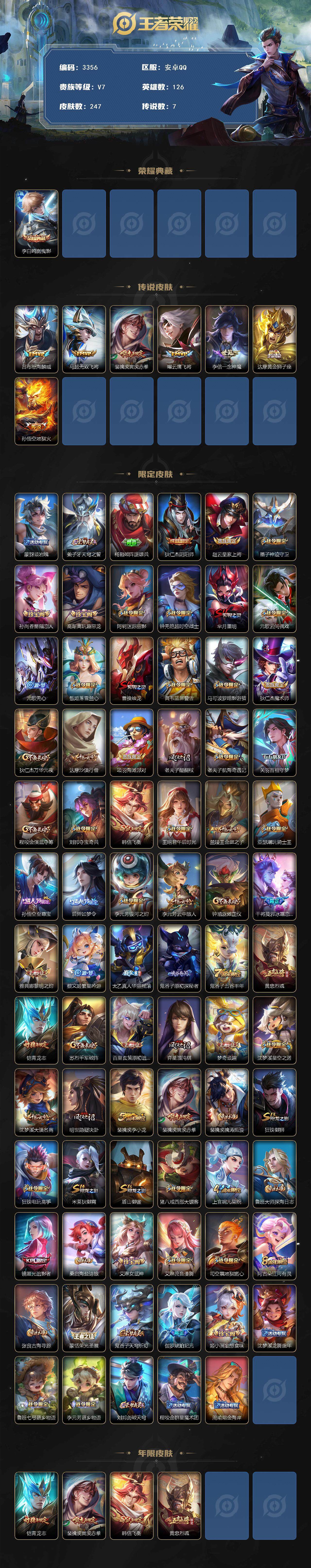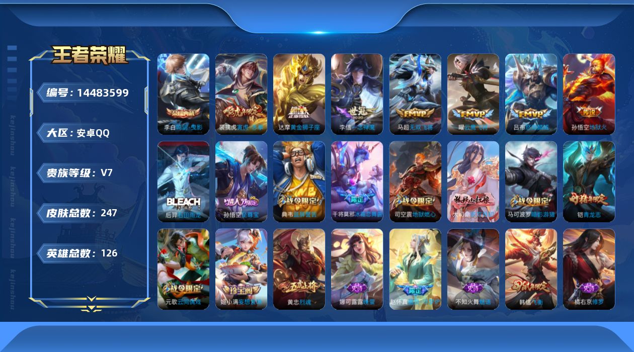 [14483599]安卓q-v0-荣耀黄金i段位-126英雄-247皮肤-1典藏皮肤-7传说-78史诗 【英雄全皮】:蒙恬全皮 【荣耀典藏】:李白鸣剑曳影 【传说皮肤】:吕布怒海麟威,马超无双飞将,裴擒虎寅虎赤拳,曜云鹰飞将,李信一念神魔,达摩黄金狮子座,孙悟空地狱火 【限定皮肤】:蒙犽顽岩魄,姜子牙天穹之誓,杨戬破阵退雄兵,狄仁杰阴阳师,赵云皇家上将,墨子神迹守卫,孙尚香蔷薇恋人,高渐离玩趣恶龙,阿轲迷踪丽影,钟无艳超时空战士,芈月重明,元歌云间偶戏,元歌无心,甄姬落雪兰心,曹操烛龙,典韦蓝屏警告,马可波罗暗影游猎,狄仁杰魔术师,狄仁杰万华元夜,达摩沙漠行僧,项羽海滩派对,老夫子醍醐杖,老夫子航海奇遇记,关羽百相守梦,程咬金演武夺筹,刘邦夺宝奇兵,韩信飞衡,王昭君午后时光,兰陵王金庭之子,亚瑟潮玩骑士王,孙悟空至尊宝,后羿如梦令,李元芳银河之约,李元芳云中旅人,钟馗驱傩正仪,干将莫邪冰霜恋舞曲,雅典娜黎明之约,蔡文姬繁星吟游,太乙真人华丽摇滚,鬼谷子原初探秘者,鬼谷子五谷丰年,黄忠烈魂,铠青龙志,苏烈千军破阵,百里玄策原初追逐者,弈星混沌棋,梦奇顽趣,沈梦溪星空之诺,沈梦溪大漠名商,明世隐疑决卦,裴擒虎李小龙,裴擒虎寅虎赤拳,裴擒虎擒涛扼浪,狂铁御狮,狂铁电玩高手,米莱狄御霄,盾山御銮,猪八戒西部大镖客,上官婉儿梁祝,鲁班大师探海日志,镜匿光追影者,桑启海盐诗旅,艾琳女武神,艾琳流音漫舞,司空震地狱燃心,阿古朵江河有灵,张良古海寻踪,蒙恬荣光圣徽,鬼谷子天穹祈灯,伽罗琥珀纪元,姬小满妄想食味,沈梦溪龙舞盛年,鲁班七号蔬乡物语,李元芳蔬乡物语,刘邦剑破天穹,程咬金群星魔术团,周瑜熔金海岸 【年限皮肤】:铠青龙志,裴擒虎寅虎赤拳,韩信飞衡,黄忠烈魂 【赛季限定】:芈月重明,曹操烛龙,狄仁杰万华元夜,达摩沙漠行僧,老夫子醍醐杖,程咬金演武夺筹,兰陵王金庭之子,张良古海寻踪,李元芳云中旅人,钟馗驱傩正仪,雅典娜黎明之约,鬼谷子原初探秘者,苏烈千军破阵,百里玄策原初追逐者,弈星混沌棋,梦奇顽趣,沈梦溪大漠名商,明世隐疑决卦,裴擒虎擒涛扼浪,狂铁御狮,米莱狄御霄,盾山御銮,鲁班大师探海日志,桑启海盐诗旅,鬼谷子天穹祈灯,蒙恬荣光圣徽,刘邦剑破天穹,姜子牙天穹之誓 【战令限定】:墨子神迹守卫,阿轲迷踪丽影,钟无艳超时空战士,元歌云间偶戏,甄姬落雪兰心,典韦蓝屏警告,马可波罗暗影游猎,老夫子航海奇