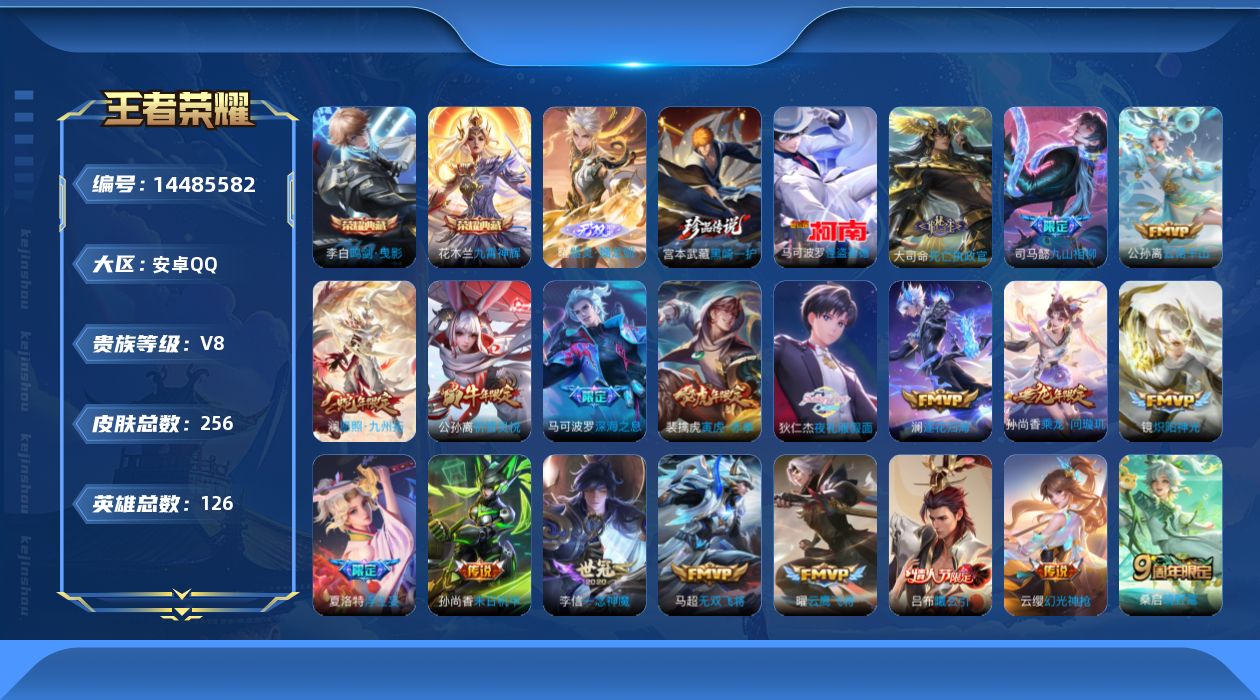 [14485582]v8 2典藏 1无双 2珍品传说 31传说 126英雄 256皮肤 可修改实名 【英雄全皮】:狄仁杰全皮蒙恬全皮敖隐全皮戈娅全皮司马懿全皮影全皮 【稀有英雄】:敖隐小龙人大司命韩信韩跳跳夏洛特夏师傅艾琳橘右京橘子娜可露露鸟人不知火舞赵云金蝉唐僧戈娅 【荣耀水晶】:鸣剑·曳影九霄神辉木兰典藏 【无双皮】:器灵·螭龙剑 【珍品传说】:怪盗基德黑崎一护 【传说皮】:乘龙·问璇玑孙尚香年限吕布曦玄引云诺千山死亡执政官幻光神呛九山相柳黄金射手座零号·赤焰地狱火末日机甲-孙尚香绿蚂蚱云霓雀翎一念神魔久胜战神云鹰飞将小将军炽阳神光无双飞将胖达荣荣时之恋人-刘备电焊工飞鸢探春超时空战士-狄仁杰神器·狴犴令浮生妄夜礼服假面澜逐花归海 【珍宝阁皮】:万物之道女武神 【赛季/战令皮】:噬灭天穹s37古海寻踪s33擒涛扼浪s31探海日志s32驭风魔法玲珑珍味剑破天穹s35天穹祈灯s34青焰无极苍威无极天穹之誓s36醍醐杖s20原初探秘者s21万华元夜s22演武夺筹s23驱傩正仪s24朔望之晖狮舞东方西部大镖客-猪八戒暗影游猎游乐娃子单词大作战狂想玩偶喵潮玩骑士王云间偶戏星际陆战队-达摩胡桃异想国 【史诗皮】:器灵·浮梦炉绮世丹青化蝶舞鸭鸭历险记-刘禅龙之律动乘龙·聚宝船安琪拉年限石田雨龙百相守梦-黄忠乘龙·忆丹青大乔年限超元猎域织梦人茶境仙星界战将百相守梦-百里守约谪仙醉月撼地雄心破空之剑蔬乡物语鲁班七号涂山容容光弋星穹万灵启世遇见神鹿紫霞仙子电玩小子小书包特工魅影千年之狐匿光侦查者高渐离燃音魔法蒙恬荣光圣徽冰冠公主青蛇乱世虎臣节奏热浪女仆咖啡水果甜心星夜王子德古拉伯爵暗隐猎兽者鬼剑武藏暗渊魔法心灵战警乐园奇幻夜天秀·启明舞动绿茵纤云弄巧拒霜思缤纷独角兽水晶猎龙者曙光守护者金属风暴原初追逐者圣诞狂欢圣诞恋歌鹰眼统帅暗夜贵公子魅力维加斯未来纪元-赵云 【限定皮】:愿照·九州拓澜年限逐霄战戟鸣野蒿至尊宝怒海麟威逐梦之星烈魂天