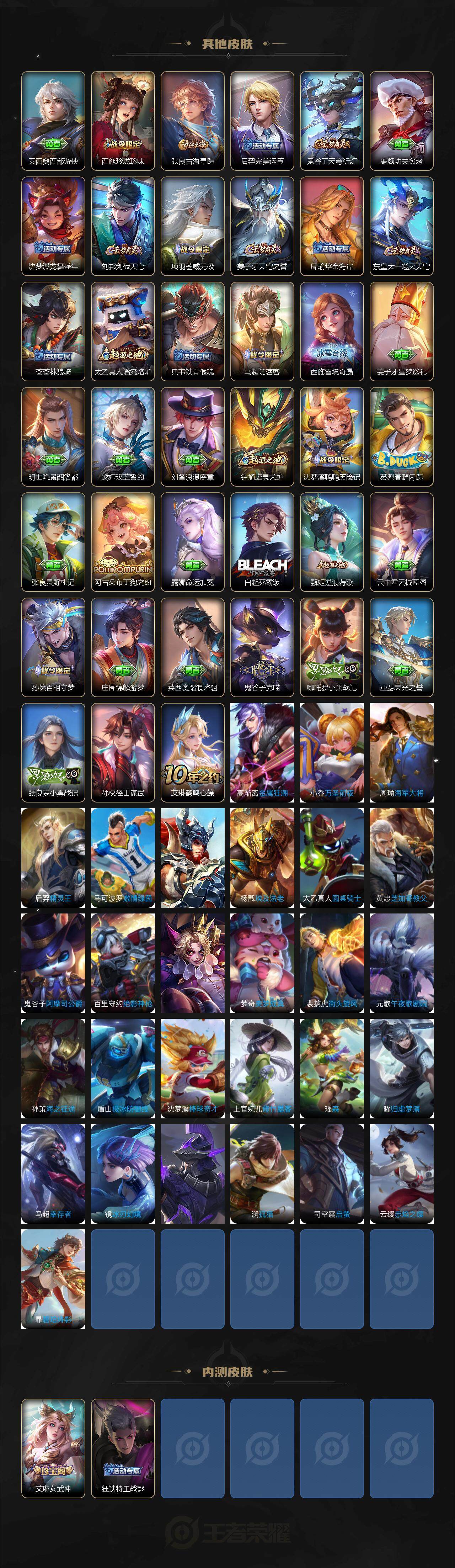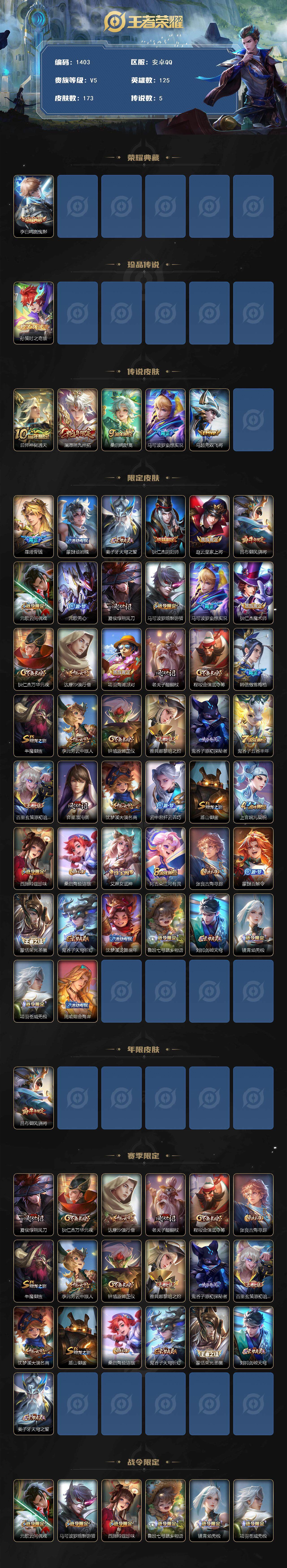 125英雄-173皮肤-贵族5/皮肤173/典藏1/传说5/史诗51/英雄125/孙权全皮/鬼谷子全皮/蒙恬全皮/鸣剑·曳影 李白/时之奇旅 孙策/神树通天 后羿/愿照·九州拓 澜/鸣野蒿 桑启/妄想实况 马可波罗/无双飞将 马超/埋骨钱 暃/顽岩魄 蒙犽/天穹之誓 姜子牙/阴阳师 狄仁杰/皇家上将 赵云/御风骁将 吕布/云间偶戏 元歌/无心 元歌/朔风刀 夏侯惇/暗影游猎 马可波罗/魔术师 狄仁杰/万华元夜 狄仁杰