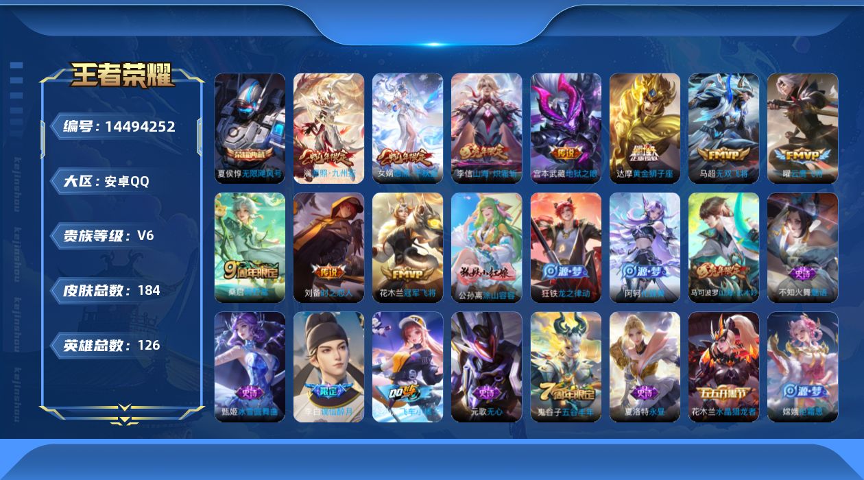 v6 1典藏 10传说 126英雄 184皮肤 可修改实名 【英雄全皮】:敖隐全皮影全皮 【稀有英雄】:敖隐小龙人大司命韩信韩跳跳夏洛特夏师傅艾琳橘右京橘子娜可露露鸟人不知火舞赵云金蝉唐僧戈娅 【荣耀水晶】:无限飓风号高达 【传说皮】:山海·炽霜斩