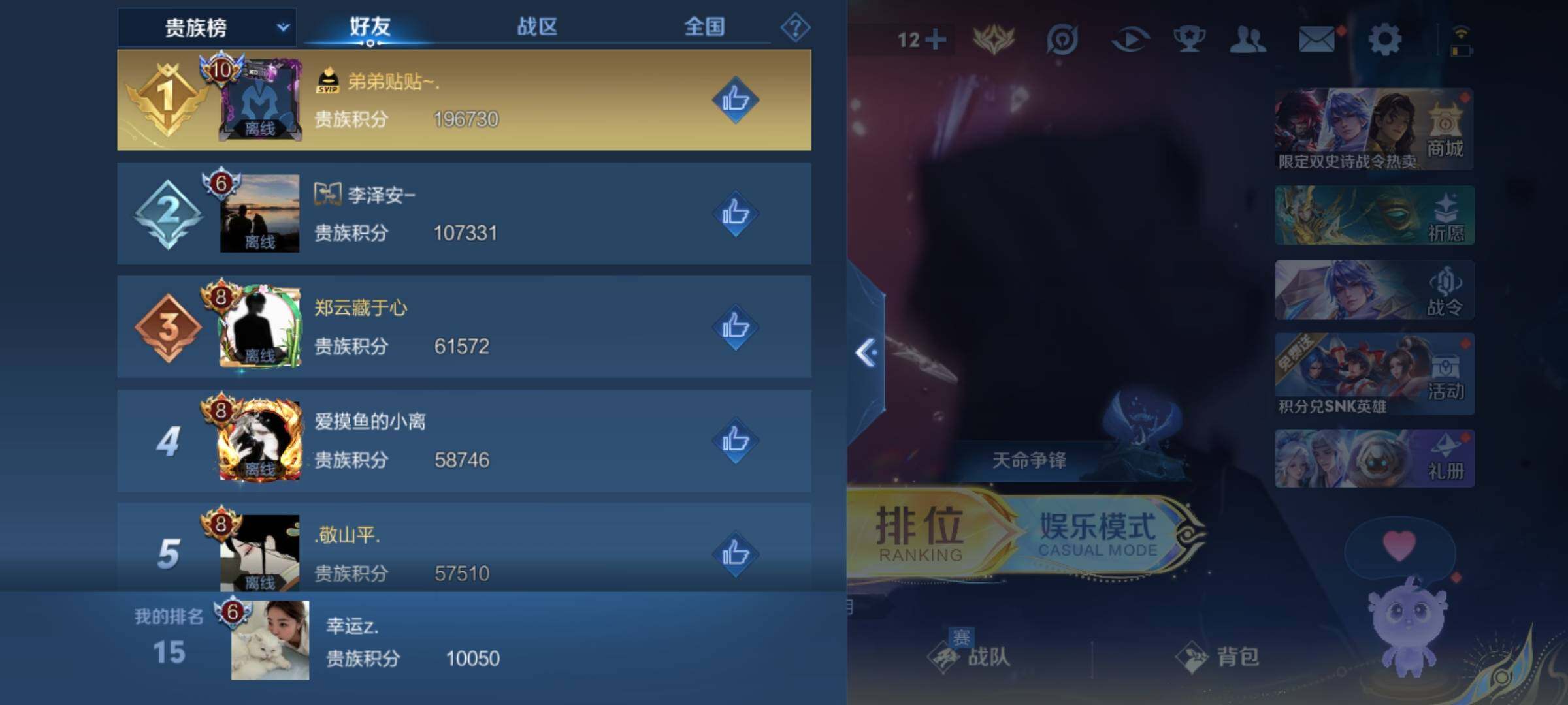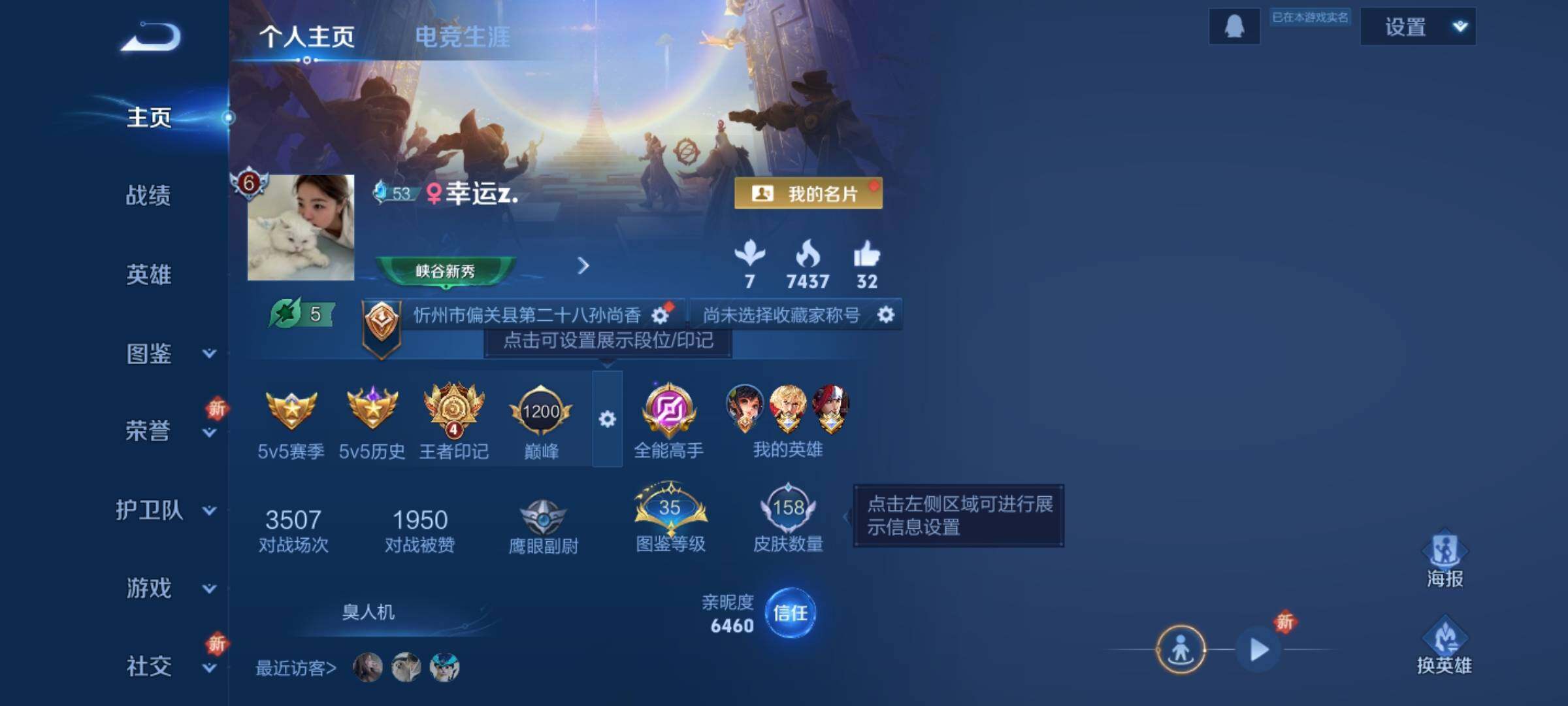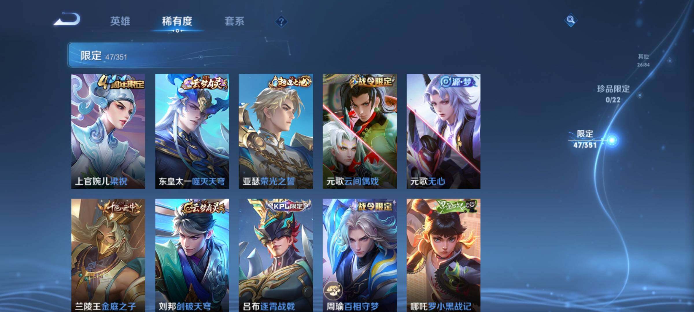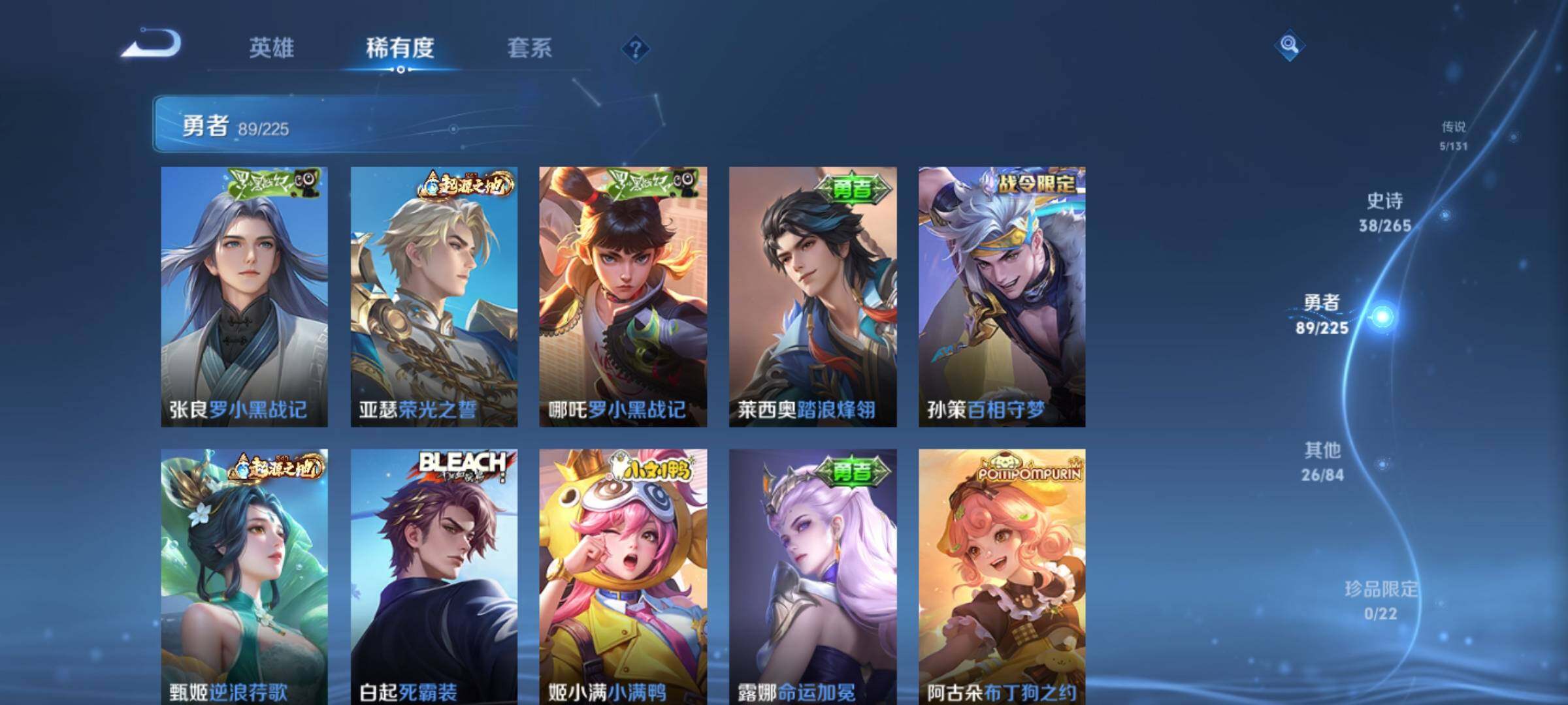 _2294966-q-v6-最强王者段位-124英雄-158皮肤5传说-38史诗 【传说皮肤】:妲己愿照众生和,澜愿照九州拓,桑启鸣野蒿,李信一念神魔,花木兰冠军飞将 【限定皮肤】:姜子牙天穹之誓,狄仁杰阴阳师,赵云皇家上将,元歌云间偶戏,元歌无心,马可波罗山海玄木吟,狄仁杰魔术师,达摩沙漠行僧,项羽海滩派对,兰陵王金庭之子,李元芳云中旅人,干将莫邪胡桃夹子,鬼谷子五谷丰年,沈梦溪大漠名商,裴擒虎擒涛扼浪,上官婉儿梁祝,鲁班大师探海日志,桑启海盐诗旅,阿古朵江河有灵,张良古海寻踪,鬼谷子天穹祈灯,沈梦溪龙舞盛年,刘邦剑破天穹,程咬金群星魔术团,项羽苍威无极,周瑜熔金海岸 【年限皮肤】:马可波罗山海玄木吟 【赛季限定】:达摩沙漠行僧,兰陵王金庭之子,张良古海寻踪,李元芳云中旅人,沈梦溪大漠名商,裴擒虎擒涛扼浪,鲁班大师探海日志,桑启海盐诗旅,鬼谷子天穹祈灯,刘邦剑破天穹,姜子牙天穹之誓 【战令限定】:元歌云间偶戏,项羽苍威无极 【史诗皮肤】:赵云皇家上将,赵云未来纪元,貂蝉圣诞恋歌,甄姬冰雪圆舞曲,王昭君偶像歌手,狄仁杰魔术师,宫本武藏鬼剑武藏,孙尚香水果甜心,妲己魅力维加斯,妲己女仆咖啡,墨子金属风暴,刘禅绅士熊喵,吕布末日机甲,小乔缤纷独角兽,兰陵王暗隐猎兽者,亚瑟心灵战警,安琪拉心灵骇客,百里守约特工魅影,李元芳逐浪之夏,白起星夜王子,阿轲节奏热浪,孙策猫狗日记,狄仁杰鹰眼统帅,上官婉儿梁祝,橘右京修罗,孙尚香时之恋人,元歌云间偶戏,鬼谷子五谷丰年,元歌无心,马可波罗山海玄木吟,阿古朵江河有灵,孙膑茶境仙,赵怀真器灵浮梦炉,阿轲化蝶舞,狂铁龙之律动,扁鹊灵蛊蚀心,周瑜百相守梦,女娲万灵启世 【其他皮肤】:项羽海滩派对,韩信教廷特使,韩信街头霸王,露娜哥特玫瑰,赵云白执事,赵云忍炎影,程咬金星际陆战队,武则天东方不败,扁鹊化身博士,宫本武藏未来纪元,安琪拉玩偶对对碰,妲己少女阿狸,典韦黄金武士,亚瑟死亡骑士,花木兰兔女郎,张飞五福同心,甄姬花好人间,刘备万事如意,狄仁杰阴阳师,刘备纽约教父,刘备汉昭烈帝,关羽龙腾万里,钟无艳海滩丽影,老夫子功夫老勺,孙尚香沉稳之力,诸葛亮掌控之力,大乔守护之力,明世隐虹云星官,吕布野性能量,孙膑归虚梦演,哪吒次元突破,狂铁特工战影,刘禅秘密基地,杨戬次元傲视,鲁班大师乓乓大师,妲己紫罗兰之誓,干将莫邪胡桃夹子,达摩沙漠行僧,兰陵王金庭之子