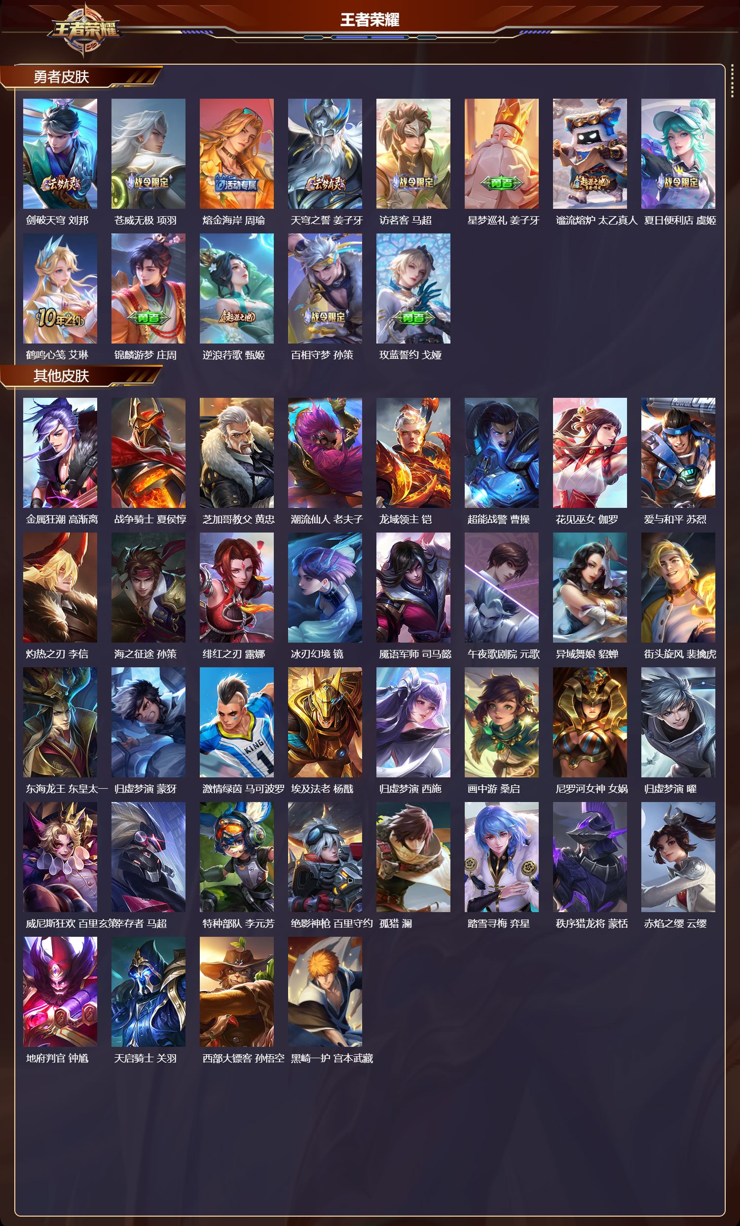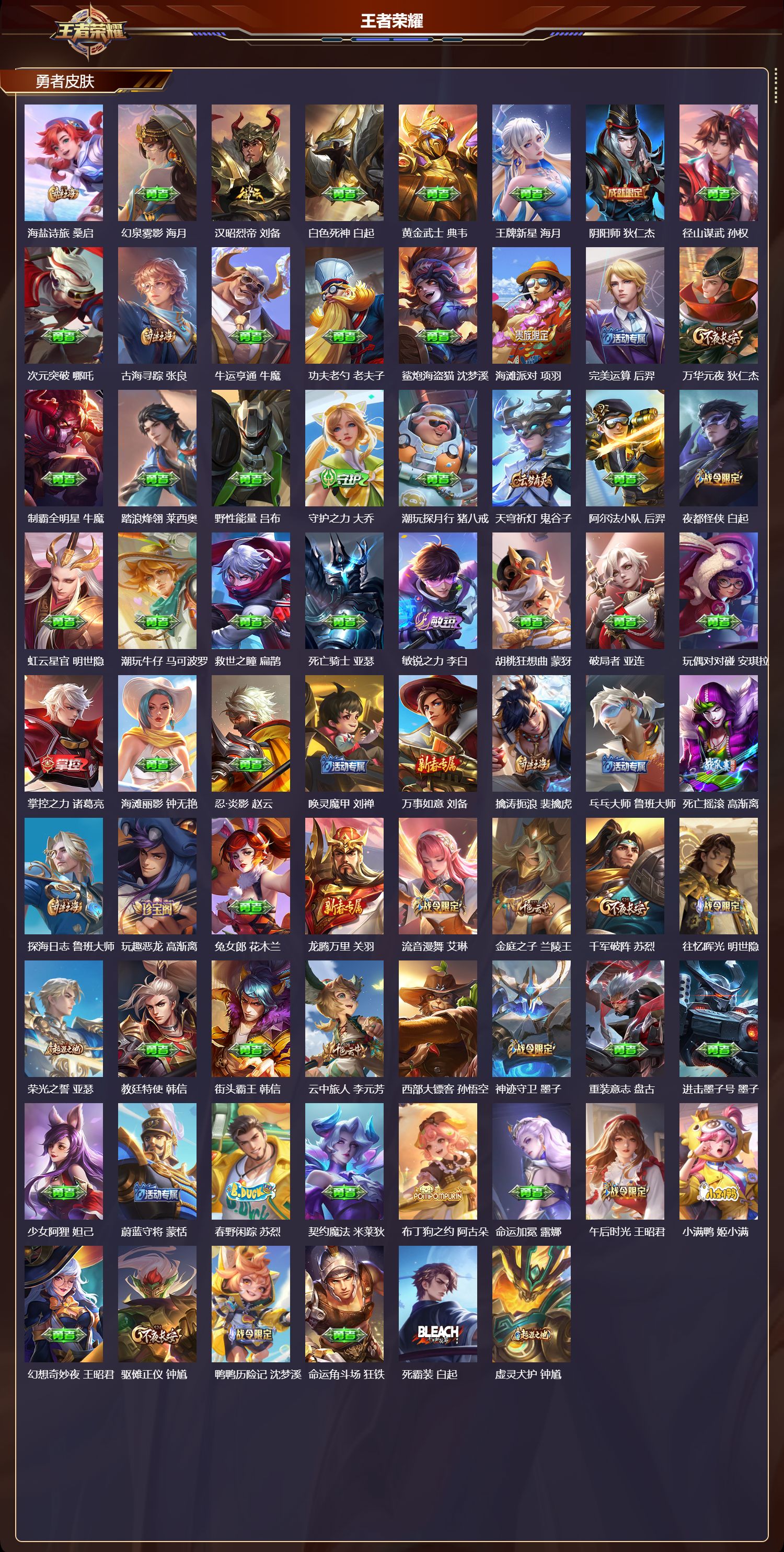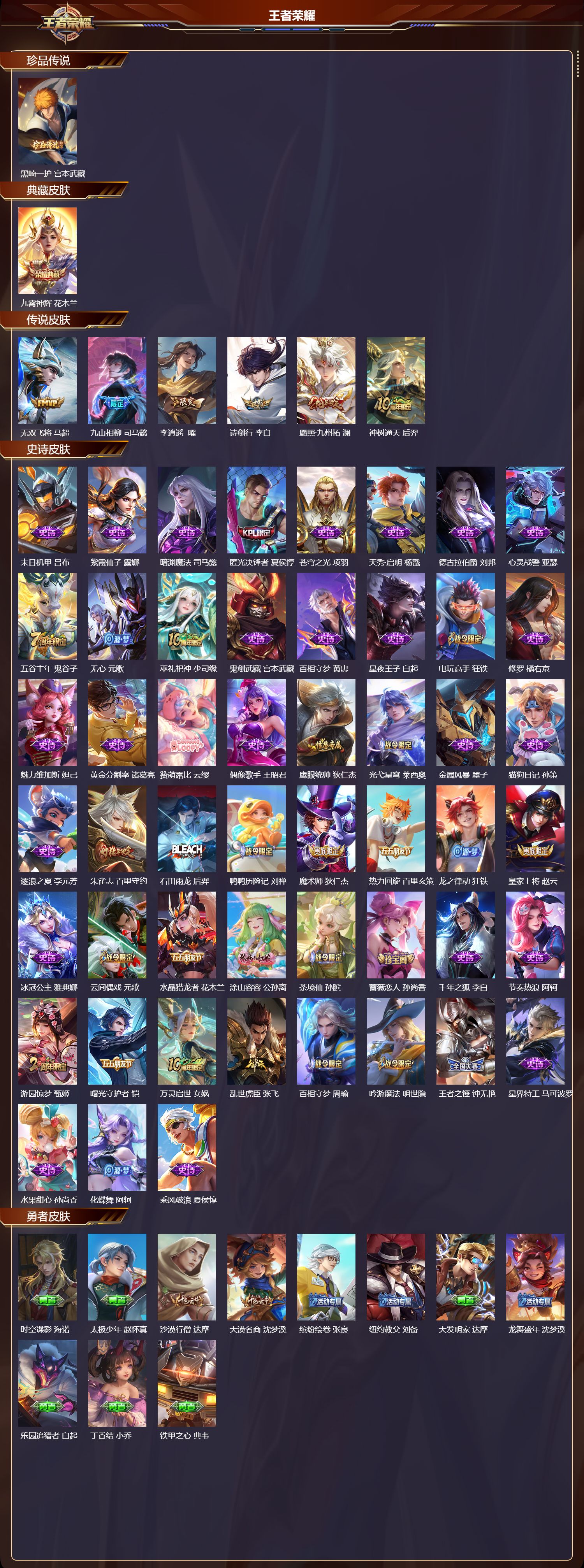 安卓qq/非凡王者/188皮肤/125英雄/1典藏/0珍品无双/0无双/1珍品传说/6传说/51史诗/7稀有英雄【1 珍品传说】黑崎一护 宫本武藏【1 典藏皮肤】九霄神辉 花木兰【6 传说皮肤】无双飞将 马超九山相柳 司马懿李 曜诗剑行 李白愿照·九州拓 澜神树通天 后羿【51 史诗皮肤】末日机甲 吕布紫霞仙子 露娜暗渊魔法 司马懿匿光决锋者 夏侯惇苍穹之光 项羽天