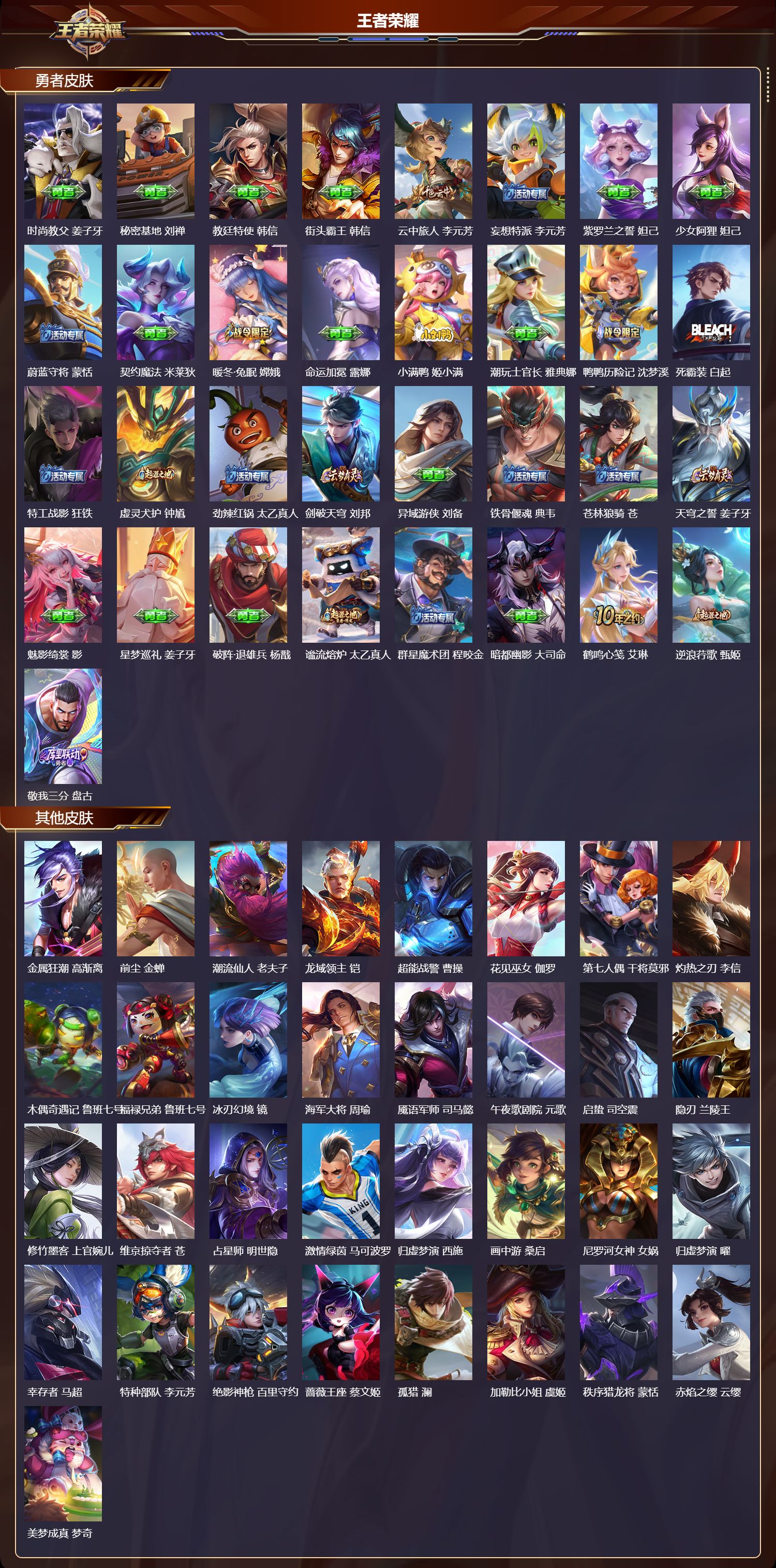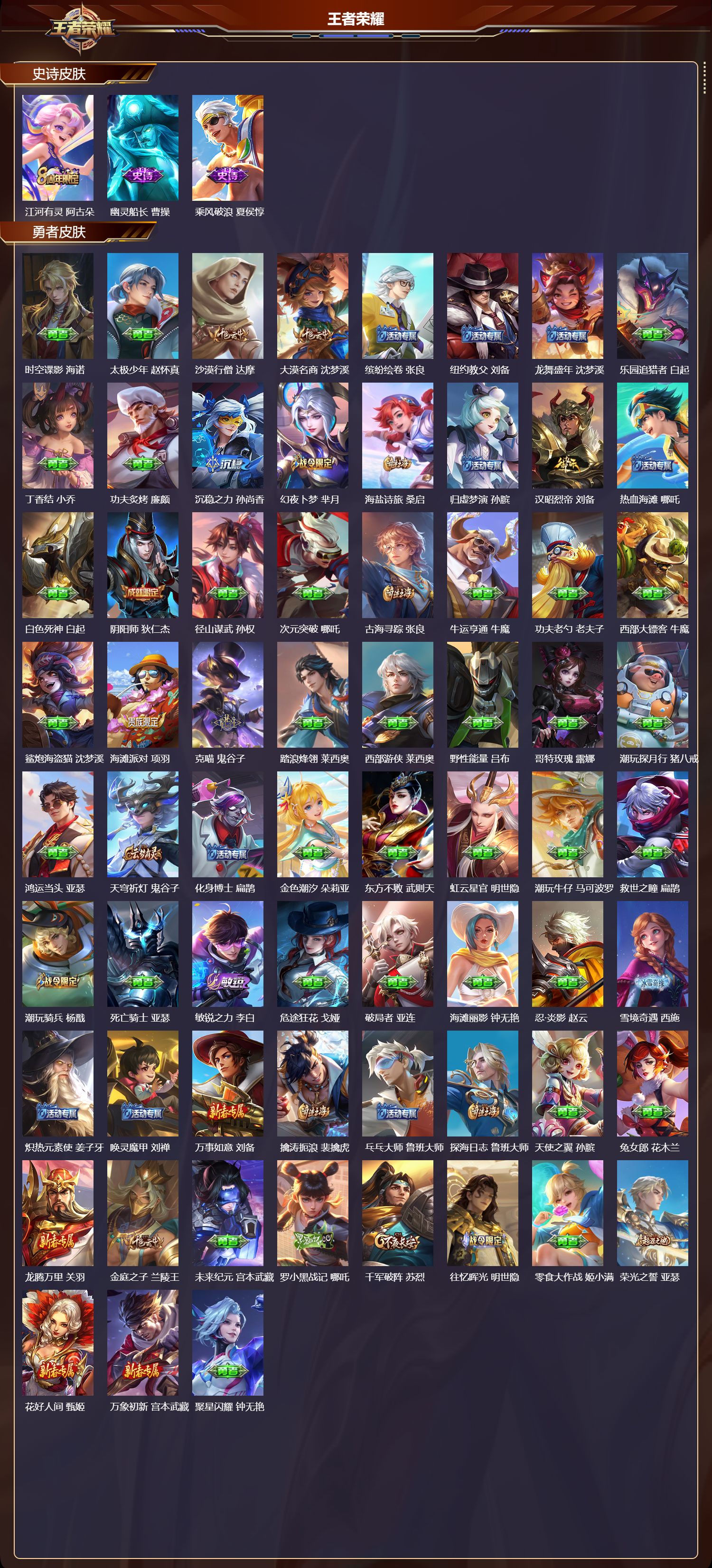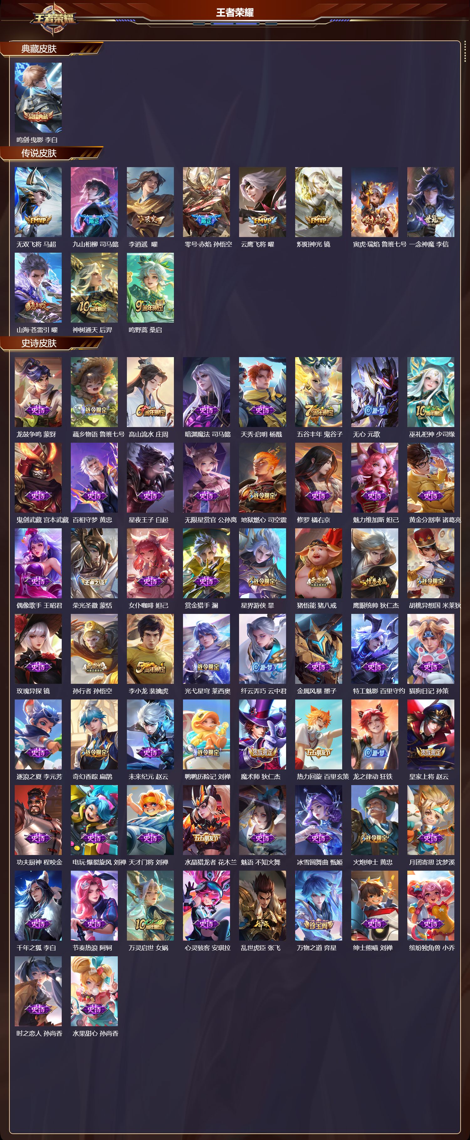 苹果qq/非凡王者/209皮肤/126英雄/1典藏/0珍品无双/0无双/0珍品传说/11传说/61史诗/8稀有英雄【1 典藏皮肤】鸣剑·曳影 李白【11 传说皮肤】无双飞将 马超九山相柳 司马懿李 曜零号·赤焰 孙悟空云鹰飞将 曜炽阳神光 镜寅虎·瑞焰 鲁班七号一念神魔 李信山海·苍雷引 曜神树通天 后羿鸣野蒿 桑启【61 史诗皮肤】龙鼓争鸣 蒙犽蔬乡物语 鲁班七号