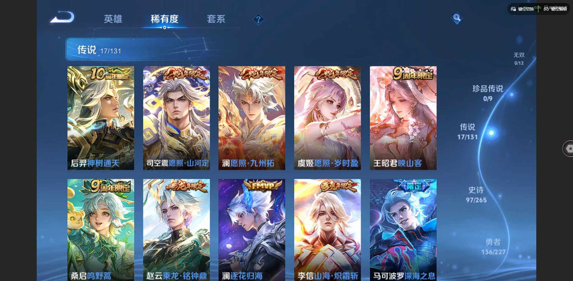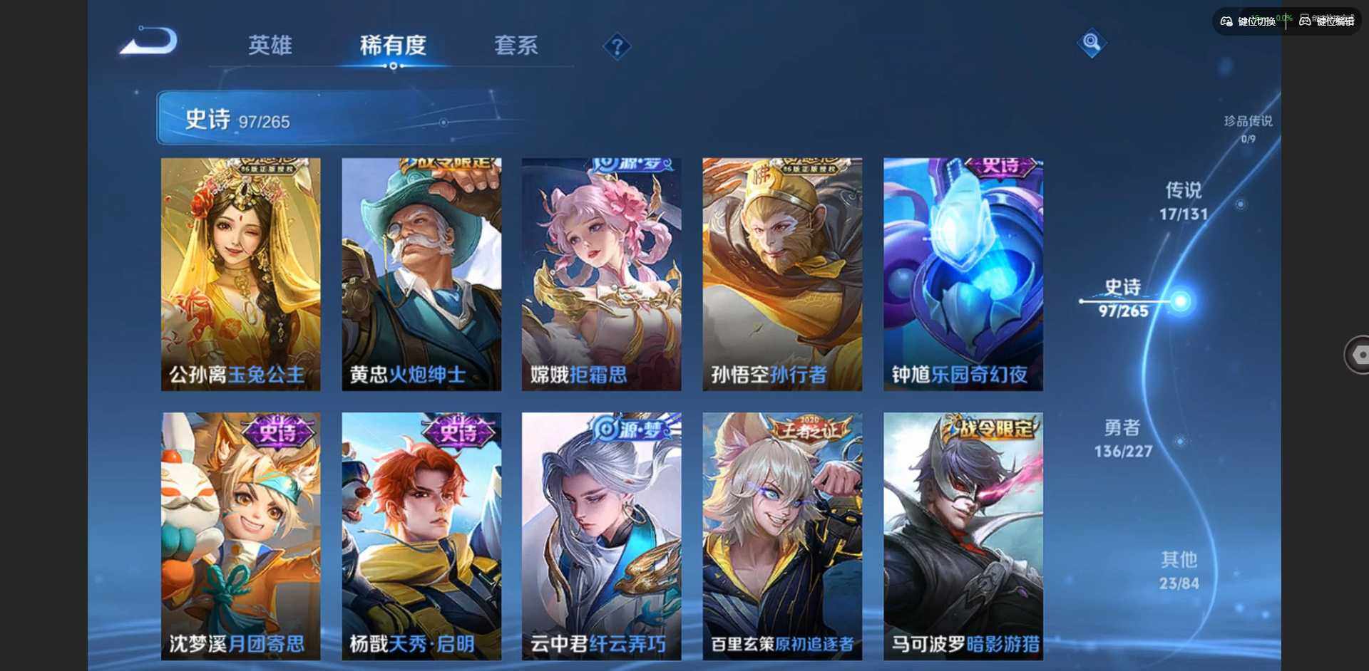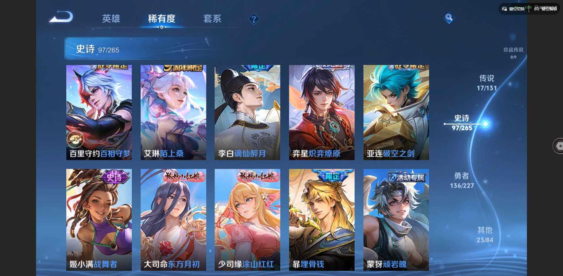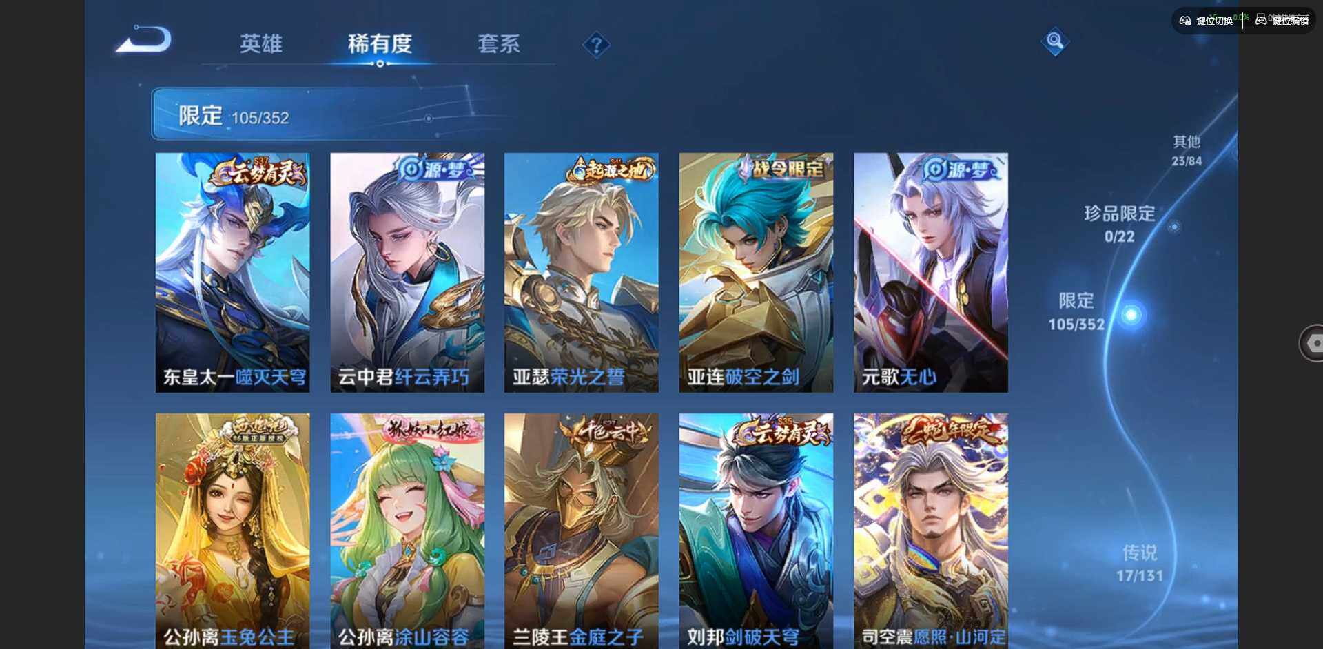 2296309-贵族等级: v7 英雄数: 127 皮肤数: 274 荣耀水晶: 拾光映像 星传说: 幽冥之眼金色仲夏夜 传说皮: 久胜战神云霓雀翎仲夏夜之梦地狱之眼游龙清影挚爱之约山海·炽霜斩澜逐花归海乘龙·铭钟鼎神树通天 限定皮: 遇见飞天异界灵契朱雀志孙行者玉兔公主深海之息五谷丰年山海·玄木吟鸣野蒿陌上桑映山客逐霄战戟愿照·山河定愿照·岁时