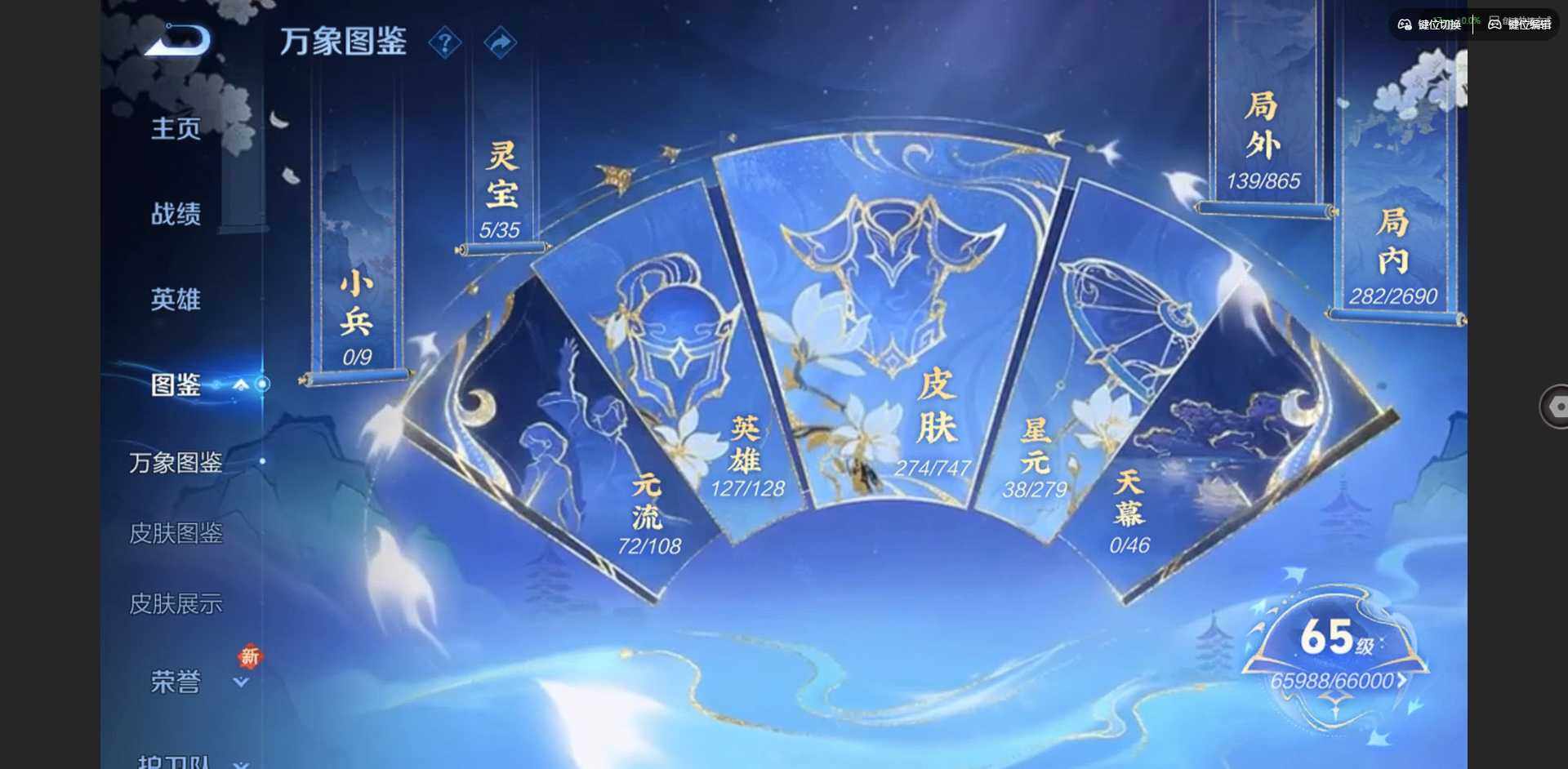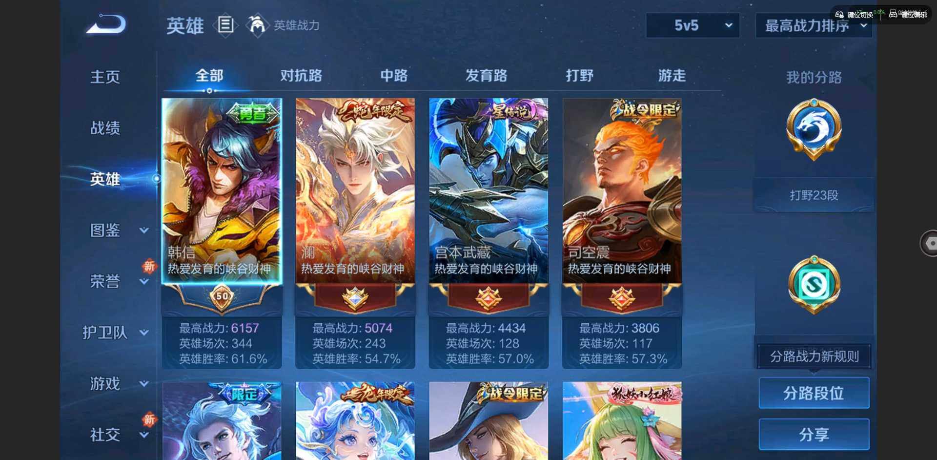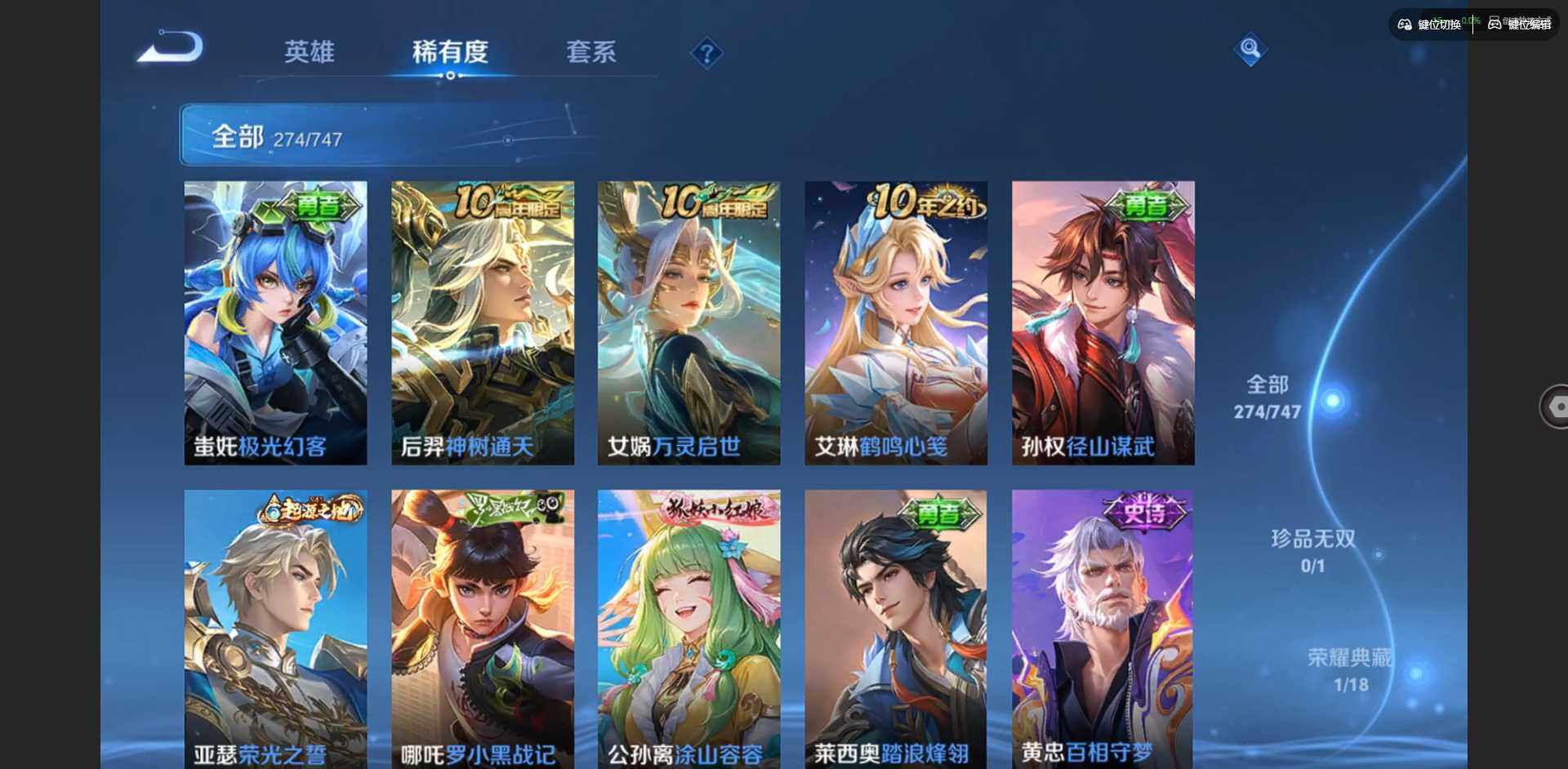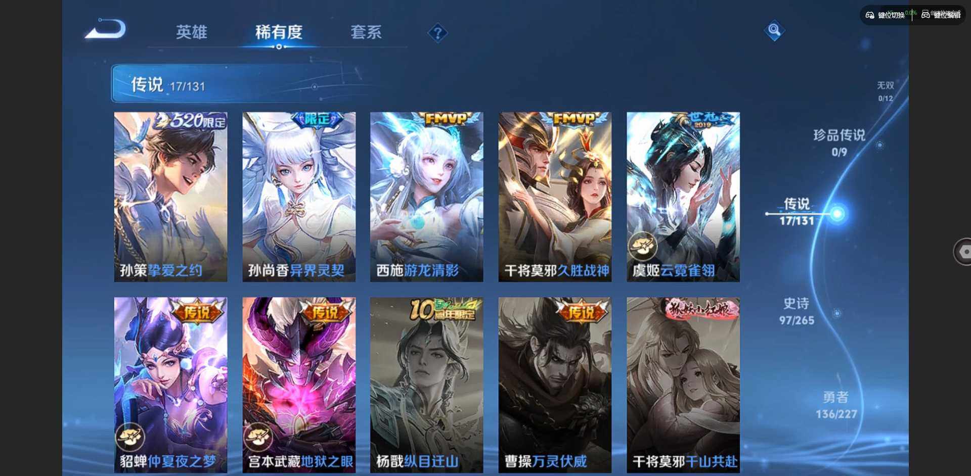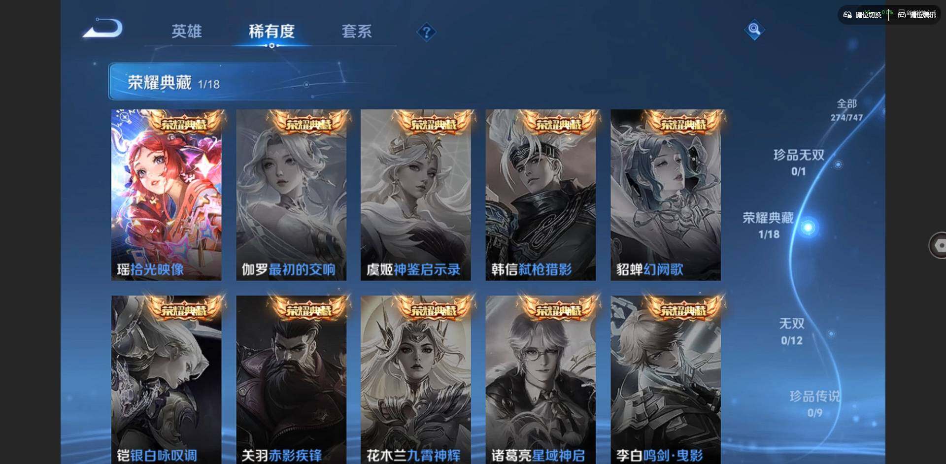 2296309-贵族等级: v7 英雄数: 127 皮肤数: 274 荣耀水晶: 拾光映像 星传说: 幽冥之眼金色仲夏夜 传说皮: 久胜战神云霓雀翎仲夏夜之梦地狱之眼游龙清影挚爱之约山海·炽霜斩澜逐花归海乘龙·铭钟鼎神树通天 限定皮: 遇见飞天异界灵契朱雀志孙行者玉兔公主深海之息五谷丰年山海·玄木吟鸣野蒿陌上桑映山客逐霄战戟愿照·山河定愿照·岁时