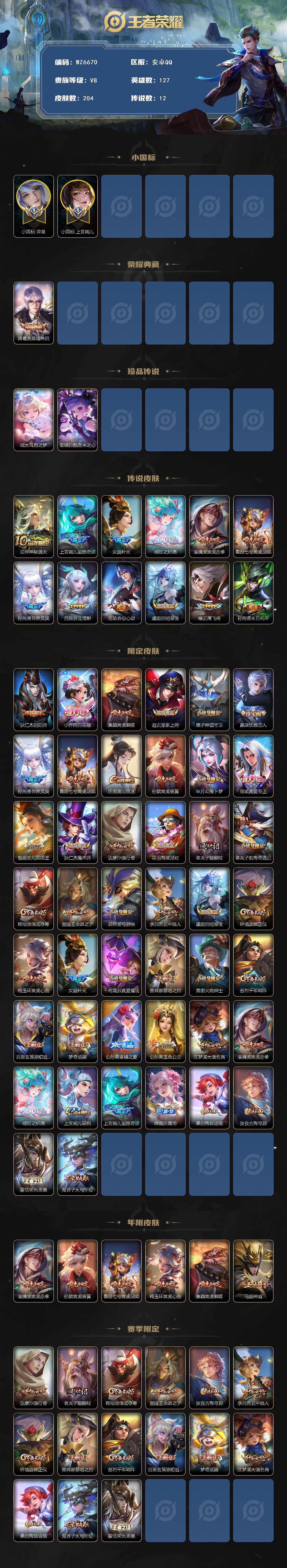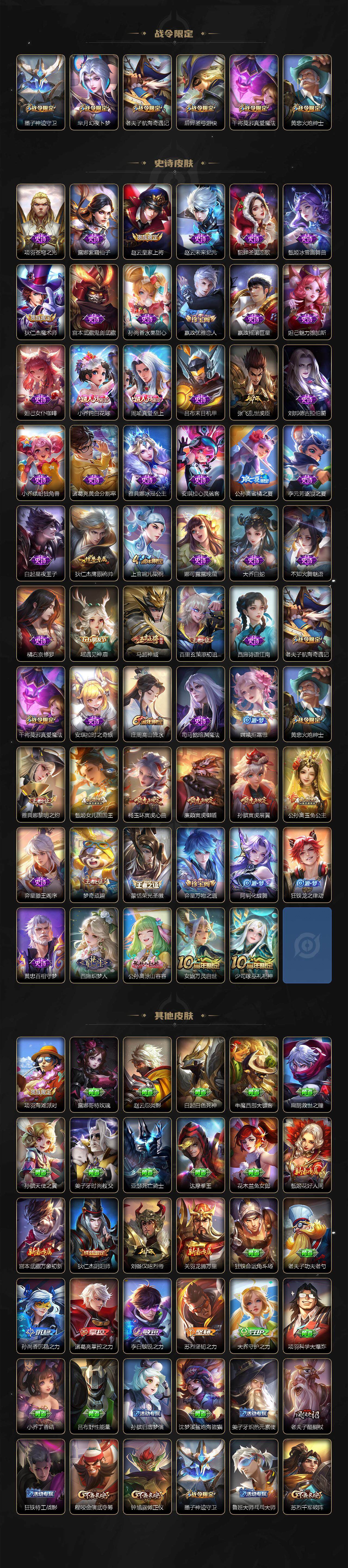 【2小国标 3个万战 9个金标】v8-最强王者段位-127英雄-204皮肤-1典藏皮肤-2珍品传说-12传说-59史诗 【英雄全皮】:孙权全皮 【荣耀典藏】:诸葛亮星域神启 【珍品传说】:瑶大耳狗之梦,安琪拉酷洛米之心 【传说皮肤】:后羿神树通天,上官婉儿妄想奇谈,女娲补天,瑶时之祈愿,裴擒虎寅虎赤拳,鲁班七号寅虎瑞焰,孙尚香异界灵契,西施游龙清影,周瑜音你心动,虞姬启明星使,曜云鹰飞将,孙尚香末日机甲 【限定皮肤】:狄仁杰阴阳师,小乔纯白花嫁,廉颇寅虎御盾,赵云皇家上将,墨子神迹守卫,嬴政优雅恋人,孙尚香异界灵契,鲁班七号寅虎瑞焰,庄周高山流水,孙膑寅虎展翼,芈月幻夜卜梦,周瑜真爱至上,甄姬女儿国国王,狄仁杰魔术师,达摩沙漠行僧,项羽海滩派对,老夫子醍醐杖,老夫子航海奇遇记,程咬金演武夺筹,兰陵王金庭之子,后羿圣弓游侠,李元芳云中旅人,虞姬启明星使,钟馗驱傩正仪,杨玉环寅虎心曲,女娲补天,干将莫邪真爱魔法,雅典娜黎明之约,黄忠火炮绅士,苏烈千军破阵,百里玄策原初追逐者,梦奇顽趣,公孙离蜜橘之夏,公孙离玉兔公主,沈梦溪大漠名商,裴擒虎寅虎赤拳,瑶时之祈愿,上官婉儿梁祝,上官婉儿妄想奇谈,嫦娥拒霜思,桑启海盐诗旅,张良古海寻踪,蒙恬荣光圣徽,鬼谷子天穹祈灯 【年限皮肤】:裴擒虎寅虎赤拳,孙膑寅虎展翼,鲁班七号寅虎瑞焰,杨玉环寅虎心曲,廉颇寅虎御盾,马超神威 【赛季限定】:达摩沙漠行僧,老夫子醍醐杖,程咬金演武夺筹,兰陵王金庭之子,张良古海寻踪,李元芳云中旅人,钟馗驱傩正仪,雅典娜黎明之约,苏烈千军破阵,百里玄策原初追逐者,梦奇顽趣,沈梦溪大漠名商,桑启海盐诗旅,鬼谷子天穹祈灯,蒙恬荣光圣徽 【战令限定】:墨子神迹守卫,芈月幻夜卜梦,老夫子航海奇遇记,后羿圣弓游侠,干将莫邪真爱魔法,黄忠火炮绅士 【史诗皮肤】:项羽苍穹之光,露娜紫霞仙子,赵云皇家上将,赵云未来纪元,貂蝉圣诞恋歌,甄姬冰雪圆舞曲,狄仁杰魔术师,宫本武藏鬼剑武藏,孙尚香水果甜心,嬴政优雅恋人,嬴政摇滚巨星,妲己魅力维加斯,妲己女仆咖啡,小乔纯白花嫁,周瑜真爱至上,吕布末日机甲,张飞乱世虎臣,刘邦德古拉伯爵,小乔缤纷独角兽,诸葛亮黄金分割率,雅典娜冰冠公主,安琪拉心灵骇客,公孙离蜜橘之夏,李元芳逐浪之夏,白起星夜王子,狄仁杰鹰眼统帅,上官婉儿梁祝,娜可露露晚萤,大乔白蛇,不知火舞魅语,橘右京修罗,瑶遇见神鹿,马超神威,百里玄策原初追逐者,西施诗语江南,老夫子航海奇遇记,干将莫邪真爱魔法,安琪拉时之奇旅,庄周高山流水,司马懿暗渊魔法,嫦娥拒霜思,黄忠火炮绅士,雅典娜黎明之约,甄姬女儿国国王,杨玉环寅虎心曲,廉颇寅虎御盾,孙膑寅虎展翼,公孙离玉兔公主,弈星滕王阁序,梦奇顽趣,蒙恬荣光圣徽,弈星万物之道,阿轲化蝶舞,狂铁龙之律动,黄忠百相守梦,西施织梦人,公孙离涂山容容,女娲万灵启世,少司缘巫礼祀神 【其他皮肤】:项羽海滩派对,露娜哥特玫瑰,赵云忍炎影,白起白色死神,牛魔西部大镖客,扁鹊救世之瞳,孙膑天使之翼,姜子牙时尚教父,亚瑟死亡骑士,达摩拳王,花木兰兔女郎,甄姬花好人间,宫本武藏万象初新,狄仁杰阴阳师,刘备汉昭烈帝,关羽龙腾万里,狂铁命运角斗场,老夫子功夫老勺,孙尚香沉稳之力,诸葛亮掌控之力,李白敏锐之力,苏烈坚韧之力,大乔守护之力,项羽科学大爆炸,小乔丁香结,吕布野性能量,孙膑归虚梦演,沈梦溪鲨炮海盗猫,姜子牙炽热元素使,老夫子醍醐杖,狂铁特工战影,程咬金演武夺筹,钟馗驱傩正仪,墨子神迹守卫,鲁班大师乓乓大师,苏烈千军破阵,后羿圣弓游侠,妲己紫罗兰之誓,达摩沙漠行僧,芈月幻夜卜梦,刘邦虎啸剑宗,兰陵王金庭之子,沈梦溪大漠名商,李元芳云中旅人,桑启海盐诗旅,猪八戒潮玩探月行,张良古海寻踪,鬼谷子天穹祈灯,海诺时空谍影,廉颇功夫炙烤,东皇太一噬灭天穹,吕布逐霄战戟,苍苍林狼骑,太乙真人谧流熔炉,典韦铁骨偃魂,姜子牙星梦巡礼,明世隐景韶洛都,戈娅玫蓝誓约,刘备浪漫序章,钟馗虚灵犬护,苏烈春野闲踪,小乔秘证寻踪,张良灵野札记,阿古朵布丁狗之约,甄姬逆浪荇歌,莱西奥踏浪烽翎,桑启青衿临川,哪吒罗小黑战记,亚瑟荣光之誓,孙权径山谋武,艾琳鹤鸣心笺,鲁班七号福禄兄弟,鲁班七号木偶奇遇记,貂蝉异域舞娘,花木兰剑舞者,王昭君精灵公主,曹操死神来了,张良一千零一夜,小乔万圣前夜,孙膑未来旅行,孙悟空西部大镖客,周瑜海军大将,后羿精灵王,刘禅英喵野望,兰陵王隐刃,李白范海辛,李元芳特种部队,虞姬加勒比小姐,蔡文姬蔷薇王座,夏侯惇战争骑士,马可波罗激情绿茵,苍维京掠夺者,杨戬埃及法老,太乙真人圆桌骑士,黄忠芝加哥教父,大乔伊势巫女,东皇太一东海龙王,干将莫邪第七人偶,鬼谷子阿摩司公爵,百里守约绝影神呛,梦奇美梦成真,女娲尼罗河女神,明世隐占星师,公孙离花间舞,杨玉环霓裳曲,裴擒虎街头旋风,弈星踏雪寻梅,元歌午夜歌剧院,孙策海之征途,司马懿魇语军师,伽罗花见巫女,沈梦溪棒球奇才,李信灼热之刃,上官婉儿修竹墨客,嫦娥露花倒影,猪八戒年年有余,盘古创世神祝,瑶森,曜归虚梦演,马超幸存者,西施归虚梦演,蒙犽归虚梦演,镜冰刃幻境,阿古朵熊喵少女,澜孤猎,司空震启蛰,云缨赤焰之缨,金蝉前尘,暃碧珀绯影,桑启画中游 【内测皮肤】:嬴政优雅恋人,狂铁特工战影 【营地id】:1885927106 【小国标】:小国标上官婉儿,小国标弈星 【金标】
