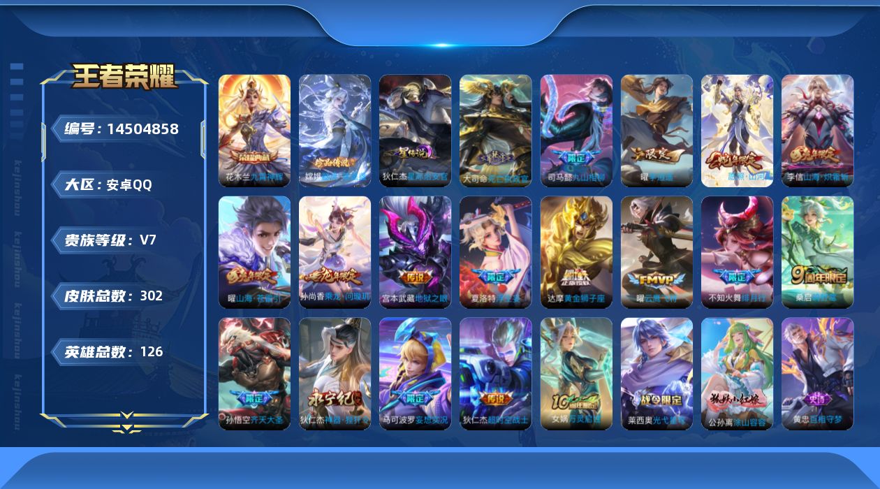 [14504858]【编号34588,可秒换绑】【店长推荐极品质量号!都是好皮肤!!手慢无!!】星际治安官 ,安卓q-v7-最强王者段位-126英雄-302皮肤-1典藏皮肤-1珍品传说-18传说-83史诗 【英雄全皮】:司马懿全皮,孙权全皮,大司命全皮,蒙恬全皮,夏洛特全皮,司空震全皮,戈娅全皮,影全皮 【荣耀典藏】:花木兰九霄神辉 【珍品传说】:嫦娥器灵落星盏 【传说皮肤】:后羿神树通天,大司命死亡执政官,司马懿九山相柳,司空震愿照山河定,桑启鸣野蒿,孙尚香乘龙问璇玑,马可波罗妄想实况,夏洛特浮生妄,孙悟空齐天大圣,曜山海苍雷引,李信山海炽霜斩,狄仁杰神器狴犴令,不知火舞绯月行,曜李 ,曜云鹰飞将,达摩黄金狮子座,宫本武藏地狱之眼,狄仁杰超时空战士 【限定皮肤】:蔡文姬夏日便利店,虞姬夏日便利店,姜子牙天穹之誓,狄仁杰阴阳师,赵云皇家上将,赵云龙胆,孙尚香蔷薇恋人,扁鹊奇幻香踪,元歌无心,马可波罗山海玄木吟,马可波罗妄想实况,狄仁杰魔术师,狄仁杰神器狴犴令,达摩沙漠行僧,项羽海滩派对,韩信飞衡,韩信傲雪梅呛,王昭君午后时光,兰陵王金庭之子,不知火舞绯月行,孙悟空至尊宝,孙悟空大圣娶亲,孙悟空齐天大圣,刘备百相守梦,李元芳云中旅人,钟馗驱傩正仪,杨戬潮玩骑兵,鬼谷子五谷丰年,苏烈千军破阵,百里玄策原初追逐者,梦奇顽趣,沈梦溪大漠名商,裴擒虎李小龙,裴擒虎擒涛扼浪,狂铁电玩高手,云中君纤云弄巧,李信山海炽霜斩,嫦娥拒霜思,嫦娥暖冬兔眠,曜李 ,曜山海苍雷引,西施玲珑珍味,鲁班大师探海日志,桑启海盐诗旅,夏洛特浮生妄,戈娅驭风魔法,艾琳女武神,艾琳流音漫舞,司空震地狱燃心,阿古朵江河有灵,张良古海寻踪,蒙犽百解令,蒙恬荣光圣徽,高渐离燃音魔法,妲己灵卜魔法,鬼谷子天穹祈灯,姬小满妄想食味,孙尚香乘龙问璇玑,沈梦溪龙舞盛年,刘邦剑破天穹,周瑜熔金海岸 【年限皮肤】:韩信飞衡,赵云龙胆,马可波罗山海玄木吟,李信山海炽霜斩,曜山海苍雷引,孙尚香乘龙问璇玑 【赛季限定】:达摩沙漠行僧,兰陵王金庭之子,张良古海寻踪,李元芳云中旅人,钟馗驱傩正仪,苏烈千军破阵,百里玄策原初追逐者,梦奇顽趣,沈梦溪大漠名商,裴擒虎擒涛扼浪,鲁班大师探海日志,桑启海盐诗旅,鬼谷子天穹祈灯,蒙恬荣光圣徽,刘邦剑破天穹,姜子牙天穹之誓 【战令限定】:蔡文姬夏日便利店,虞姬夏日便利店,扁鹊奇幻香踪,王昭君午后时光,艾