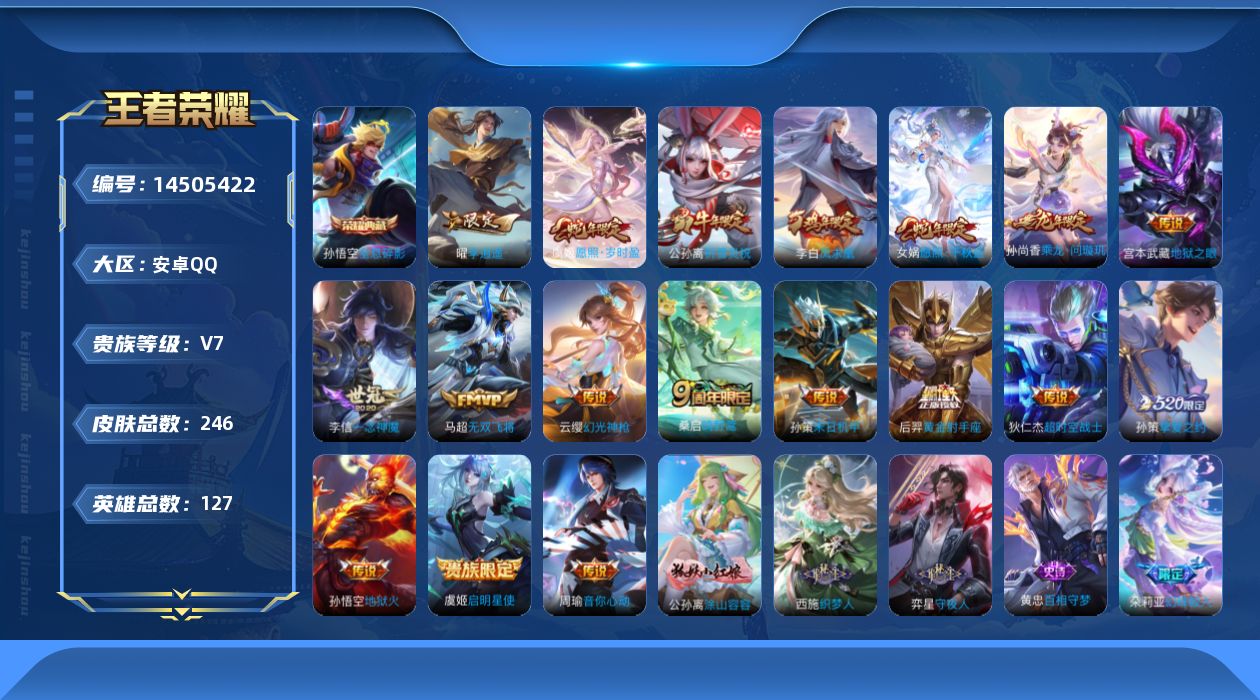 [14505422]【编号27193】【店长推荐捡漏!!!可秒换绑顶级极品号喜欢的宝宝速抢】安卓q-v7-至尊星耀iv段位-127英雄-244皮肤-1典藏-0珍品无双-0无双0珍品传说-18传说-66史诗 【英雄全皮】:金蝉全皮,空空儿全皮,影全皮 【荣耀典藏】:武则天英雄,孙悟空全息碎影 【传说皮肤】:女娲愿照千秋盛,虞姬愿照岁时盈,云缨幻光神呛,桑启鸣野蒿,孙尚香乘龙问璇玑,马超无双飞将,孙策挚爱之约,孙策末日机甲,曜李 ,周瑜音你心动,公孙离祈雪灵祝,虞姬启明星使,李信一念神魔,后羿黄金射手座,李白凤求凰,宫本武藏地狱之眼,孙悟空地狱火,狄仁杰超时空战士 【限定皮肤】:白起狰,姜子牙天穹之誓,狄仁杰阴阳师,虞姬凯尔特女王,赵云皇家上将,嬴政优雅恋人,鲁班七号狮舞东方,扁鹊炼金王,元歌云间偶戏,元歌无心,夏侯惇朔风刀,曹操烛龙,典韦穷奇,马可波罗山海玄木吟,狄仁杰魔术师,狄仁杰万华元夜,达摩星际陆战队,达摩沙漠行僧,项羽海滩派对,老夫子醍醐杖,关羽百相守梦,程咬金演武夺筹,韩信逐梦之影,韩信飞衡,兰陵王金庭之子,亚瑟潮玩骑士王,牛魔御旌,李元芳云中旅人,虞姬启明星使,钟馗神迹守卫,钟馗驱傩正仪,杨玉环遇见飞天,太乙真人饕餮,鬼谷子原初探秘者,鬼谷子五谷丰年,苏烈千军破阵,弈星混沌棋,梦奇顽趣,公孙离祈雪灵祝,沈梦溪大漠名商,明世隐疑决卦,裴擒虎擒涛扼浪,狂铁御狮,米莱狄御霄,米莱狄胡桃异想国,盾山御銮,孙策挚爱之约,上官婉儿梁祝,嫦娥拒霜思,曜李 ,鲁班大师探海日志,桑启海盐诗旅,金蝉唐三藏,艾琳女武神,艾琳流音漫舞,司空震地狱燃心,阿古朵江河有灵,张良古海寻踪,鬼谷子天穹祈灯,孙尚香乘龙问璇玑,沈梦溪龙舞盛年,刘邦剑破天穹,程咬金群星魔术团 【年限皮肤】:李白凤求凰,公孙离祈雪灵祝,韩信飞衡,马可波罗山海玄木吟,孙尚香乘龙问璇玑 【赛季限定】:扁鹊炼金王,白起狰,夏侯惇朔风刀,曹操烛龙,典韦穷奇,狄仁杰万华元夜,达摩沙漠行僧,老夫子醍醐杖,程咬金演武夺筹,兰陵王金庭之子,张良古海寻踪,牛魔御旌,李元芳云中旅人,虞姬凯尔特女王,钟馗驱傩正仪,太乙真人饕餮,鬼谷子原初探秘者,苏烈千军破阵,弈星混沌棋,梦奇顽趣,沈梦溪大漠名商,明世隐疑决卦,裴擒虎擒涛扼浪,狂铁御狮,米莱狄御霄,盾山御銮,鲁班大师探海日志,桑启海盐诗旅,鬼谷子天穹祈灯,刘邦剑破天穹,姜子牙天穹之誓 【战令