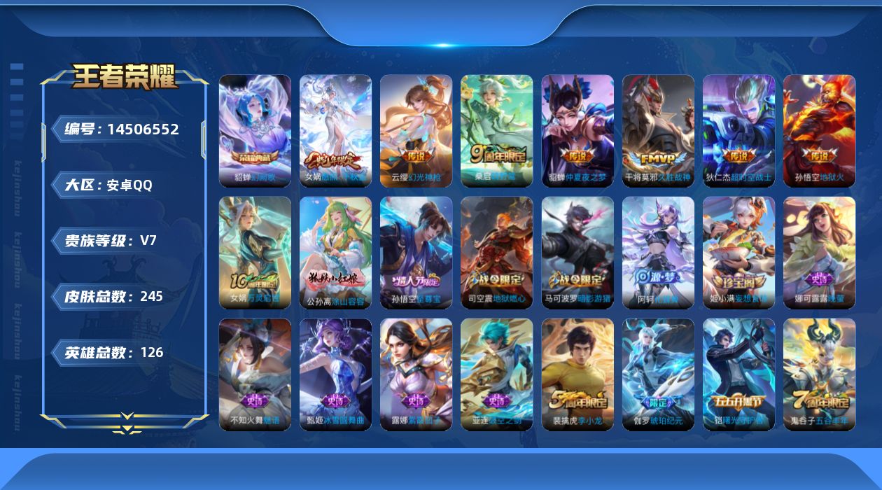 [14506552]安卓q-v7-永恒钻石ii段位-123英雄-240皮肤-1典藏-0珍品无双-0无双-0珍品传说-6传说-72史诗 【荣耀典藏】:貂蝉幻阙歌 【传说皮肤】:女娲愿照千秋盛,云缨幻光神呛,桑启鸣野蒿,貂蝉仲夏夜之梦,孙悟空地狱火,狄仁杰超时空战士 【限定皮肤】:白起狰,蒙犽顽岩魄,蔡文姬夏日便利店,大乔绒语心约,虞姬夏日便利店,姜子牙天穹之誓,杨戬破阵退雄兵,狄仁杰阴阳师,赵云皇家上将,墨子神迹守卫,芈月重明,夏侯惇朔风刀,曹操烛龙,典韦穷奇,马可波罗暗影游猎,狄仁杰魔术师,狄仁杰万华元夜,项羽海滩派对,老夫子醍醐杖,老夫子航海奇遇记,程咬金演武夺筹,孙悟空至尊宝,牛魔御旌,钟馗驱傩正仪,杨玉环遇见飞天,太乙真人饕餮,鬼谷子原初探秘者,鬼谷子五谷丰年,百里玄策原初追逐者,弈星混沌棋,明世隐疑决卦,裴擒虎李小龙,狂铁御狮,米莱狄御霄,云中君纤云弄巧,盾山御銮,上官婉儿梁祝,嫦娥拒霜思,艾琳女武神,艾琳流音漫舞,司空震地狱燃心,阿古朵江河有灵,张良古海寻踪,蒙犽百解令,高渐离燃音魔法,妲己灵卜魔法,鬼谷子天穹祈灯,伽罗琥珀纪元,姬小满妄想食味,沈梦溪龙舞盛年,鲁班七号蔬乡物语,李元芳蔬乡物语,刘邦剑破天穹,程咬金群星魔术团,镜青焰无极,项羽苍威无极,刘备异域游侠,周瑜熔金海岸 【赛季限定】:白起狰,芈月重明,夏侯惇朔风刀,曹操烛龙,典韦穷奇,狄仁杰万华元夜,老夫子醍醐杖,程咬金演武夺筹,张良古海寻踪,牛魔御旌,钟馗驱傩正仪,太乙真人饕餮,鬼谷子原初探秘者,百里玄策原初追逐者,弈星混沌棋,明世隐疑决卦,狂铁御狮,米莱狄御霄,盾山御銮,鬼谷子天穹祈灯,刘邦剑破天穹,姜子牙天穹之誓 【战令限定】:墨子神迹守卫,蔡文姬夏日便利店,虞姬夏日便利店,马可波罗暗影游猎,老夫子航海奇遇记,艾琳流音漫舞,司空震地狱燃心,高渐离燃音魔法,妲己灵卜魔法,鲁班七号蔬乡物语,李元芳蔬乡物语,镜青焰无极,项羽苍威无极 【史诗皮肤】:露娜紫霞仙子,赵云皇家上将,赵云未来纪元,貂蝉圣诞恋歌,甄姬冰雪圆舞曲,王昭君偶像歌手,狄仁杰魔术师,廉颇地狱岩魂,宫本武藏鬼剑武藏,孙尚香水果甜心,嬴政暗夜贵公子,嬴政摇滚巨星,妲己魅力维加斯,妲己女仆咖啡,墨子龙骑士,吕布圣诞狂欢,刘禅绅士熊喵,曹操幽灵船长,李白千年之狐,吕布末日机甲,张飞乱世虎臣,韩信白龙吟,孙悟空至尊宝,花木兰水晶猎龙者,夏侯惇乘风破浪,小乔缤纷