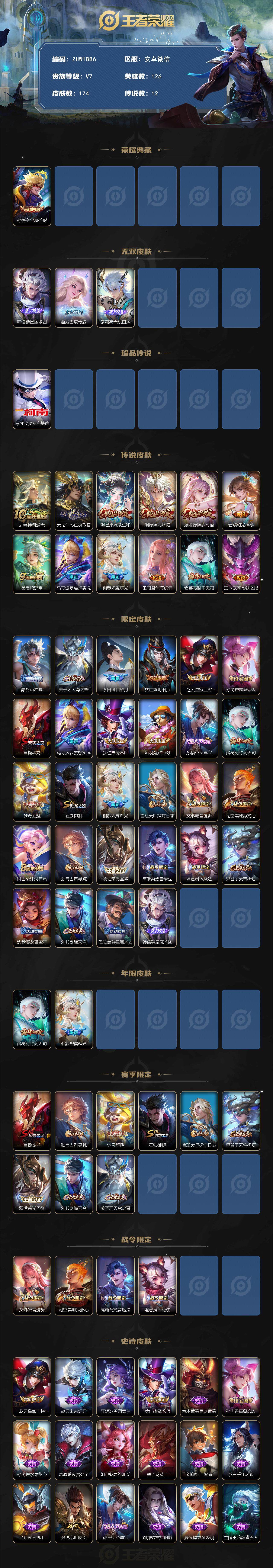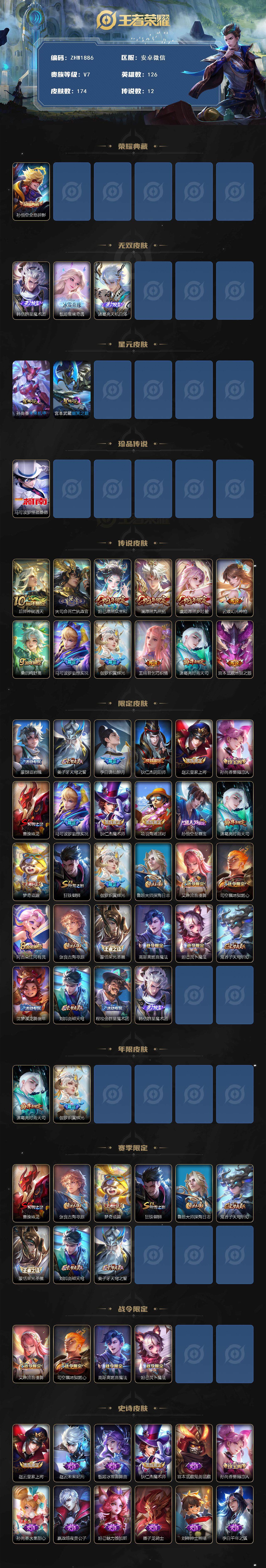 安卓wx-v7-最强王者段位-126英雄-174皮肤-1典藏皮肤-3无双-1珍品传说-12传说-47史诗-星传说:孙尚香未来机甲,宫本武藏-幽冥之眼 【英雄全皮】:孙权全皮,影全皮 【荣耀典藏】:孙悟空全息碎影 【无双皮肤】:韩信群星魔术团,甄姬雪境奇遇,诸葛亮天机白泽 【珍品传说】:马可波罗怪盗基德 【传说皮肤】:后羿神树通天,大司命死亡执政官,妲己愿照众生和,澜愿照九州拓,虞姬愿照岁时盈,云缨幻光神呛,桑启鸣野蒿,马可波罗妄想实况,伽罗炽翼辉光,王昭君乞巧织情,诸葛亮时雨天司,宫本武藏地狱之眼 【限定皮肤】:蒙犽顽岩魄,姜子牙天穹之誓,李白谪仙醉月,狄仁杰阴阳师,赵云皇家上将,孙尚香蔷薇恋人,曹操烛龙,马可波罗妄想实况,狄仁杰魔术师,项羽海滩派对,孙悟空至尊宝,诸葛亮时雨天司,梦奇顽趣,狂铁御狮,伽罗炽翼辉光,鲁班大师探海日志,艾琳流音漫舞,司空震地狱燃心,阿古朵江河有灵,张良古海寻踪,蒙恬荣光圣徽,高渐离燃音魔法,妲己灵卜魔法,鬼谷子天穹祈灯,沈梦溪龙舞盛年,刘邦剑破天穹,程咬金群星魔术团,韩信群星魔术团 【年限皮肤】:诸葛亮时雨天司,伽罗炽翼辉光 【赛季限定】:曹操烛龙,张良古海寻踪,梦奇顽趣,狂铁御狮,鲁班大师探海日志,鬼谷子天穹祈灯,蒙恬荣光圣徽,刘邦剑破天穹,姜子牙天穹之誓 【战令限定】:艾琳流音漫舞,司空震地狱燃心,高渐离燃音魔法,妲己灵卜魔法 【史诗皮肤】:赵云皇家上将,赵云未来纪元,甄姬冰雪圆舞曲,狄仁杰魔术师,宫本武藏鬼剑武藏,孙尚香蔷薇恋人,孙尚香水果甜心,嬴政暗夜贵公子,妲己魅力维加斯,墨子龙骑士,刘禅绅士熊喵,李白千年之狐,吕布末日机甲,张飞乱世虎臣,孙悟空至尊宝,刘邦德古拉伯爵,夏侯惇乘风破浪,兰陵王暗隐猎兽者,诸葛亮黄金分割率,雅典娜冰冠公主,铠曙光守护者,李元芳逐浪之夏,程咬金功夫厨神,阿轲节奏热浪,大乔猫狗日记,狄仁杰鹰眼统帅,杨戬天秀启明,沈梦溪月团寄思,钟馗乐园奇幻夜,梦奇顽趣,司空震地狱燃心,阿古朵江河有灵,妲己灵卜魔法,高渐离燃音魔法,蒙恬荣光圣徽,蒙犽顽岩魄,李白谪仙醉月,百里守约百相守梦,牛魔星界战将,白起苍鳞隐世,赵怀真器灵浮梦炉,阿轲化蝶舞,刘禅鸭鸭历险记,狂铁龙之律动,后羿石田雨龙,黄忠百相守梦,公孙离涂山容容,女娲万灵启世 【其他皮肤】:项羽海滩派对,韩信教廷特使,韩信街头霸王,达摩大发明家,赵云白执事,赵云忍炎影,程咬金星际陆战队,白起白色死神,扁鹊救世之瞳,宫本武藏未来纪元,安琪拉玩偶对对碰,孙膑天使之翼,妲己少女阿狸,典韦黄金武士,亚瑟死亡骑士,达摩拳王,花木兰兔女郎,甄姬花好人间,刘备万事如意,后羿阿尔法小队,狄仁杰阴阳师,关羽龙腾万里,钟无艳海滩丽影,曹操烛龙,王昭君幻想奇妙夜,诸葛亮掌控之力,李白敏锐之力,鬼谷子幻乐之宴,狂铁御狮,大乔守护之力,明世隐虹云星官,小乔丁香结,沈梦溪鲨炮海盗猫,姜子牙炽热元素使,狂铁特工战影,张良缤纷绘卷,鲁班大师乓乓大师,程咬金无双福将,刘禅唤灵魔甲,蒙恬蔚蓝守将,猪八戒潮玩探月行,太乙真人劲辣红锅,莱西奥西部游侠,鲁班大师探海日志,李元芳妄想特派,哪吒热血海滩,艾琳流音漫舞,张良古海寻踪,亚连破局者,后羿完美运算,鬼谷子天穹祈灯,妲己灵卜魔法,嫦娥漠中幻影,廉颇功夫炙烤,沈梦溪龙舞盛年,钟无艳春野之旅,刘邦剑破天穹,程咬金群星魔术团,大司命暗都幽影,姜子牙天穹之誓,盘古敬我三分,东皇太一噬灭天穹,老夫子百相守梦,干将莫邪雾都夜雨,吕布逐霄战戟,苍苍林狼骑,太乙真人谧流熔炉,典韦铁骨偃魂,影魅影绮裳,西施雪境奇遇,姜子牙星梦巡礼,少司缘灵卦秘语,明世隐景韶洛都,戈娅玫蓝誓约,刘备浪漫序章,钟馗虚灵犬护,沈梦溪鸭鸭历险记,苏烈春野闲踪,张良灵野札记,阿古朵布丁狗之约,露娜命运加冕,姬小满小满鸭,白起死霸装,甄姬逆浪荇歌,云中君云械蓝图,庄周锦麟游梦,莱西奥踏浪烽翎,鬼谷子克喵,哪吒罗小黑战记,亚瑟荣光之誓,张良罗小黑战记,孙权径山谋武,艾琳鹤鸣心笺,曹操逐霄之志,鲁班七号木偶奇遇记,钟无艳生化警戒,孙悟空西部大镖客,刘禅英喵野望,钟馗地府判官,李元芳特种部队,马可波罗激情绿茵,百里守约绝影神呛,公孙离花间舞,瑶森,马超幸存者,阿古朵熊喵少女,澜孤猎,云缨赤焰之缨,金蝉前尘 【内测皮肤】:孙尚香蔷薇恋人,狂铁特工战影 【营地id】:1820103387 【星元皮肤】:孙尚香未来机甲,宫本武藏幽冥之眼