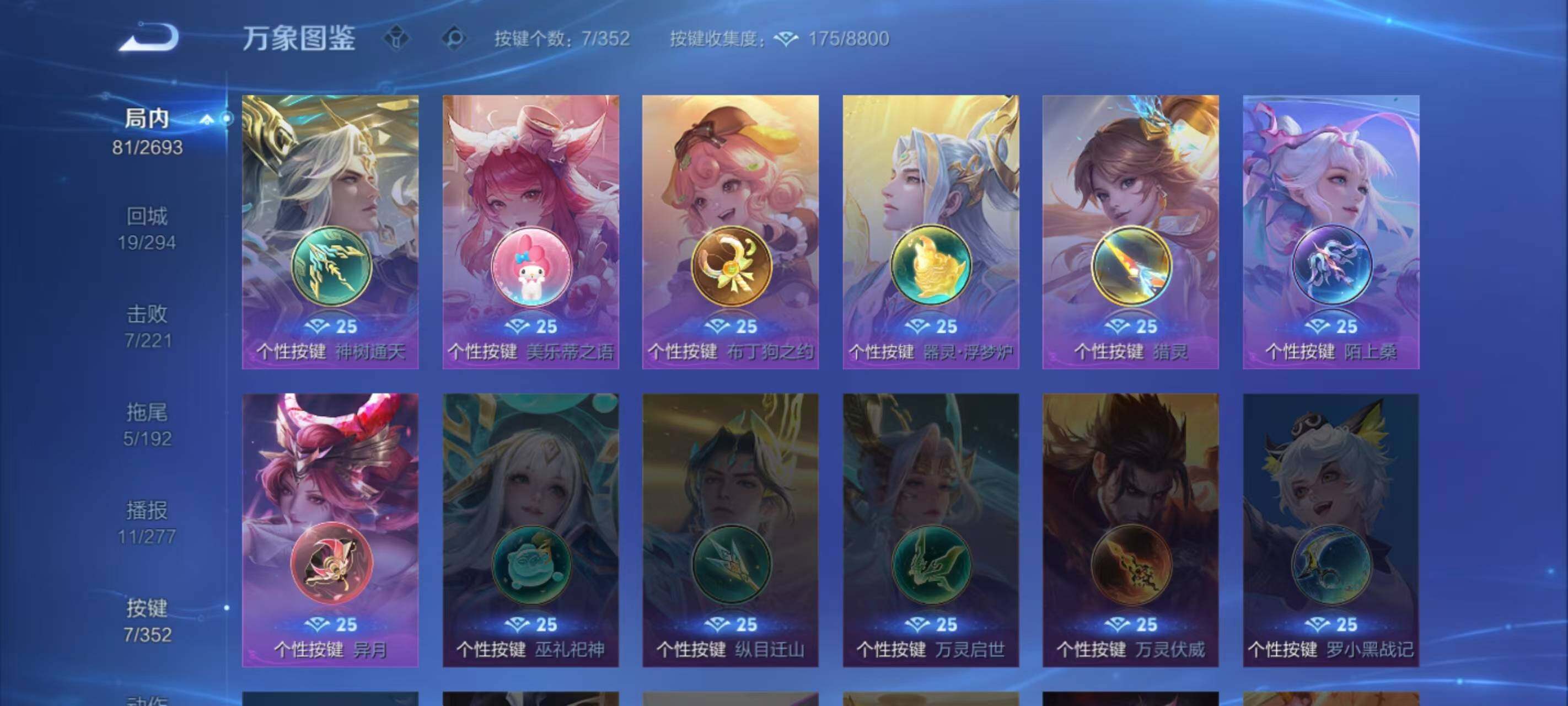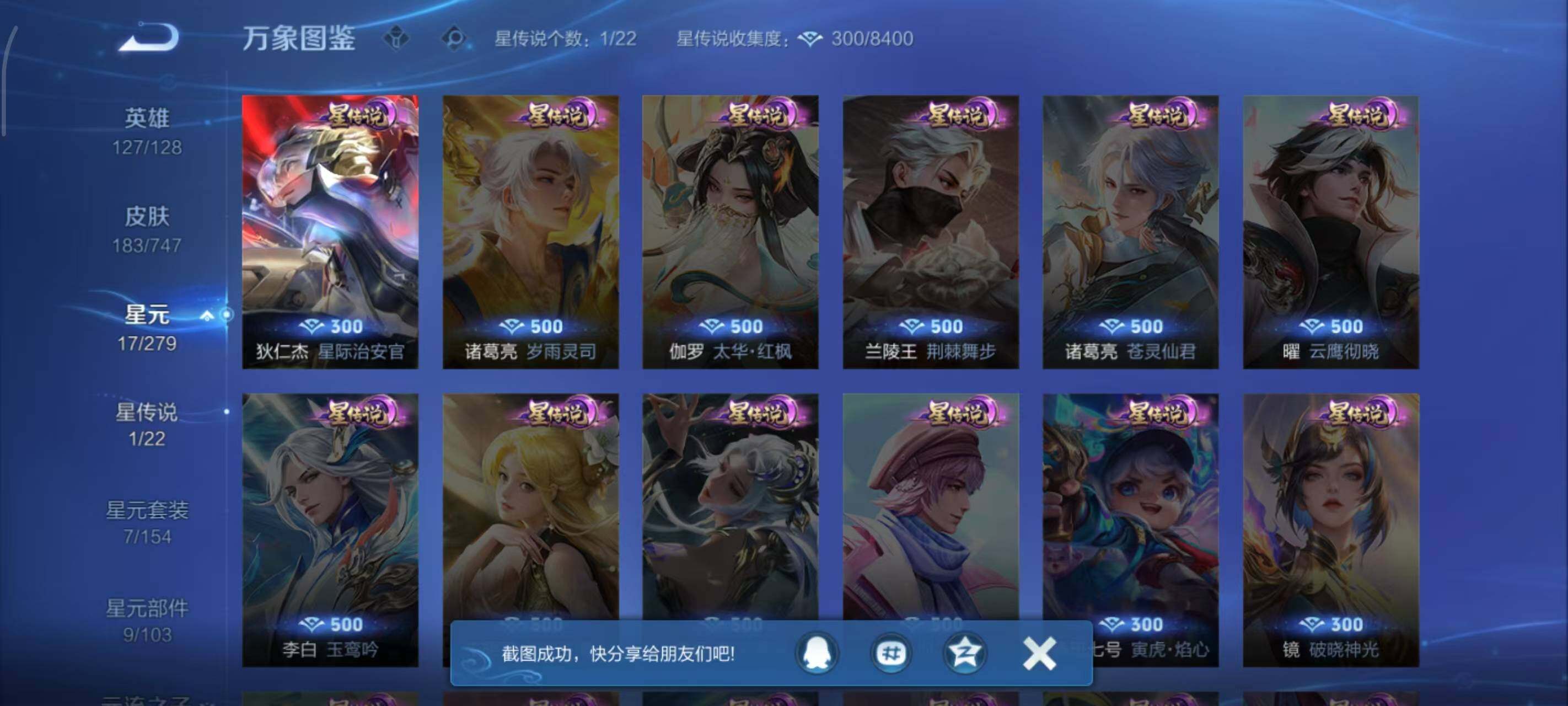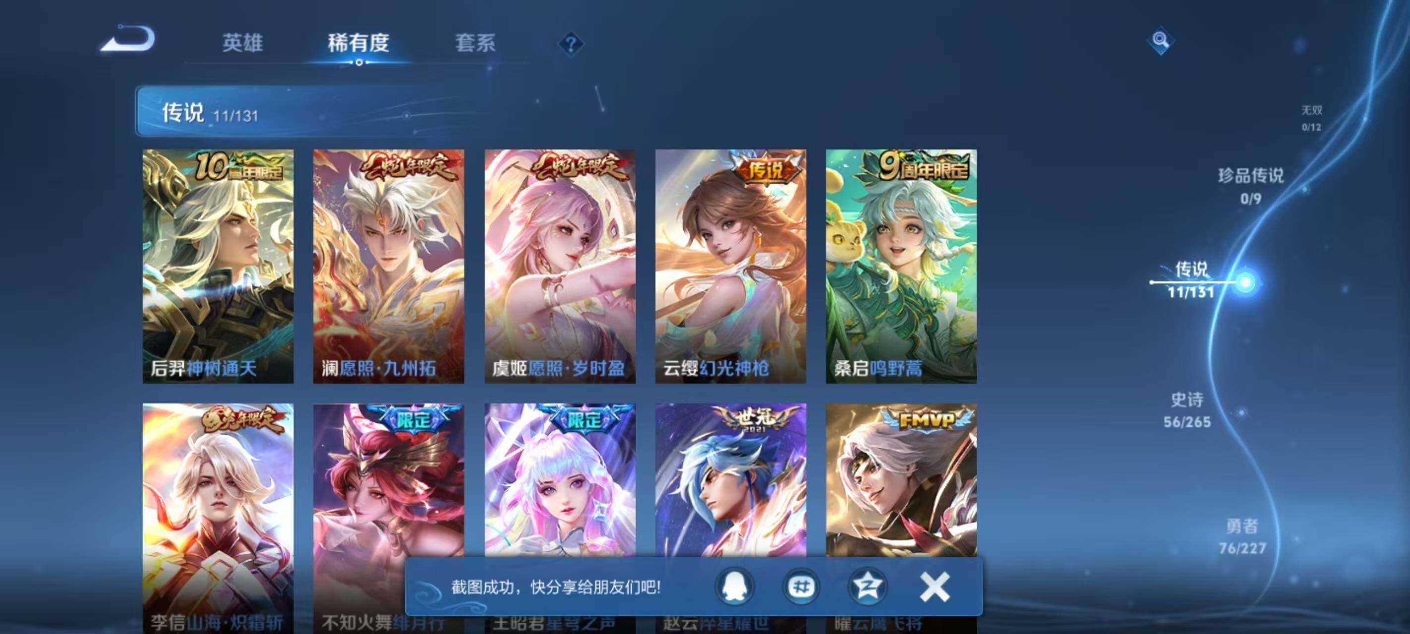 127英雄-183皮肤-按键7 积分夺宝297 安卓q-v6-183皮肤-11传说-56史诗 【英雄全皮】:阿古朵全皮,影全皮 【传说皮肤】:后羿神树通天,澜愿照九州拓,虞姬愿照岁时盈,云缨幻光神呛,桑启鸣野蒿,李信山海炽霜斩,不知火舞绯月行,王昭君星穹之声,赵云淬星耀世,曜云鹰飞将,狄仁杰超时空战士 【限定皮肤】:狄仁杰