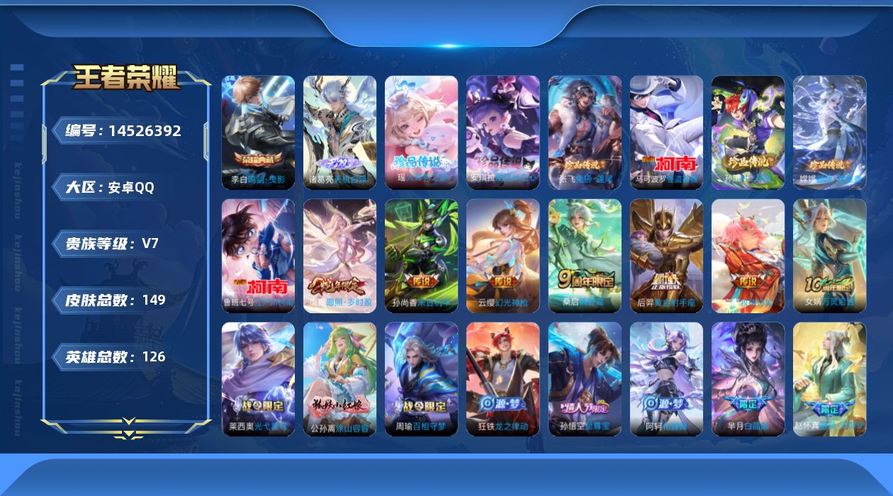 [14526392]贵族7-贵族积分35739-棉花糖聚会天幕-149皮-1典藏-1无双-7珍品传说-7传说-2全皮-0珍品无双-7改名卡 安卓手q498区 营地id1785951920绝世王者【珍品传说皮肤】:兔狲·蓬尾大耳狗之梦酷洛米之心时之奇旅器灵·落星盏怪盗基德江户川柯南【无双皮肤】:天机白泽【荣耀典藏】:鸣剑·曳影【优质限定皮肤】:至尊宝【传说皮肤】:神树通天黄金射手座