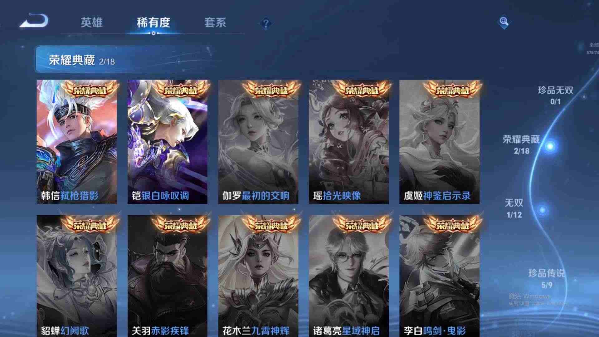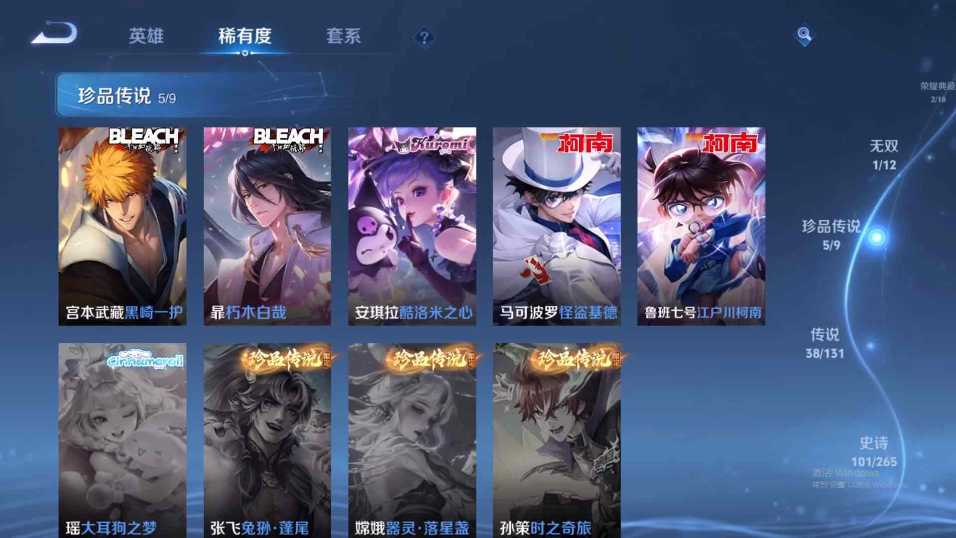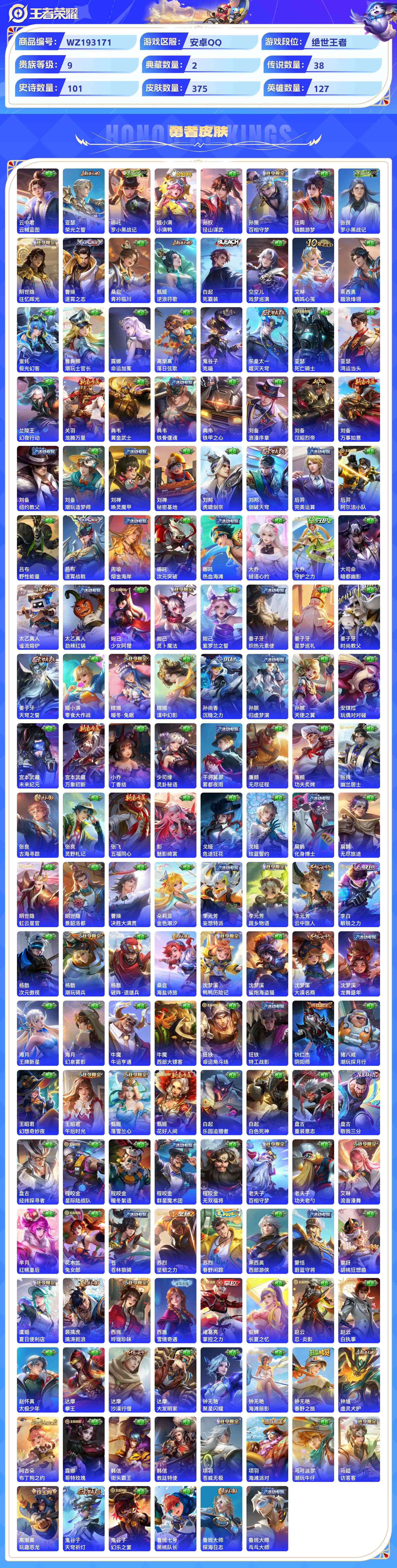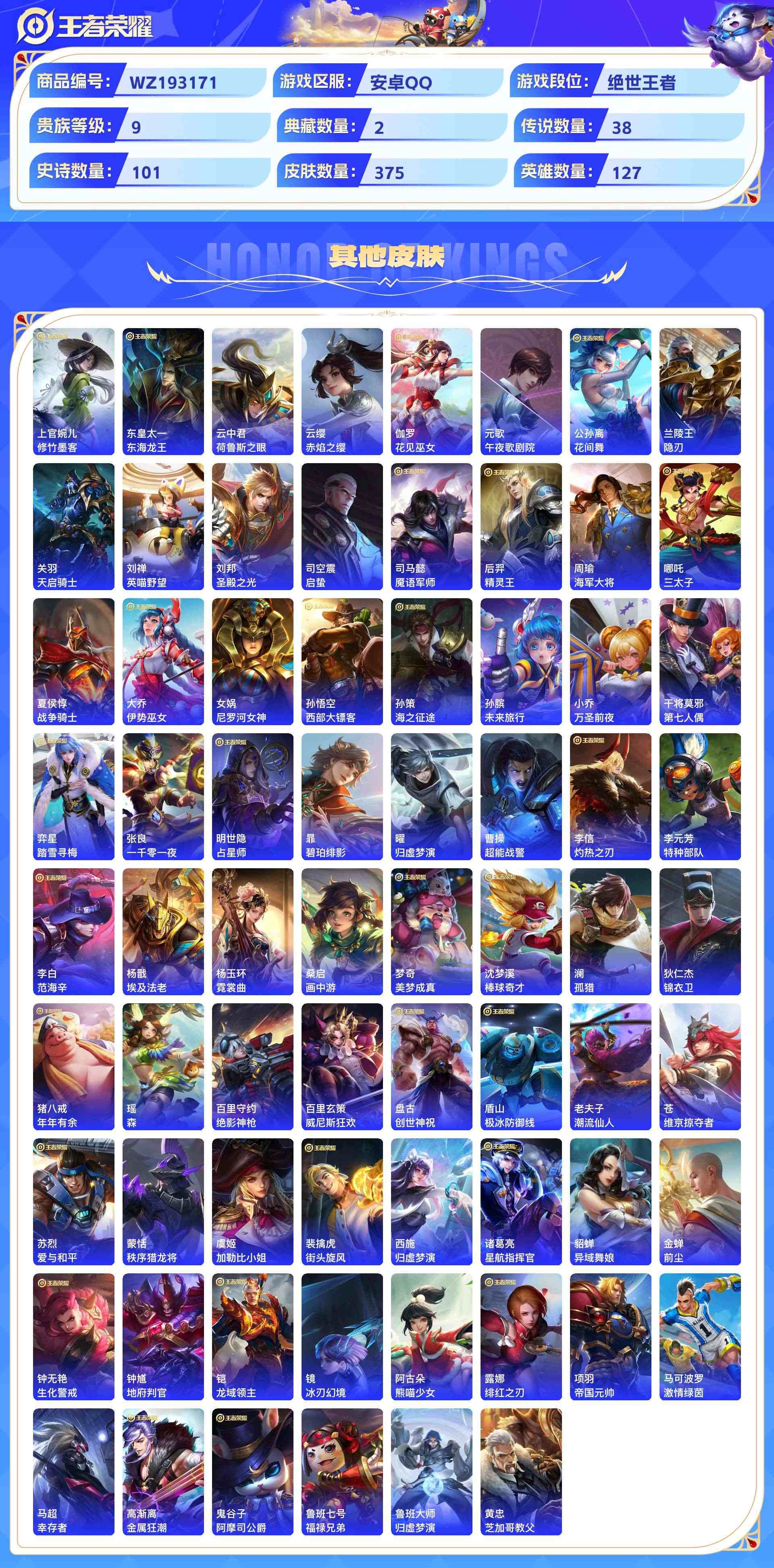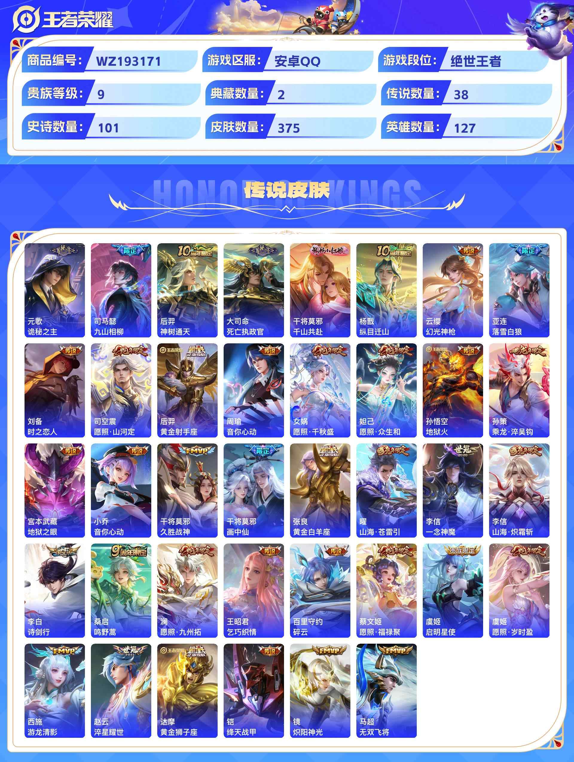 wz193171|精品号安卓qq 贵族9级 375皮 2典藏(银白咏叹调弑呛猎影) 5珍品传说(黑崎一护朽木白哉酷洛米之心怪盗基德江户川柯南) 1无双(天机白泽) 38传说 (诡秘之主九山相柳神树通天)101史诗2星传说(幽冥之眼 幽冥火)33个性按键