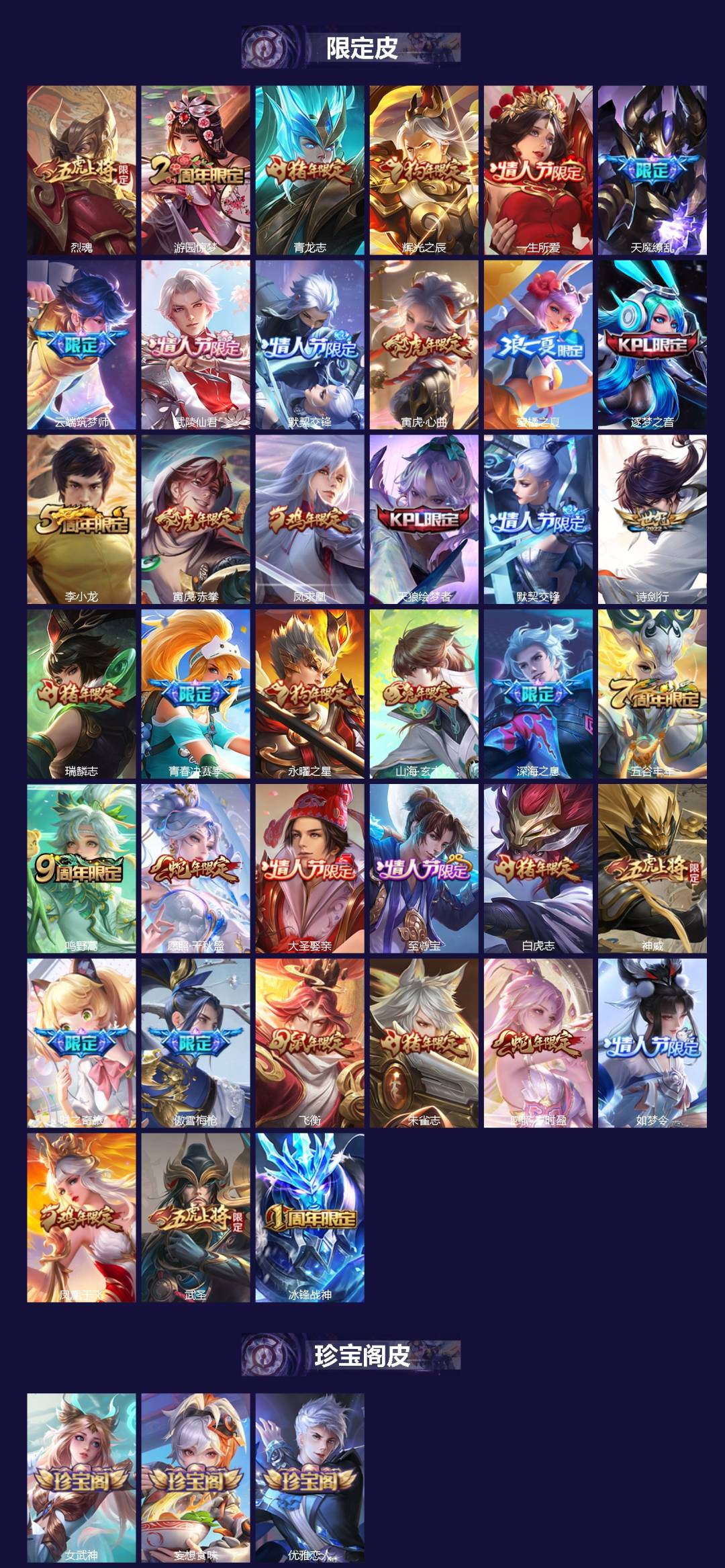 v10 3典藏 2无双 1珍品传说 34传说 127英雄 370皮肤 可修改实名 【英雄全皮】:蒙恬全皮敖隐全皮狂铁全皮影全皮 【稀有英雄】:敖隐小龙人大司命嬴政始皇帝韩信韩跳跳夏洛特夏师傅艾琳橘右京橘子娜可露露鸟人不知火舞赵云金蝉唐僧戈娅