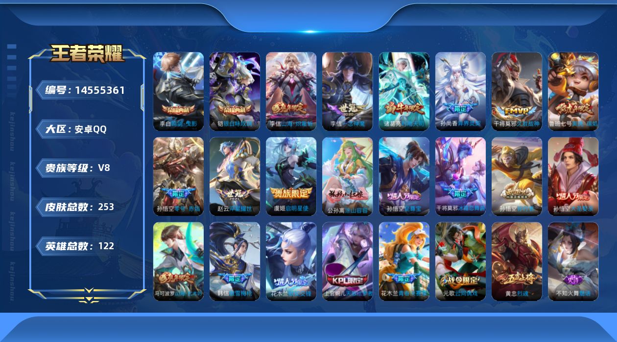 [14555361]v8 2典藏 9传说 122英雄 253皮肤 可修改实名 【英雄全皮】:李信全皮蒙恬全皮 【稀有英雄】:大司命韩信韩跳跳夏洛特夏师傅艾琳橘右京橘子娜可露露鸟人不知火舞赵云金蝉唐僧戈娅 【荣耀水晶】:鸣剑·曳影银白咏叹调倪克斯侍卫 【传说皮】:山海·炽霜斩李信年限零号·赤焰一念神魔淬星耀世久胜战神 【珍宝阁皮】:胡桃夹子玩趣恶龙 【赛季/战令皮】:古海寻踪s33星界游侠海盐诗旅s30擒涛扼浪s31探海日志s32顽趣-梦奇剑破天穹s35天穹祈灯s34暖冬·兔眠狰s8饕餮s9烛龙s10重明s11穷奇s12御狮s13御霄s14御旌s15御銮s16朔风刀s17混沌棋s18疑决卦s19醍醐杖s20原初探秘者s21万华元夜s22演武夺筹s23驱傩正仪s24千军破阵s25神迹守卫-钟馗狮舞东方星空之诺银河之约夺宝奇兵迷踪丽影单词大作战狂想玩偶喵潮玩骑士王云间偶戏星际陆战队-达摩胡桃异想国神迹守卫-墨子航海奇遇记圣弓游侠真爱魔法火炮绅士沙漠行僧s26幻夜卜梦吟游魔法夜都怪侠金庭之子s27电玩高手电玩铁子午后时光大漠名商s28云中旅人s29超时空战士-钟无艳落雪兰心 【史诗皮】:涂山容容紫霞仙子白龙吟黄金分割率千年之狐蒙恬荣光圣徽龙骑士小龙虾冰冠公主偶像歌手魅语猫狗日记-孙策猫狗日记-大乔乱世虎臣节奏热浪修罗女仆咖啡水果甜心天才门将功夫厨神德古拉伯爵鬼剑武藏心灵战警舞动绿茵地狱岩魂纤云弄巧繁星吟游呼啦呼啦拒霜思缤纷独角兽乘风破浪水晶猎龙者曙光守护者金属风暴原初追逐者圣诞狂欢圣诞恋歌鹰眼统帅王者之锤魅力维加斯黎明之约未来纪元-赵云 【限定皮】:至尊宝异界灵契白毛香傲雪梅呛时雨天司水龙头飞衡韩信年限高山流水五谷丰年游园惊梦梁祝烈魂天狼绘梦者李小龙逐梦之影如梦令-后羿霸王别姬-虞姬默契交锋-花木兰孙行者大圣娶亲青春决赛季冰霜恋舞曲寅虎·瑞焰虎皮蛋子寅虎·心曲虎婆山