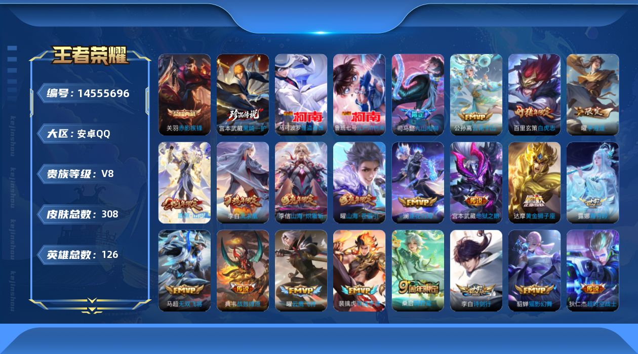 [14555696]v8 1典藏 3珍品传说 22传说 126英雄 308皮肤 可修改实名 【英雄全皮】:鬼谷子全皮钟馗全皮 【稀有英雄】:敖隐小龙人大司命韩信韩跳跳夏洛特夏师傅艾琳橘右京橘子娜可露露鸟人不知火舞赵云金蝉唐僧戈娅 【荣耀水晶】:赤影疾锋 【珍品传说】:江户川柯南怪盗基德黑崎一护 【传说皮】:典韦战鼓燎原云诺千山九山相柳祥瑞亨通李山海·炽霜斩李信年限黄金狮子座地狱之眼冠军飞将猫影幻舞云鹰飞将小将军无双飞将超时空战士-狄仁杰山海·苍雷引电光曜子霜月吟澜逐花归海 【珍宝阁皮】:胡桃夹子蔷薇恋人 【赛季/战令皮】:噬灭天穹s37古海寻踪s33星界游侠海盐诗旅s30擒涛扼浪s31潮玩骑兵探海日志s32玲珑珍味顽趣-梦奇剑破天穹s35天穹祈灯s34天穹之誓s36暖冬·兔眠妖精王s5炼金王s6凯尔特女王s7狰s8饕餮s9烛龙s10穷奇s12御霄s14御旌s15御銮s16朔风刀s17混沌棋s18疑决卦s19醍醐杖s20原初探秘者s21万华元夜s22演武夺筹s23驱傩正仪s24朔望之晖蓝屏警告神迹守卫-钟馗狮舞东方赤莲之焰驯魔猎人星空之诺银河之约迷踪丽影西部大镖客-猪八戒暗影游猎游乐娃子单词大作战狂想玩偶喵潮玩骑士王云间偶戏星际陆战队-达摩胡桃异想国幻夜卜梦云中旅人s29 【史诗皮】:赞萌露比灵蛊蚀心器灵·浮梦炉化蝶舞鸭鸭历险记-刘禅龙之律动百相守梦-周瑜百相守梦-黄忠茶境仙星界战将百相守梦-百里守约谪仙醉月星界特工破空之剑涂山容容万灵启世紫霞仙子黄金分割率特工魅影千年之狐永昼蒙恬荣光圣徽龙骑士小龙虾冰冠公主偶像歌手晚萤无限星赏官暗夜猫娘猫狗日记-孙策时之恋人-孙尚香节奏热浪修罗摇滚巨星水果甜心星夜王子功夫厨神暗隐猎兽者幽灵船长鬼剑武藏心灵战警乐园奇幻夜天秀·启明舞动绿茵地狱岩魂纤云弄巧繁星吟游呼啦呼啦缤纷独角兽乘风破浪逐浪之夏龙鼓争鸣曙光守护者箭羽风息原初追逐者圣诞狂欢