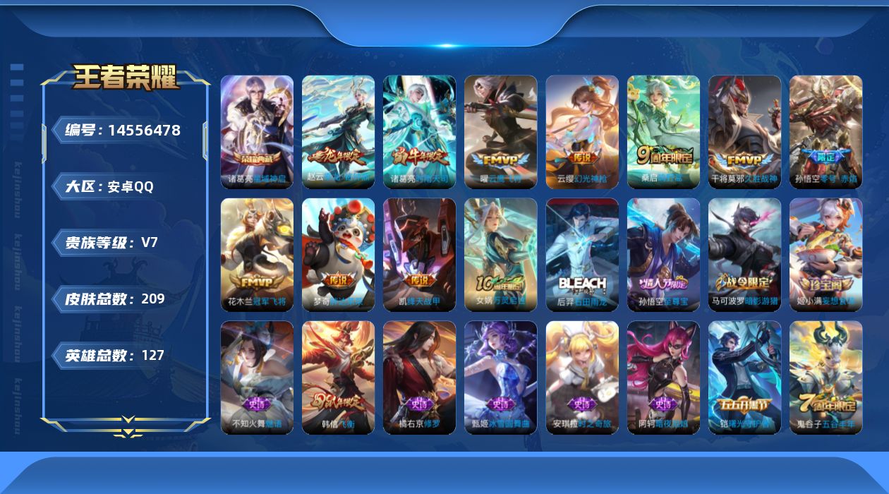 [14556478]v7 1典藏 11传说 127英雄 209皮肤 可修改实名 【稀有英雄】:敖隐小龙人大司命嬴政始皇帝韩信韩跳跳夏洛特夏师傅艾琳橘右京橘子娜可露露鸟人不知火舞赵云金蝉唐僧戈娅 【荣耀水晶】:星域神启倪克斯贼亮 【传说皮】:乘龙·铭钟鼎赵云年限神树通天幻光神呛零号·赤焰冠军飞将久胜战神云鹰飞将小将军胖达荣荣绛天战甲鸡嘴战神 【珍宝阁皮】:妄想食味优雅恋人女武神 【赛季/战令皮】:噬灭天穹s37古海寻踪s33星界游侠海盐诗旅s30擒涛扼浪s31潮玩骑兵奇幻香踪探海日志s32剑破天穹s35天穹祈灯s34天穹之誓s36暖冬·兔眠醍醐杖s20原初探秘者s21万华元夜s22演武夺筹s23驱傩正仪s24千军破阵s25暗影游猎游乐娃子沙漠行僧s26金庭之子s27大漠名商s28云中旅人s29超时空战士-钟无艳落雪兰心 【史诗皮】:石田雨龙万灵启世苍穹之光黄金分割率特工魅影千年之狐江河有灵百解令蒙犽龙骑士小龙虾青蛇魅语电玩·爆裂旋风暗夜猫娘末日机甲-吕布猫狗日记-孙策节奏热浪修罗女仆咖啡水果甜心天才门将星夜王子心灵骇客时之奇旅-安琪拉德古拉伯爵暗隐猎兽者幽灵船长鬼剑武藏舞动绿茵地狱岩魂纤云弄巧拒霜思逐浪之夏水晶猎龙者曙光守护者唤灵魅影箭羽风息金属风暴圣诞恋歌鹰眼统帅魅力维加斯未来纪元-赵云 【限定皮】:鸣野蒿至尊宝时雨天司水龙头飞衡韩信年限五谷丰年梁祝天狼溯光者 【普通皮】:熔金海岸苍林狼骑谧流熔炉雾都夜雨敬我三分劲辣红锅春野之旅龙舞盛年功夫炙烤街头霸王雪境奇遇-西施星梦巡礼逆浪荇歌鹤鸣心笺荣光之誓踏浪烽翎罗小黑战记小满鸭景韶洛都玫蓝誓约虚灵犬护浪漫序章灵野札记布丁狗之约命运加冕聚星闪耀潮玩造梦师太极少年妄想特派热血海滩破局者尼罗河女神完美运算鬼谷子天穹祈灯s34蔚蓝守将万事如意龙腾万里花好人间归虚梦演-孙膑归虚梦演-曜海滩丽影海滩派对皇家上将魔术师沉稳之力掌控之力坚韧之力敏锐