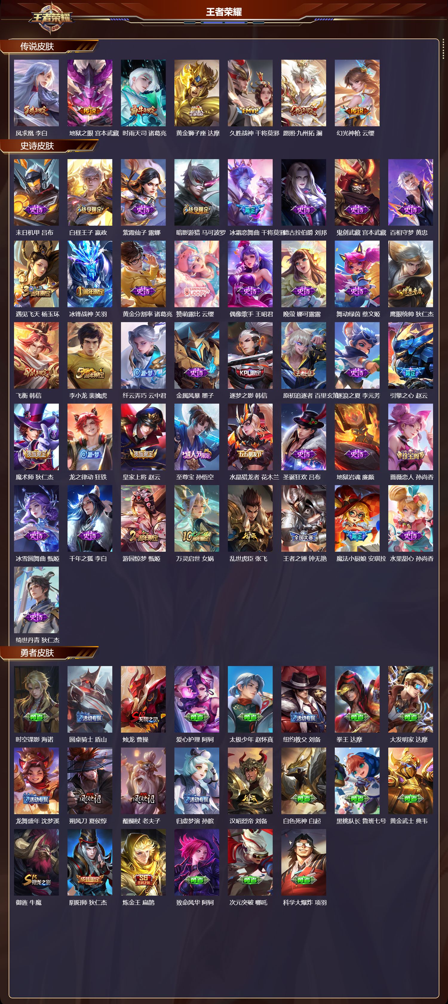 安卓qq/荣耀王者/216皮肤/126英雄/0典藏/0珍品无双/0无双/0珍品传说/7传说/41史诗/8稀有英雄【7 传说皮肤】凤求凰 李白地狱之眼 宫本武藏时雨天司 诸葛亮黄金狮子座 达摩久胜战神 干将莫邪愿照·九州拓 澜幻光神呛 云缨【41 史诗皮肤】末日机甲 吕布白昼王子 嬴政紫霞仙子 露娜暗影游猎 马可波罗冰霜恋舞曲 干将莫邪德古拉伯爵 刘邦鬼剑武藏 宫本武藏百