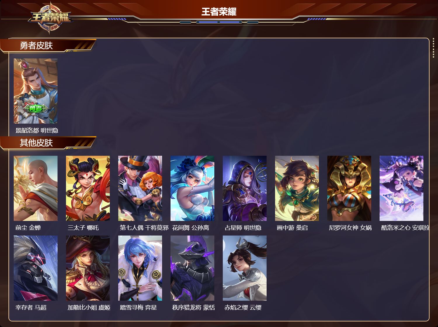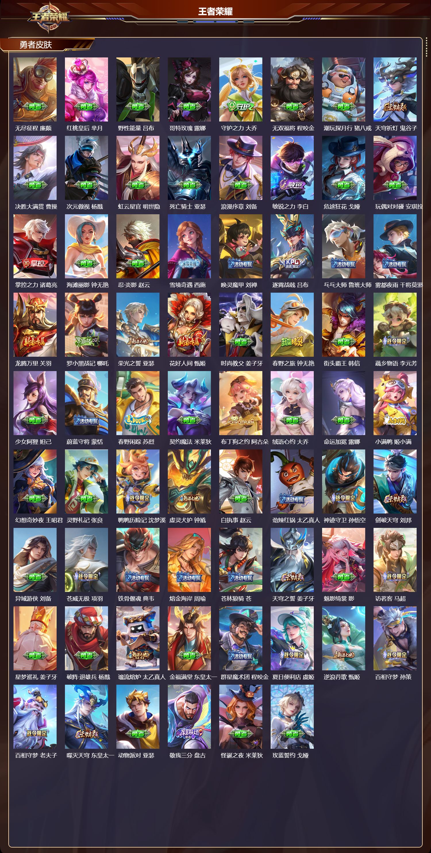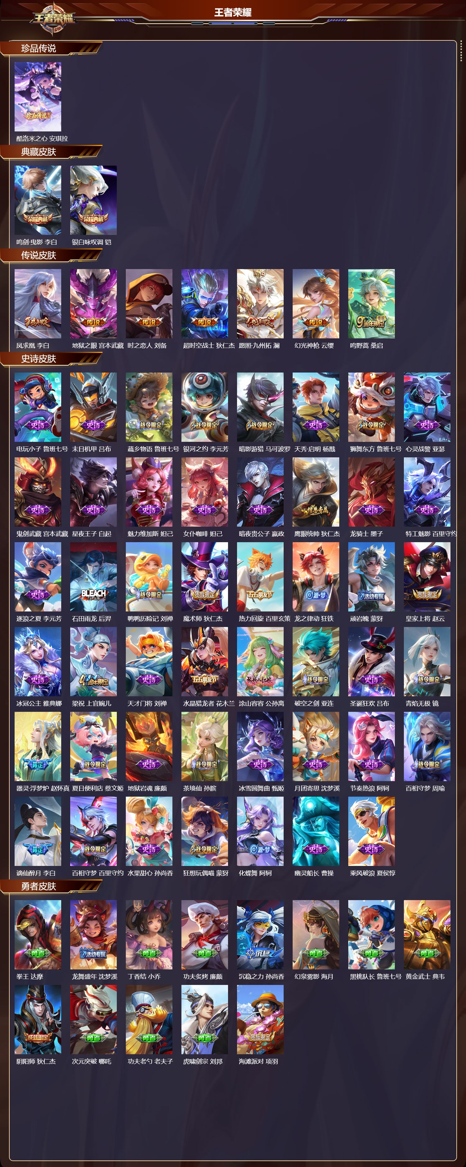 苹果qq/非凡王者/154皮肤/125英雄/2典藏/0珍品无双/0无双/1珍品传说/7传说/47史诗/8稀有英雄【1 珍品传说】酷洛米之心 安琪拉【2 典藏皮肤】鸣剑·曳影 李白银白咏叹调 铠【7 传说皮肤】凤求凰 李白地狱之眼 宫本武藏时之恋人 刘备超时空战士 狄仁杰愿照·九州拓 澜幻光神呛 云缨鸣野蒿 桑启【47 史诗皮肤】电玩小子 鲁班七号末日机甲