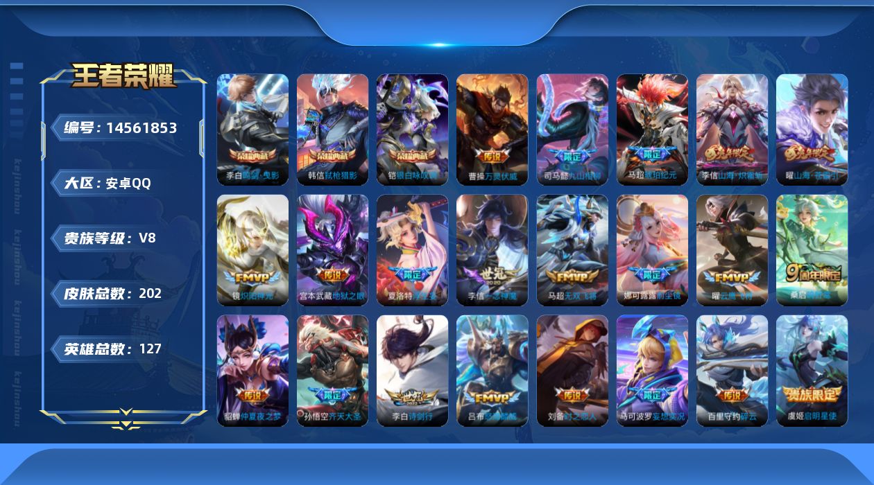v8 3典藏 24传说 127英雄 202皮肤 可修改实名 【英雄全皮】:李信全皮敖隐全皮孙权全皮金蝉全皮司马懿全皮 【稀有英雄】:敖隐小龙人大司命嬴政始皇帝韩信韩跳跳夏洛特夏师傅艾琳橘右京橘子娜可露露鸟人不知火舞赵云金蝉唐僧戈娅 【荣耀水