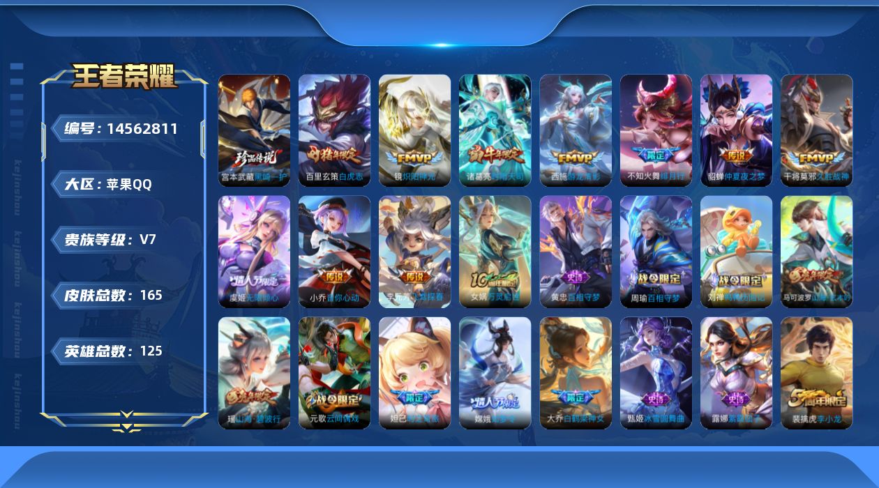 [14562811]v7-125英雄-165皮肤-1珍品传说-10传说-46史诗,,小国元芳战力11000,戈娅省6战力11000,虞姬省50战力9600,星币4000,积分夺宝249抽, 【英雄全皮】:空空儿全皮 【珍品传说】:宫本武藏黑崎一护 【传说皮肤】:虞姬无限倾心,不知火舞绯月行,西施游龙清影,小乔音你心动,李元芳飞鸢探春,诸葛亮时雨天司,镜炽阳神光,干将莫邪久胜战神,百里玄策白虎志,貂蝉仲夏夜之梦 【限定皮肤】:白起狰,狄仁杰阴阳师,小乔纯白花嫁,虞姬凯尔特女王,赵云皇家上将,妲己时之奇旅,庄周云端筑梦师,孙膑天狼运算者,扁鹊炼金王,芈月重明,元歌云间偶戏,夏侯惇朔风刀,典韦穷奇,马可波罗山海玄木吟,狄仁杰魔术师,狄仁杰万华元夜,项羽海滩派对,老夫子醍醐杖,程咬金演武夺筹,不知火舞绯月行,李元芳云中旅人,虞姬霸王别姬,虞姬无限倾心,钟馗驱傩正仪,雅典娜单词大作战,蔡文姬繁星吟游,太乙真人饕餮,鬼谷子原初探秘者,鬼谷子五谷丰年,诸葛亮时雨天司,大乔白鹤梁神女,百里玄策白虎志,弈星混沌棋,沈梦溪大漠名商,明世隐疑决卦,裴擒虎李小龙,裴擒虎擒涛扼浪,狂铁御狮,米莱狄御霄,瑶山海碧波行,云中君纤云弄巧,伽罗天狼溯光者,盾山御銮,上官婉儿梁祝,上官婉儿神器万象笔,嫦娥如梦令,蒙犽狂想玩偶喵,鲁班大师探海日志,桑启海盐诗旅,艾琳女武神,张良古海寻踪,蒙恬荣光圣徽,鬼谷子天穹祈灯,刘邦剑破天穹 【年限皮肤】:百里玄策白虎志,诸葛亮时雨天司,瑶山海碧波行,马可波罗山海玄木吟 【赛季限定】:扁鹊炼金王,白起狰,芈月重明,夏侯惇朔风刀,典韦穷奇,狄仁杰万华元夜,老夫子醍醐杖,程咬金演武夺筹,张良古海寻踪,李元芳云中旅人,虞姬凯尔特女王,钟馗驱傩正仪,太乙真人饕餮,鬼谷子原初探秘者,弈星混沌棋,沈梦溪大漠名商,明世隐疑决卦,裴擒虎擒涛扼浪,狂铁御狮,米莱狄御霄,盾山御銮,鲁班大师探海日志,桑启海盐诗旅,鬼谷子天穹祈灯,蒙恬荣光圣徽,刘邦剑破天穹 【战令限定】:元歌云间偶戏,雅典娜单词大作战,蒙犽狂想玩偶喵 【史诗皮肤】:露娜紫霞仙子,赵云皇家上将,赵云未来纪元,甄姬冰雪圆舞曲,狄仁杰魔术师,孙尚香水果甜心,嬴政摇滚巨星,妲己魅力维加斯,小乔纯白花嫁,曹操幽灵船长,张飞乱世虎臣,虞姬霸王别姬,夏侯惇乘风破浪,小乔缤纷独角兽,兰陵王暗隐猎兽者,诸葛亮黄金分割率,安琪拉心灵骇客,庄周云端筑梦