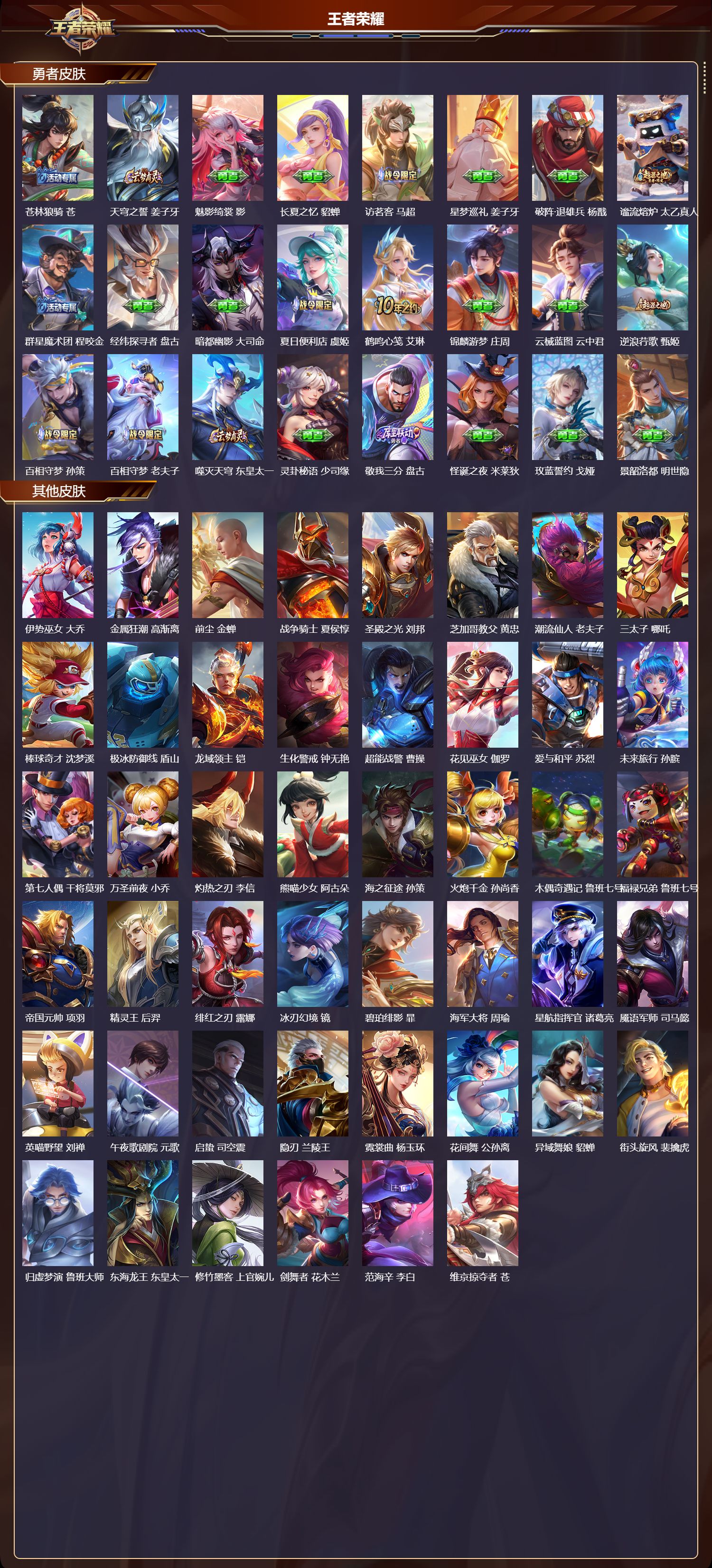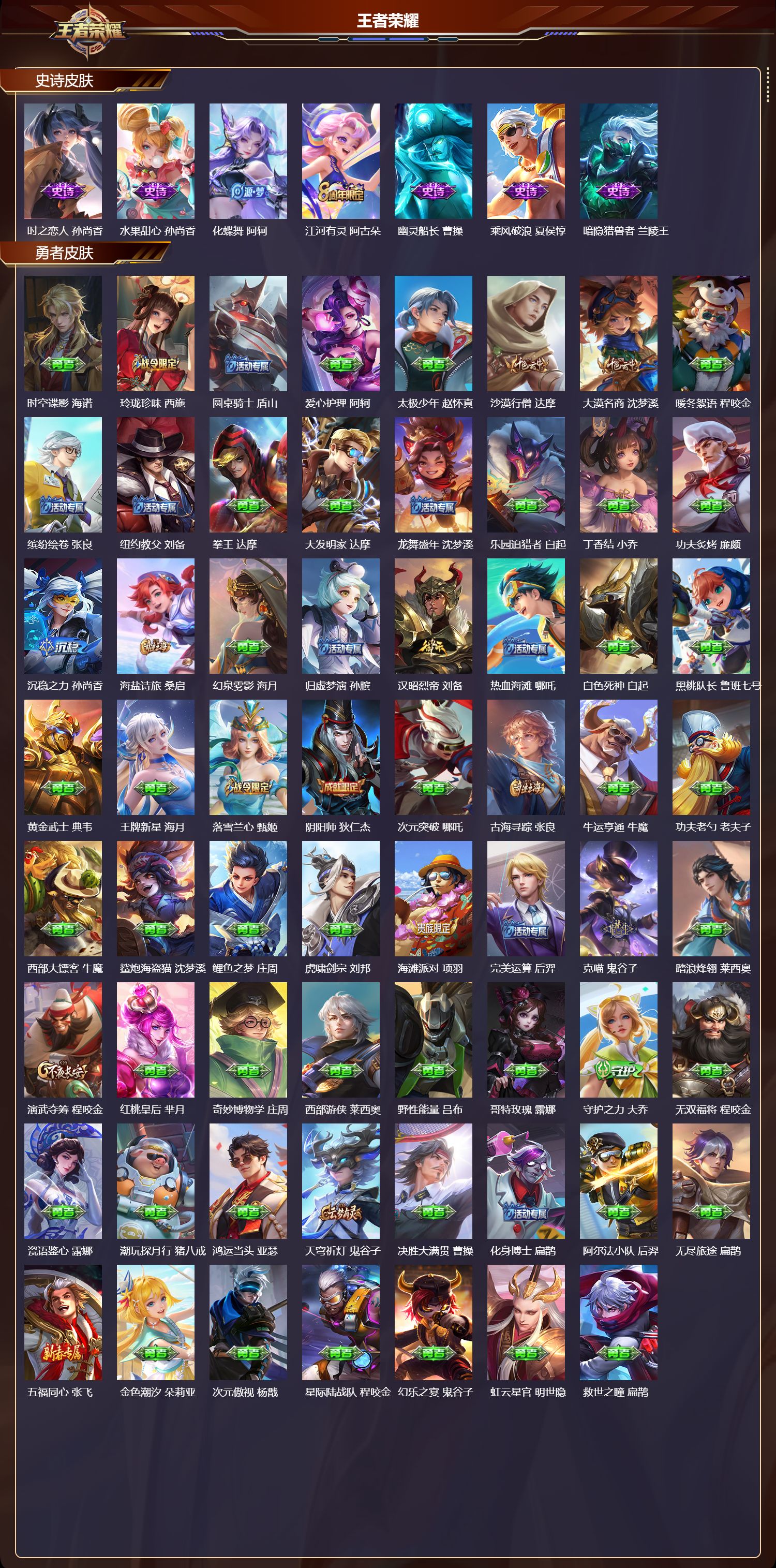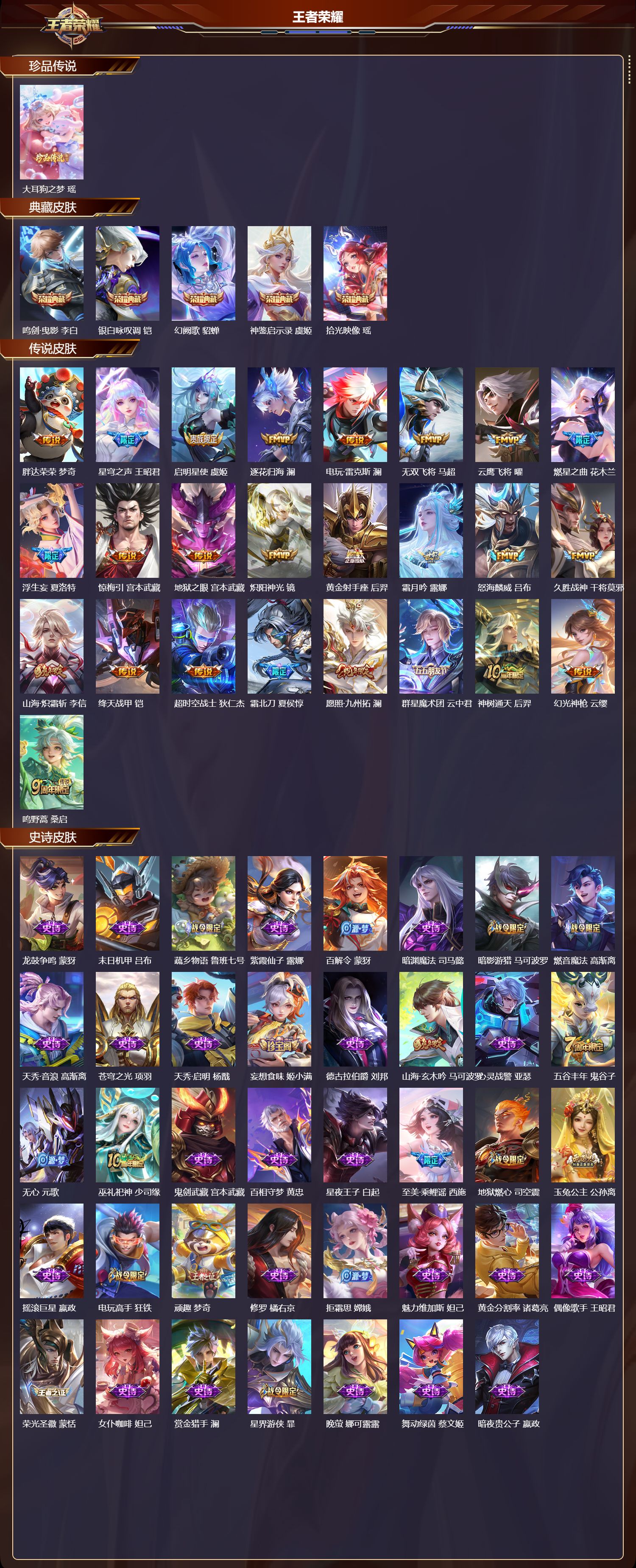 苹果qq/荣耀王者/384皮肤/127英雄/5典藏/0珍品无双/0无双/1珍品传说/25传说/116史诗/9稀有英雄【1 珍品传说】大耳狗之梦 瑶【5 典藏皮肤】鸣剑·曳影 李白银白咏叹调 铠幻阙歌 貂蝉神鉴启示录 虞姬拾光映像 瑶【25 传说皮肤】胖达荣荣 梦奇星穹之声 王昭君启明星使 虞姬逐花归海 澜电玩·雷克斯 澜无双飞将 马超云鹰飞将 曜燃星之