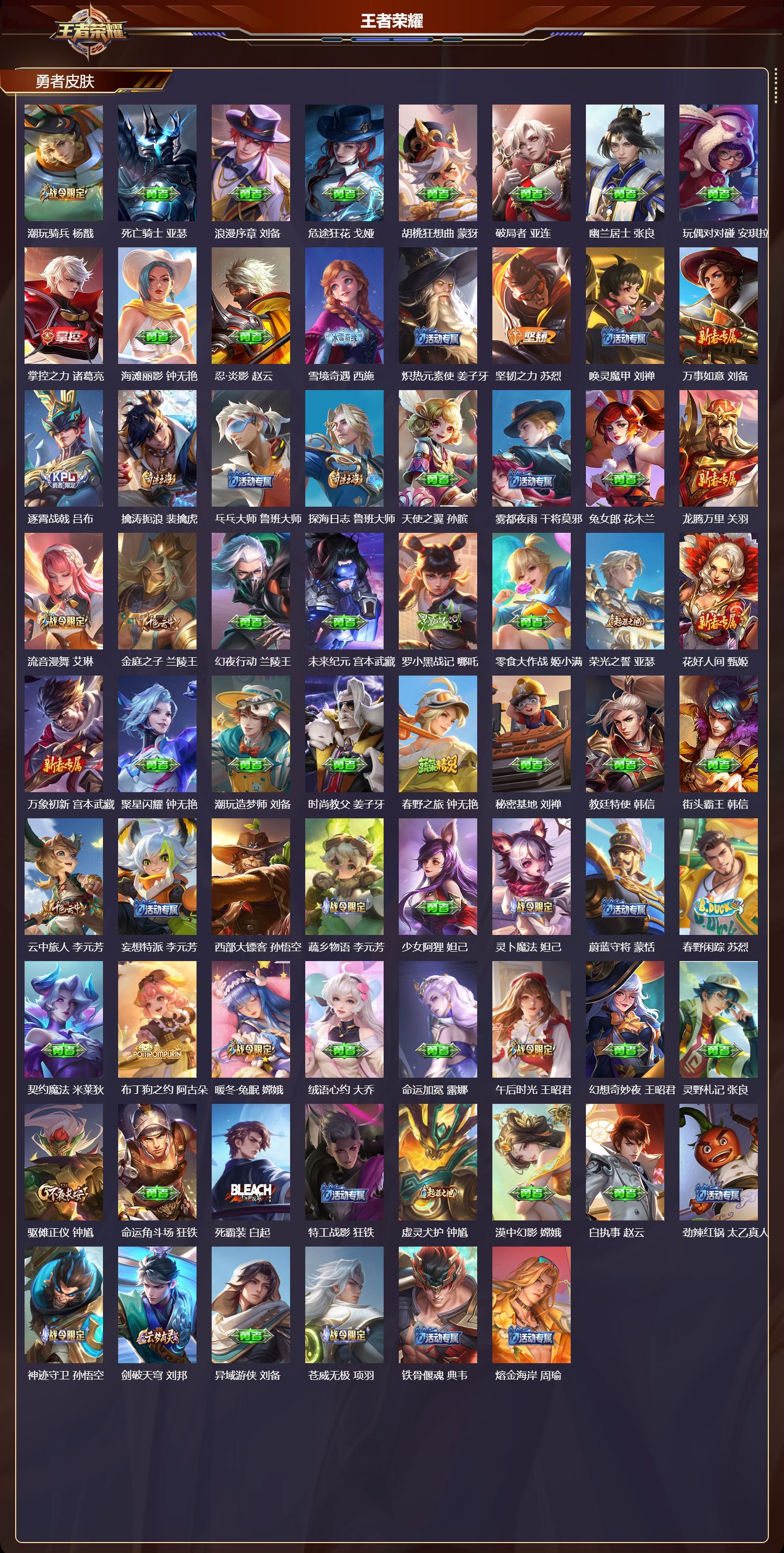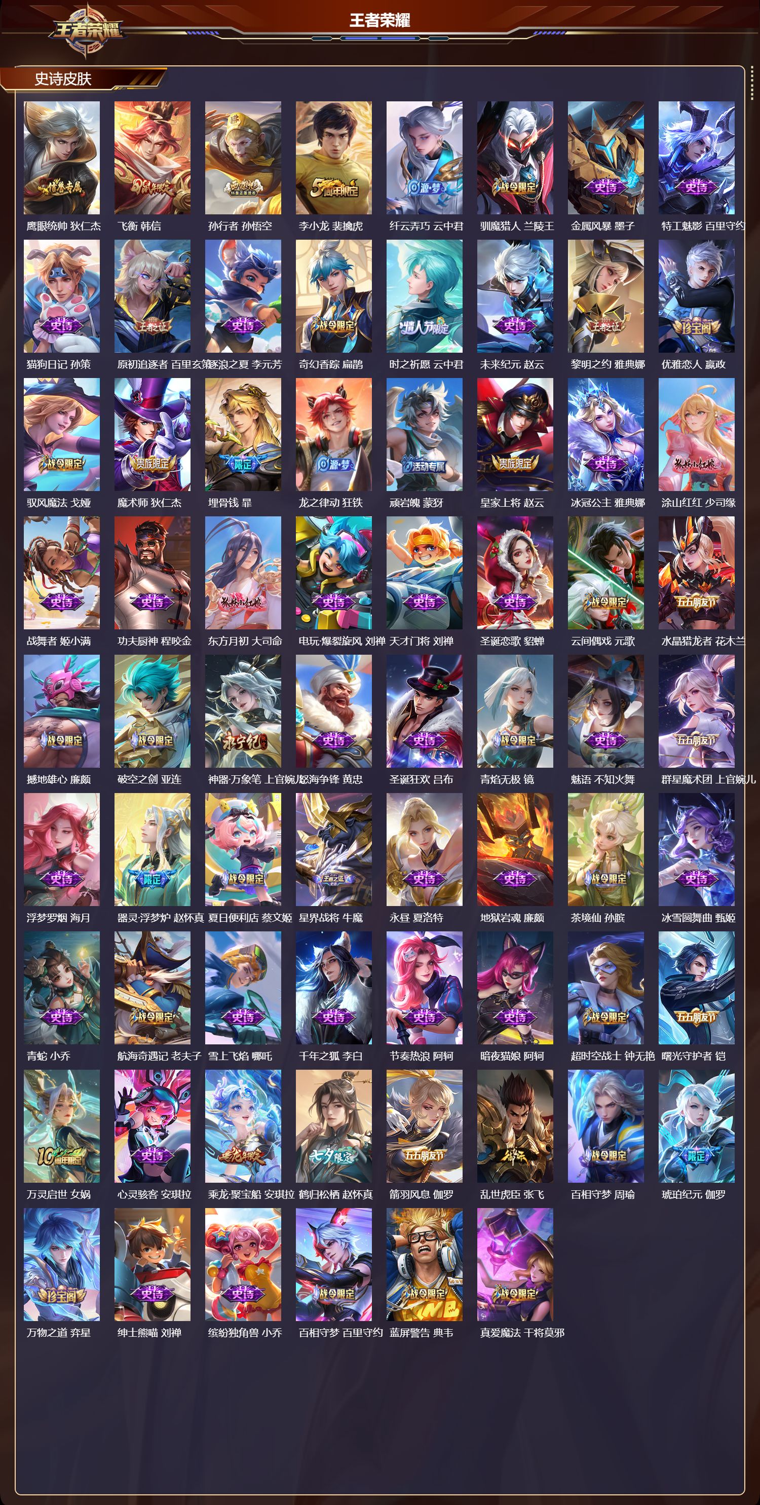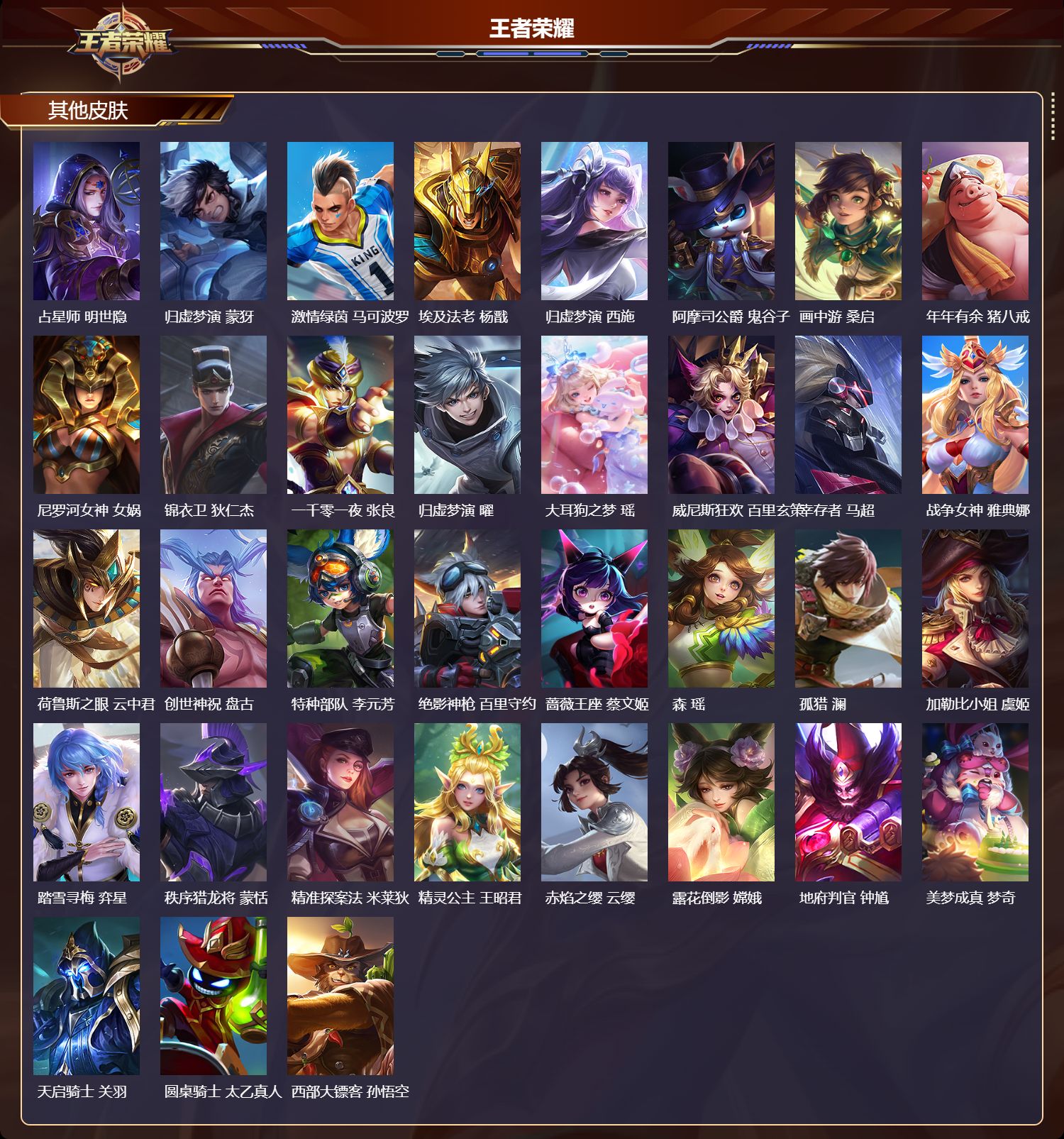 苹果qq/荣耀王者/384皮肤/127英雄/5典藏/0珍品无双/0无双/1珍品传说/25传说/116史诗/9稀有英雄【1 珍品传说】大耳狗之梦 瑶【5 典藏皮肤】鸣剑·曳影 李白银白咏叹调 铠幻阙歌 貂蝉神鉴启示录 虞姬拾光映像 瑶【25 传说皮肤】胖达荣荣 梦奇星穹之声 王昭君启明星使 虞姬逐花归海 澜电玩·雷克斯 澜无双飞将 马超云鹰飞将 曜燃星之