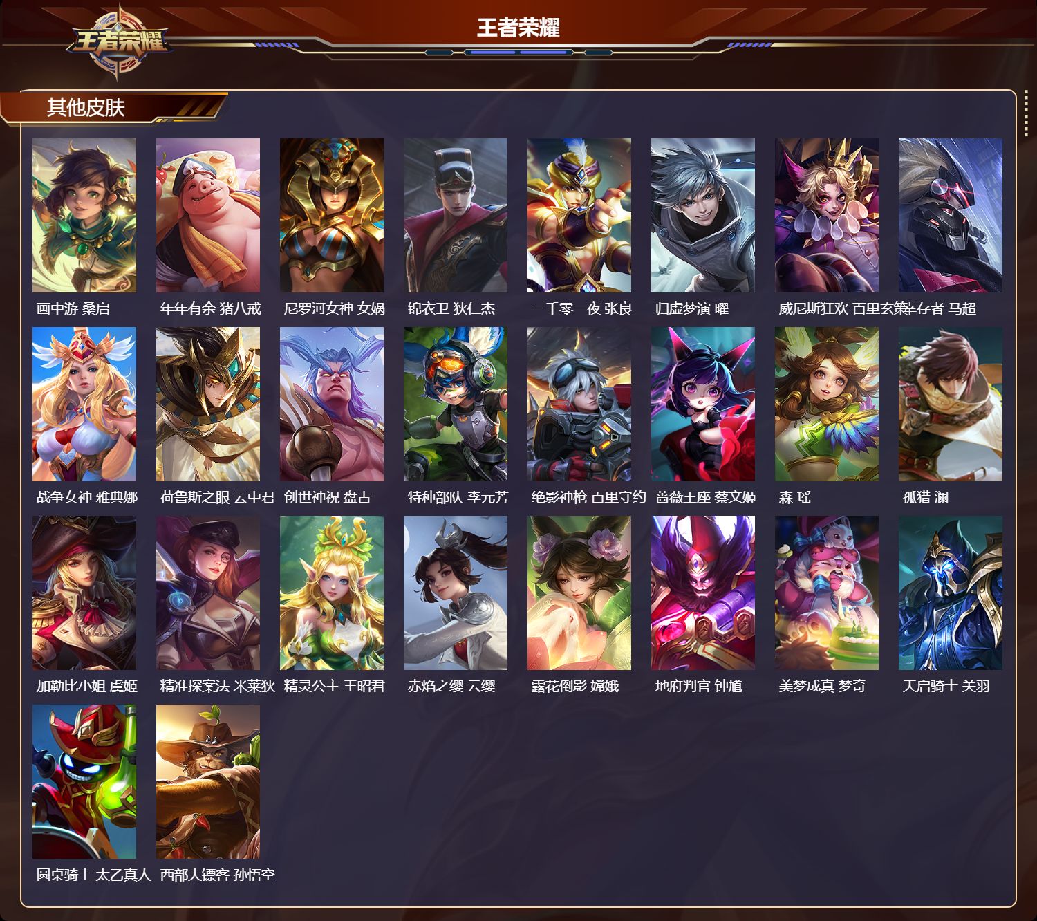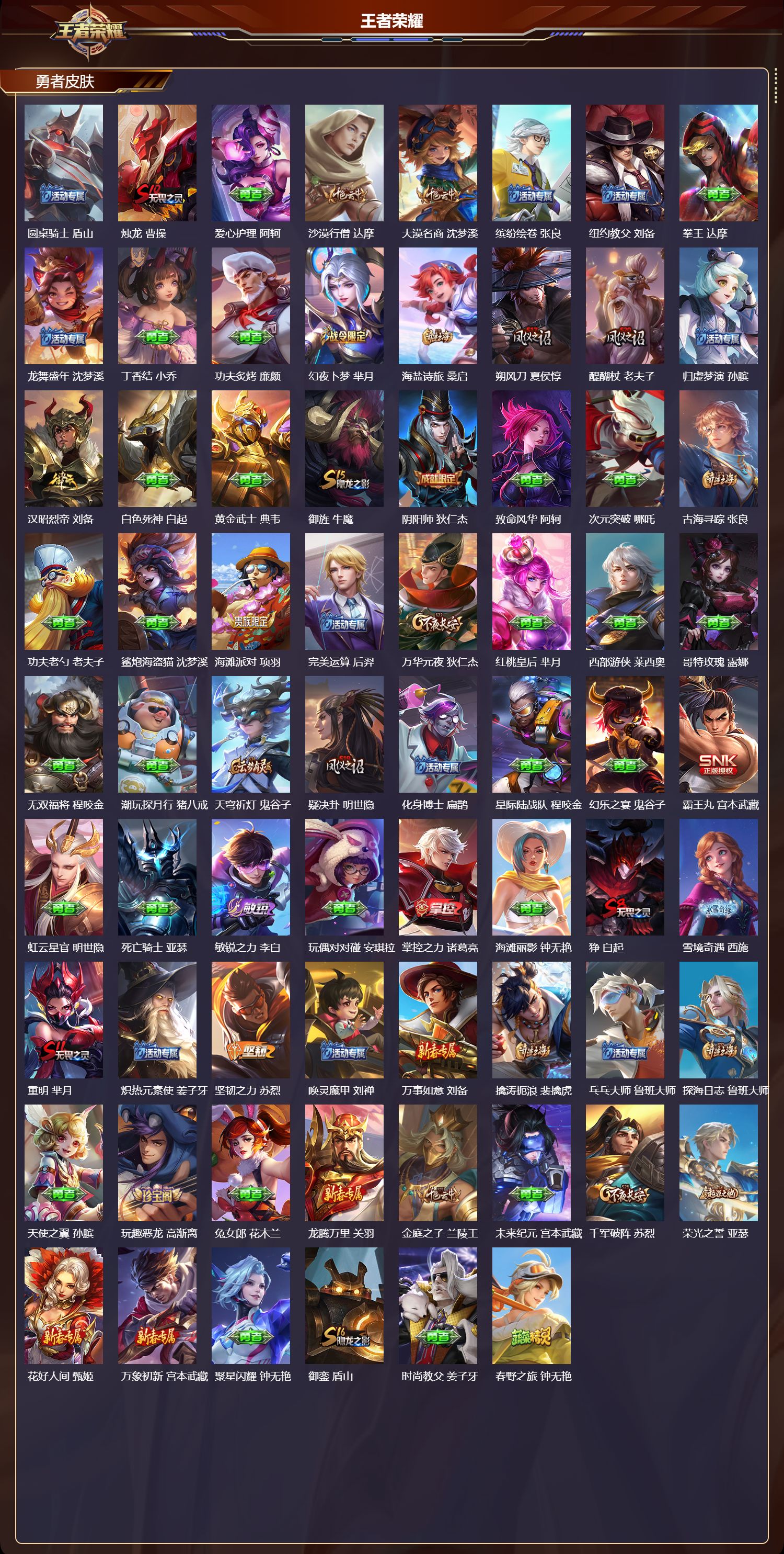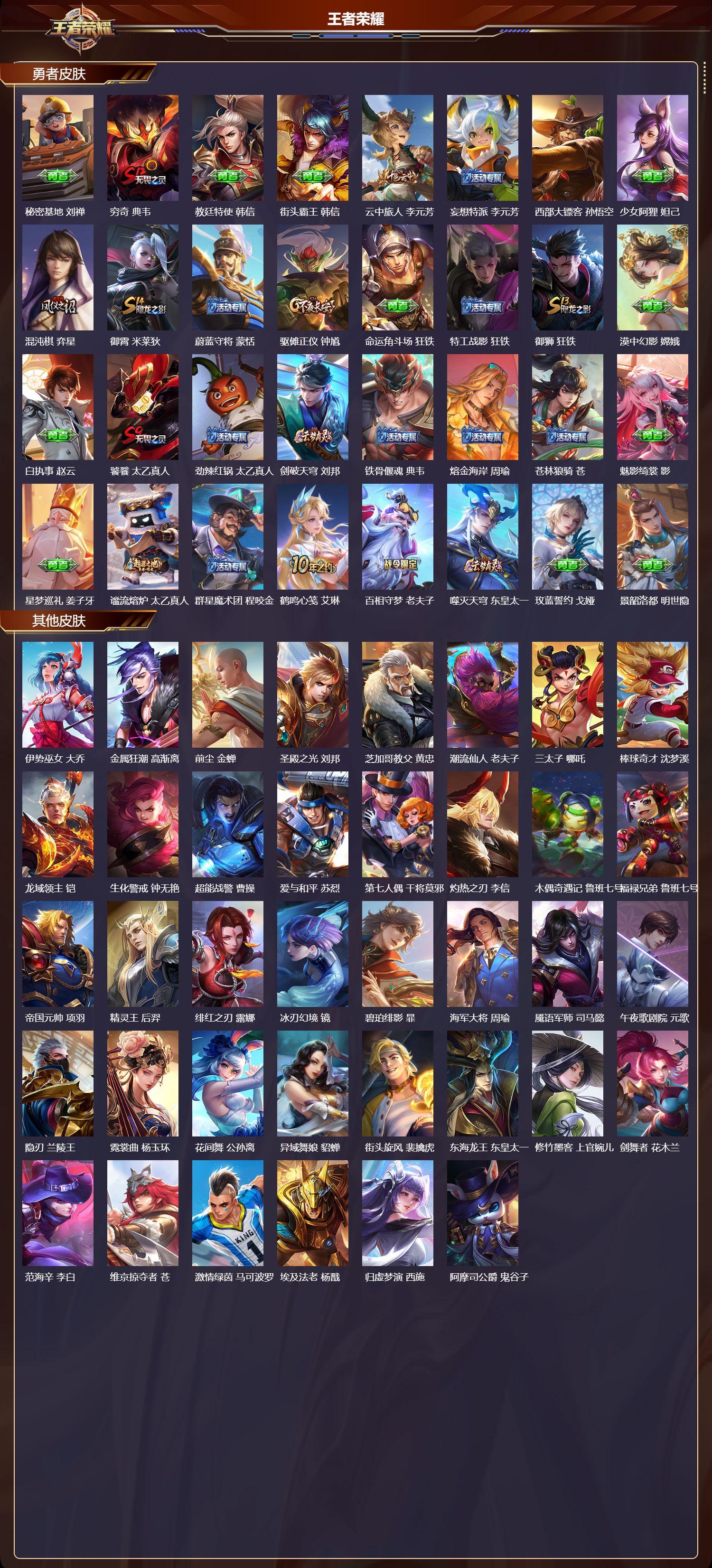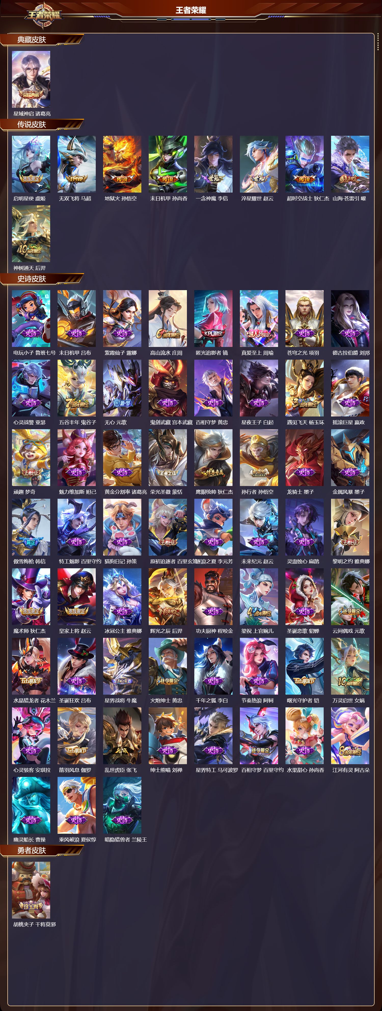 安卓qq/荣耀王者/235皮肤/124英雄/1典藏/0珍品无双/0无双/0珍品传说/9传说/59史诗/8稀有英雄【1 典藏皮肤】星域神启 诸葛亮【9 传说皮肤】启明星使 虞姬无双飞将 马超地狱火 孙悟空末日机甲 孙尚香一念神魔 李信淬星耀世 赵云超时空战士 狄仁杰山海·苍雷引 曜神树通天 后羿【59 史诗皮肤】电玩小子 鲁班七号末日机甲 吕布紫霞仙子 露娜高山流水 庄周