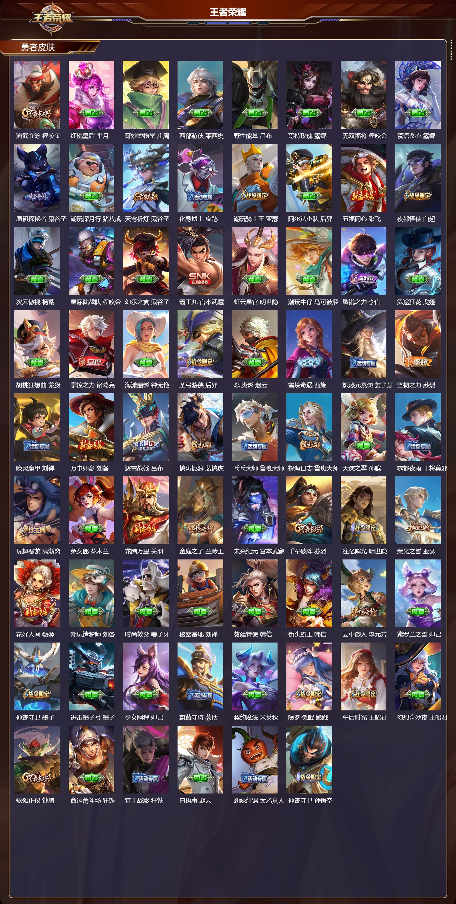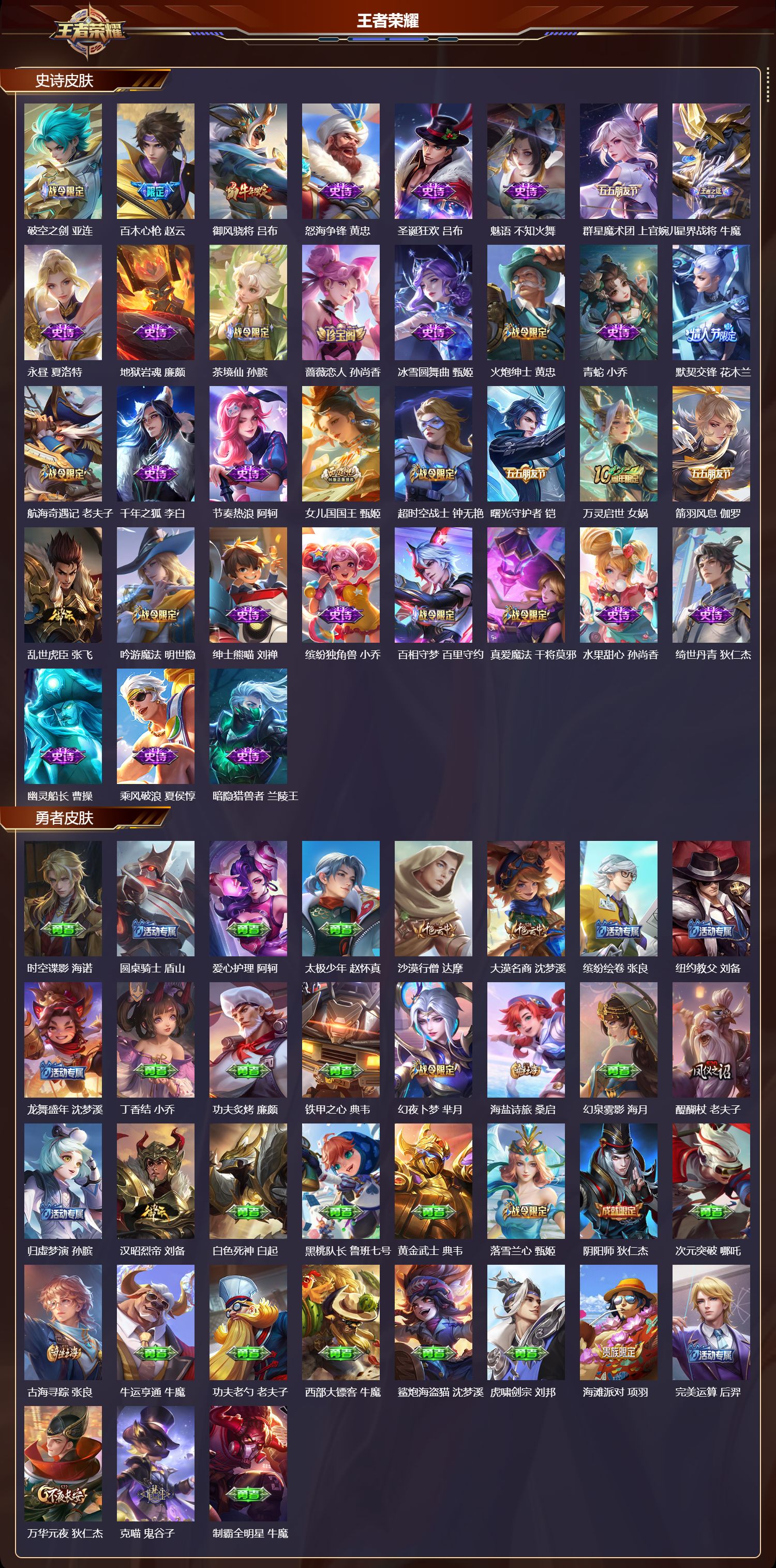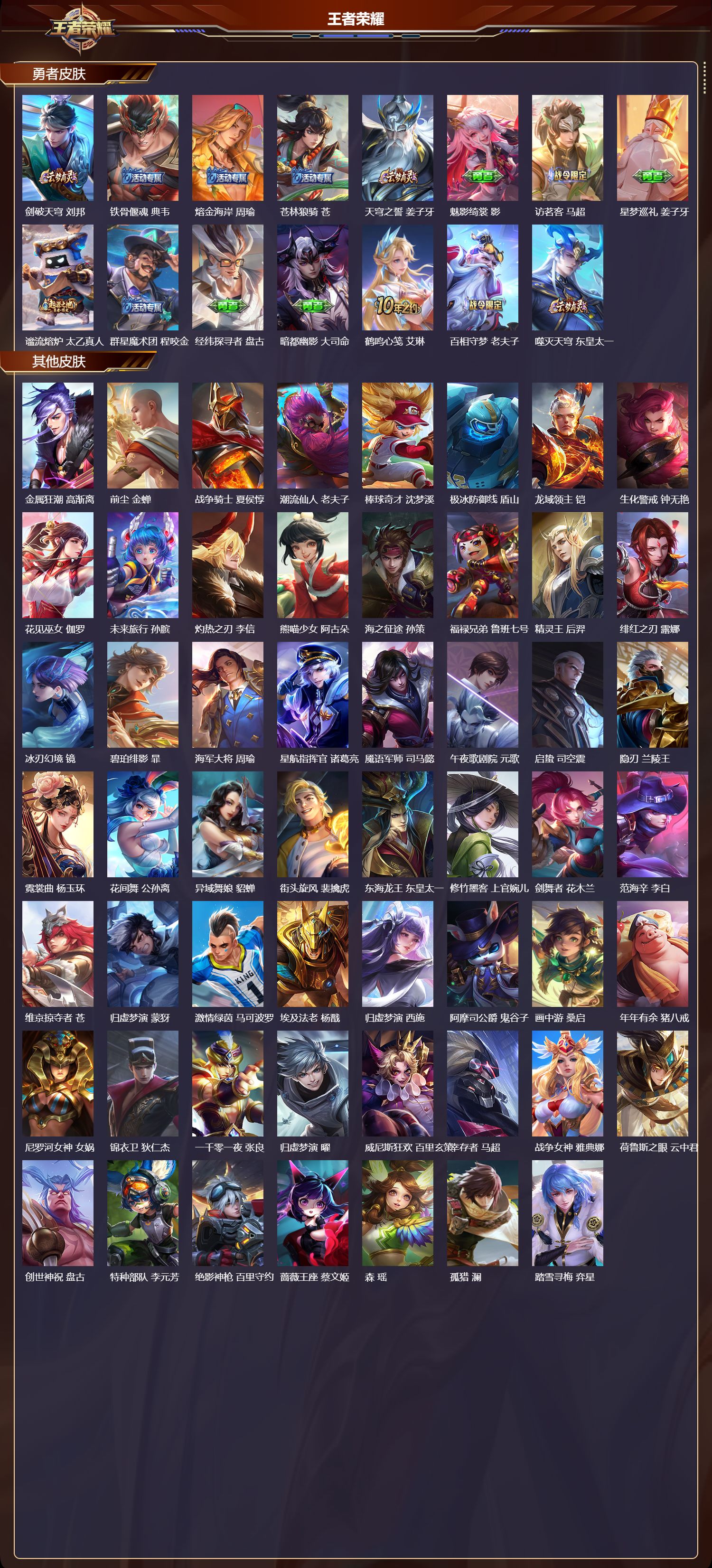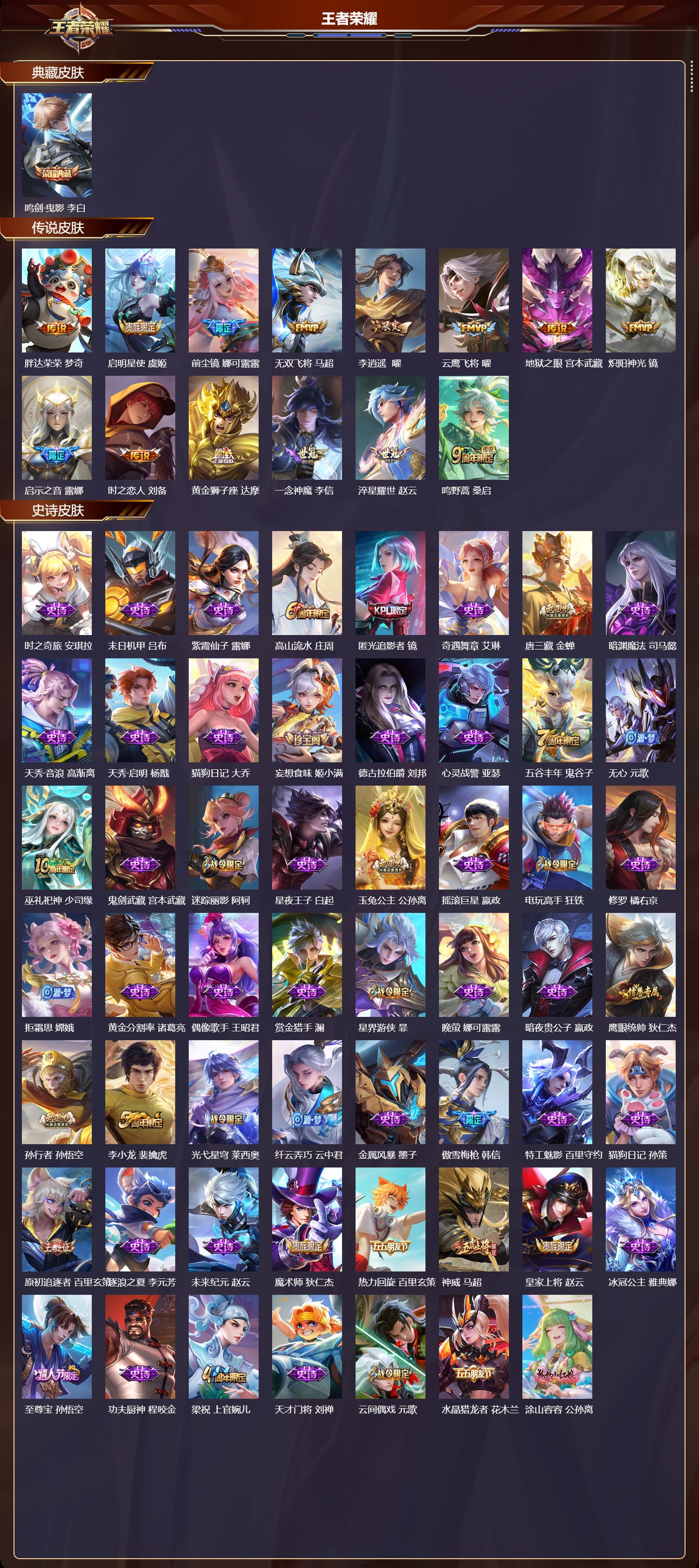 安卓qq/至圣王者/287皮肤/126英雄/1典藏/0珍品无双/0无双/0珍品传说/14传说/90史诗/8稀有英雄【1 典藏皮肤】鸣剑·曳影 李白【14 传说皮肤】胖达荣荣 梦奇启明星使 虞姬前尘镜 娜可露露无双飞将 马超李 曜云鹰飞将 曜地狱之眼 宫本武藏炽阳神光 镜启示之音 露娜时之恋人 刘备黄金狮子座 达摩一念神魔 李信淬星耀世 赵云鸣野蒿 桑启【90 史