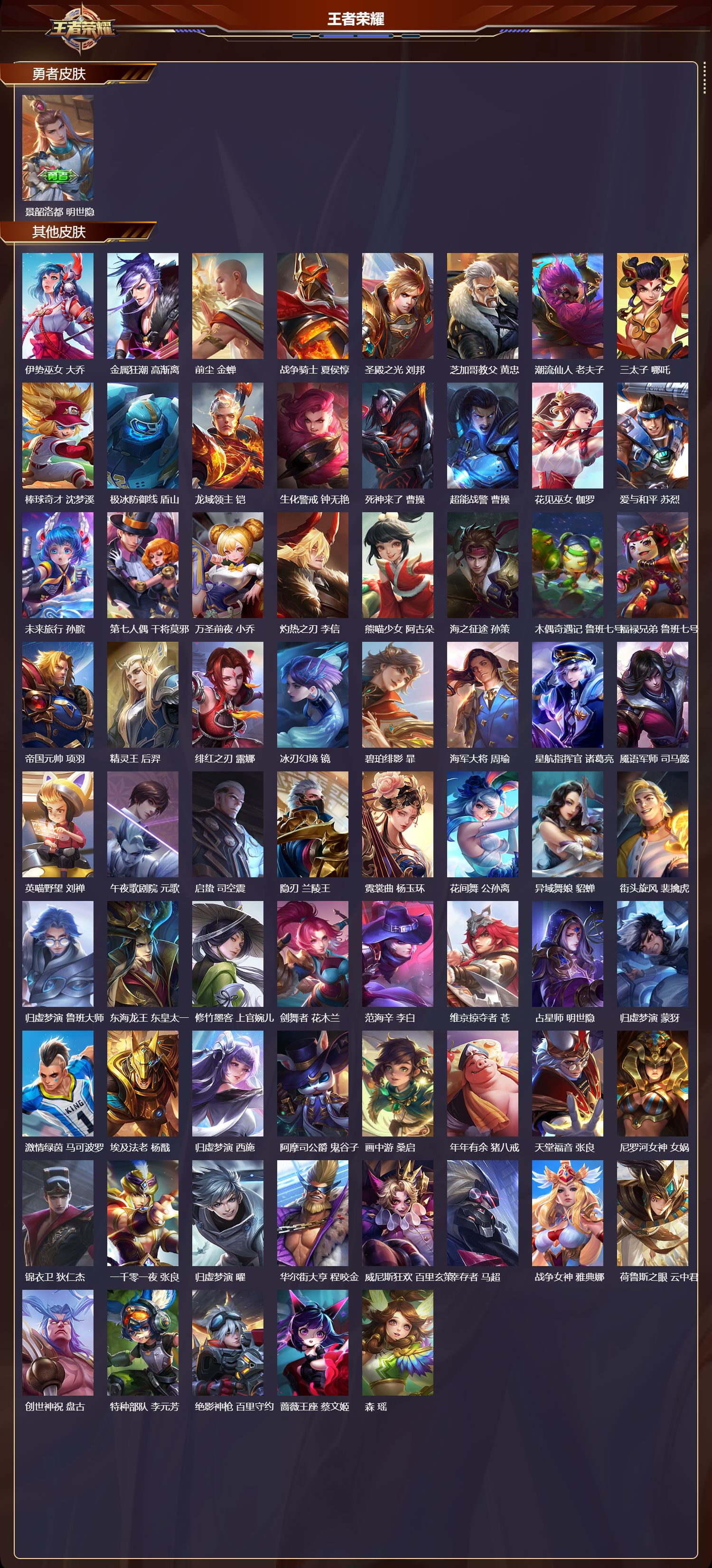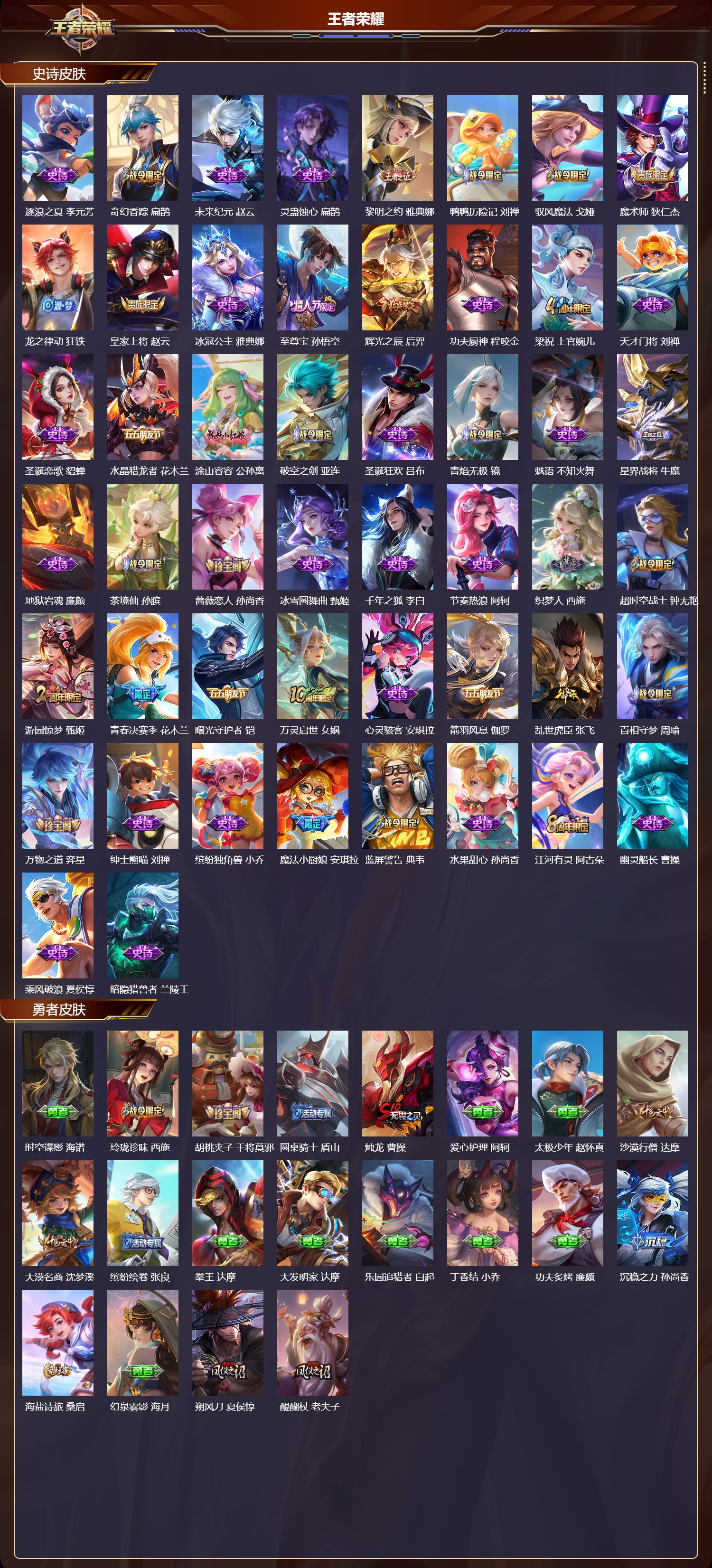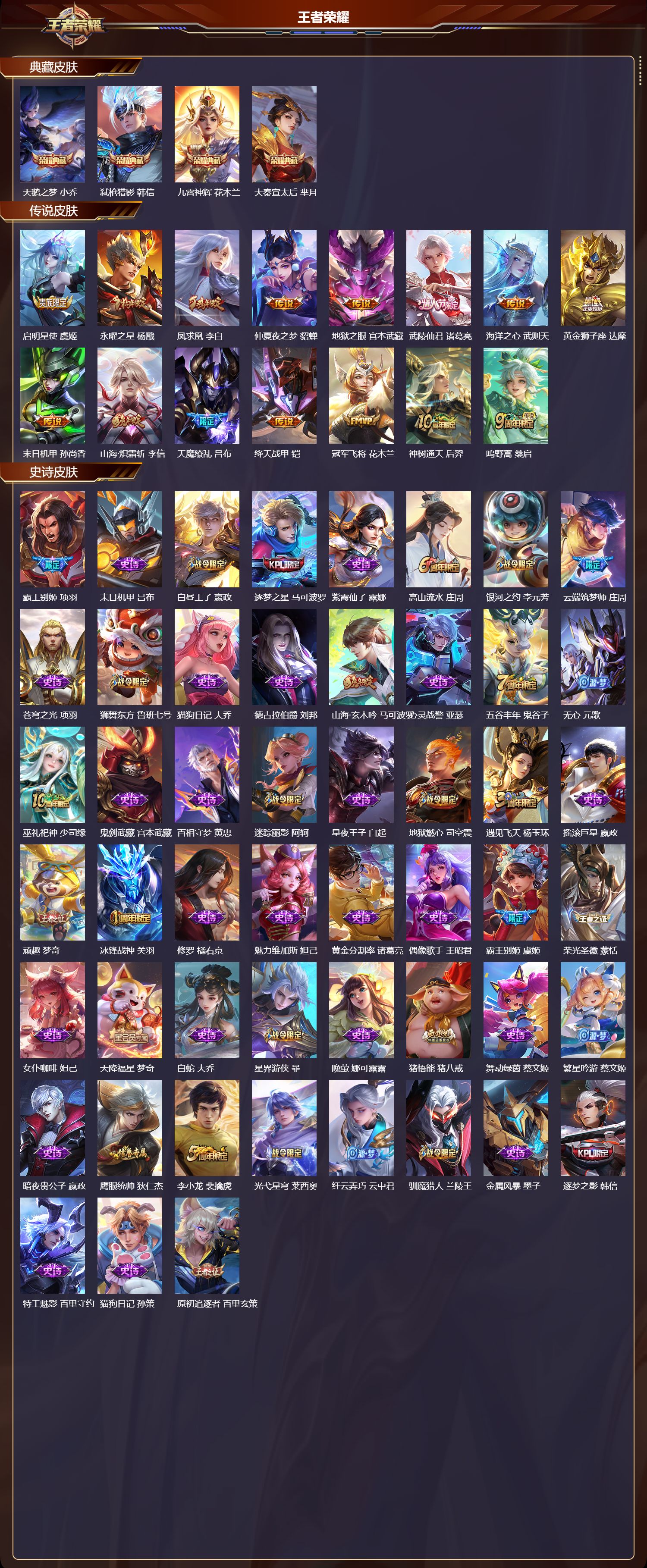 苹果qq/荣耀王者/365皮肤/128英雄/4典藏/0珍品无双/0无双/0珍品传说/15传说/101史诗/10稀有英雄【4 典藏皮肤】天鹅之梦 小乔弑呛猎影 韩信九霄神辉 花木兰大秦宣太后 芈月【15 传说皮肤】启明星使 虞姬永曜之星 杨戬凤求凰 李白仲夏夜之梦 貂蝉地狱之眼 宫本武藏武陵仙君 诸葛亮海洋之心 武则天黄金狮子座 达摩末日机甲 孙尚香山海·炽霜斩 李信天魔