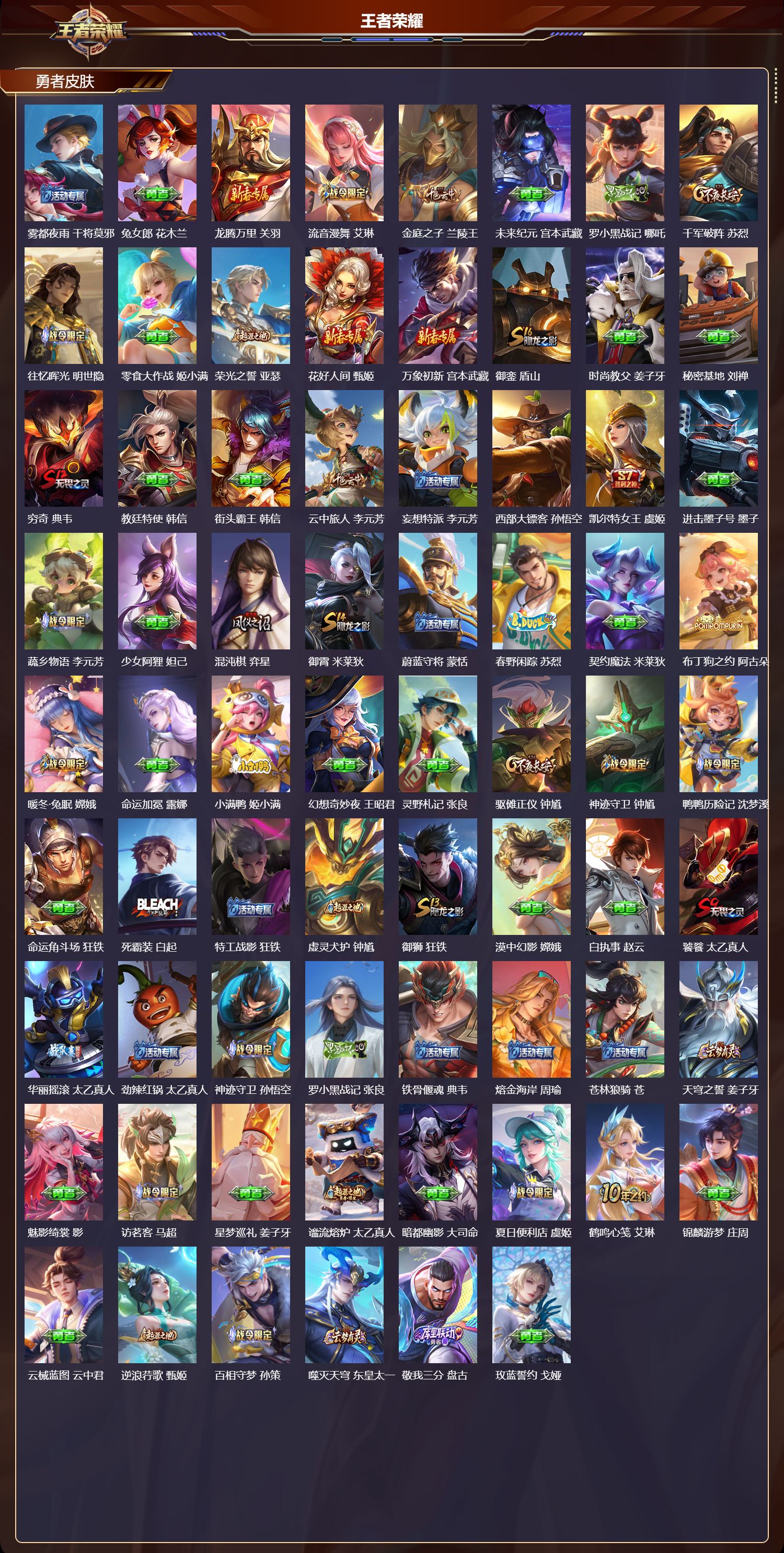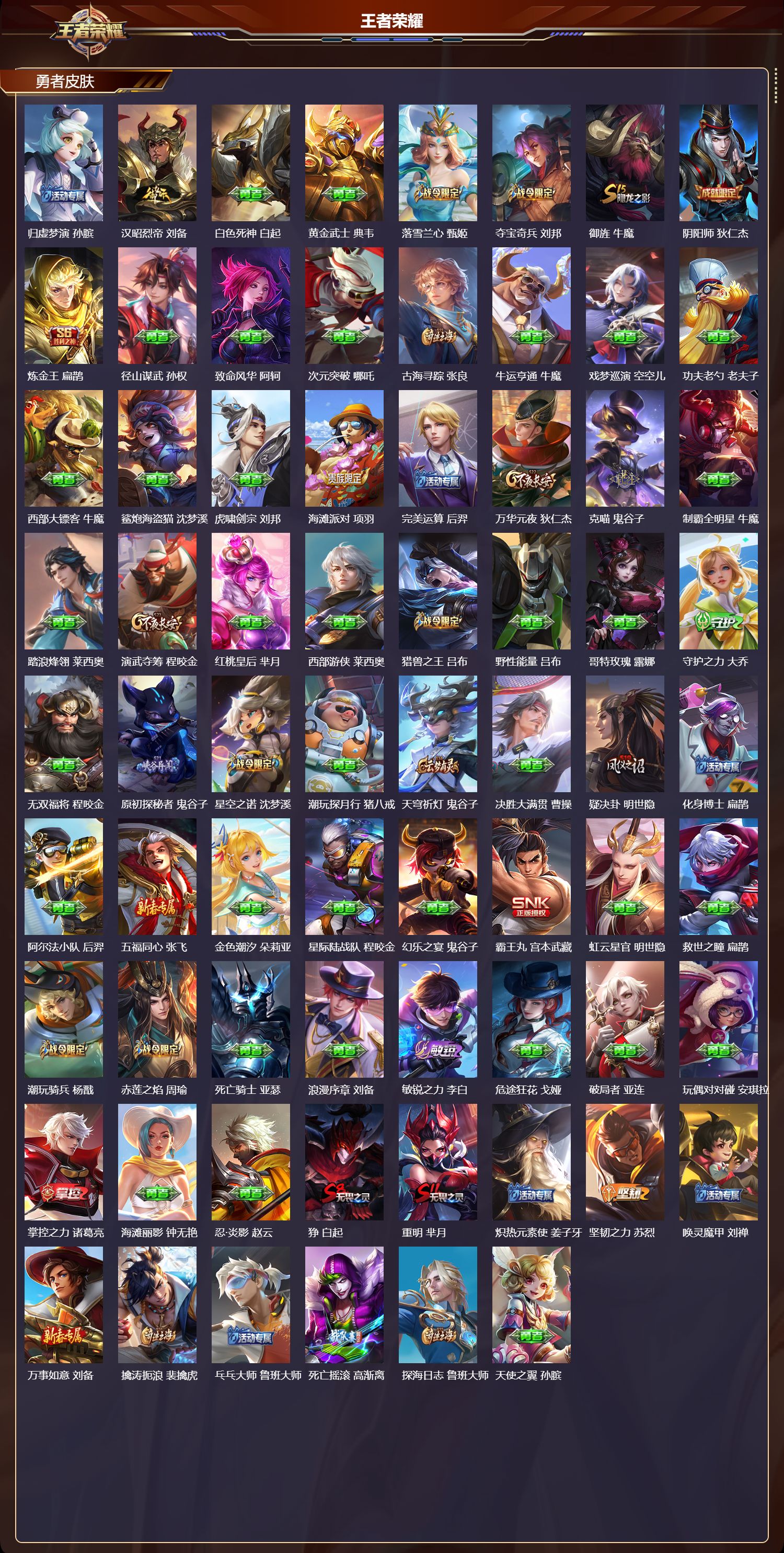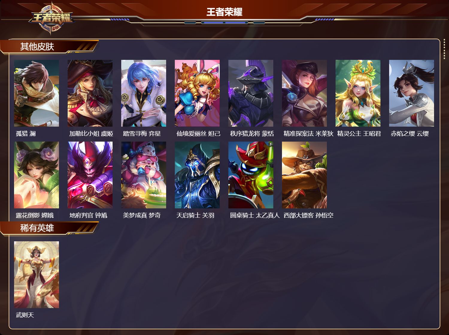 苹果qq/荣耀王者/365皮肤/128英雄/4典藏/0珍品无双/0无双/0珍品传说/15传说/101史诗/10稀有英雄【4 典藏皮肤】天鹅之梦 小乔弑呛猎影 韩信九霄神辉 花木兰大秦宣太后 芈月【15 传说皮肤】启明星使 虞姬永曜之星 杨戬凤求凰 李白仲夏夜之梦 貂蝉地狱之眼 宫本武藏武陵仙君 诸葛亮海洋之心 武则天黄金狮子座 达摩末日机甲 孙尚香山海·炽霜斩 李信天魔