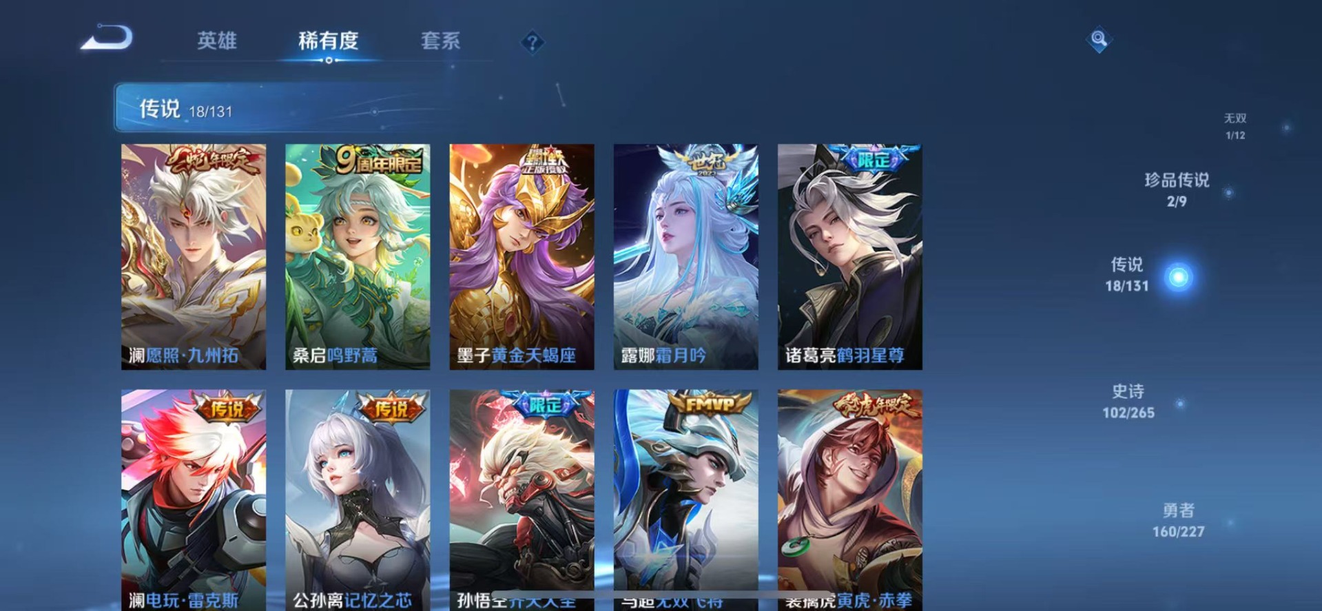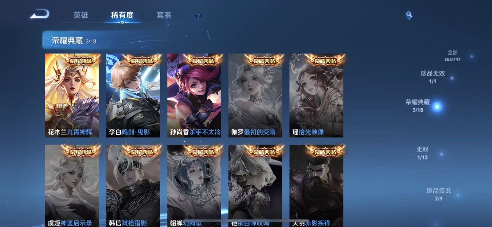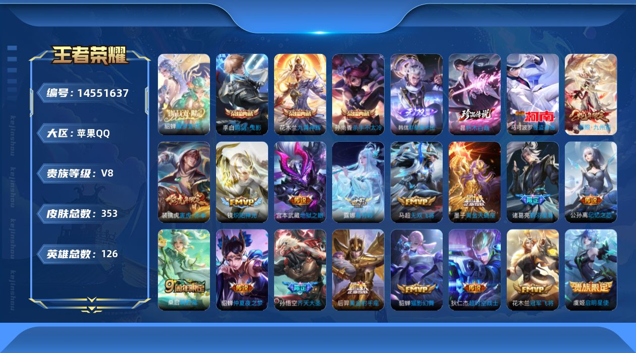 v8 3典藏 1珍品无双 1无双 2珍品传说 18传说 126英雄 353皮肤 可修改实名 【英雄全皮】:蒙恬全皮敖隐全皮空空儿全皮鬼谷子全皮影全皮 【稀有英雄】:敖隐小龙人大司命韩信韩跳跳夏洛特夏师傅艾琳橘右京橘子娜可露露鸟人不知火舞赵云金蝉唐僧