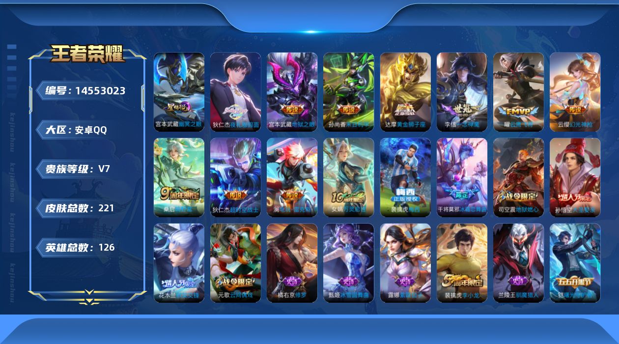 安卓q【可二次】v7-126英雄-221皮肤-12王者印记(10传说)幽冥之眼【传说】 幻光神呛 鸣野蒿 夜礼服假面 电玩雷克斯 云鹰飞将 一念神魔 黄金狮子座 超时空战士男 地狱之眼 末日机甲女 【热门】万灵启世 梅西 默契交锋女 大圣娶亲 冰霜恋舞曲 猎兽之王 神迹守卫钟馗 狮舞东方 冰冠公主