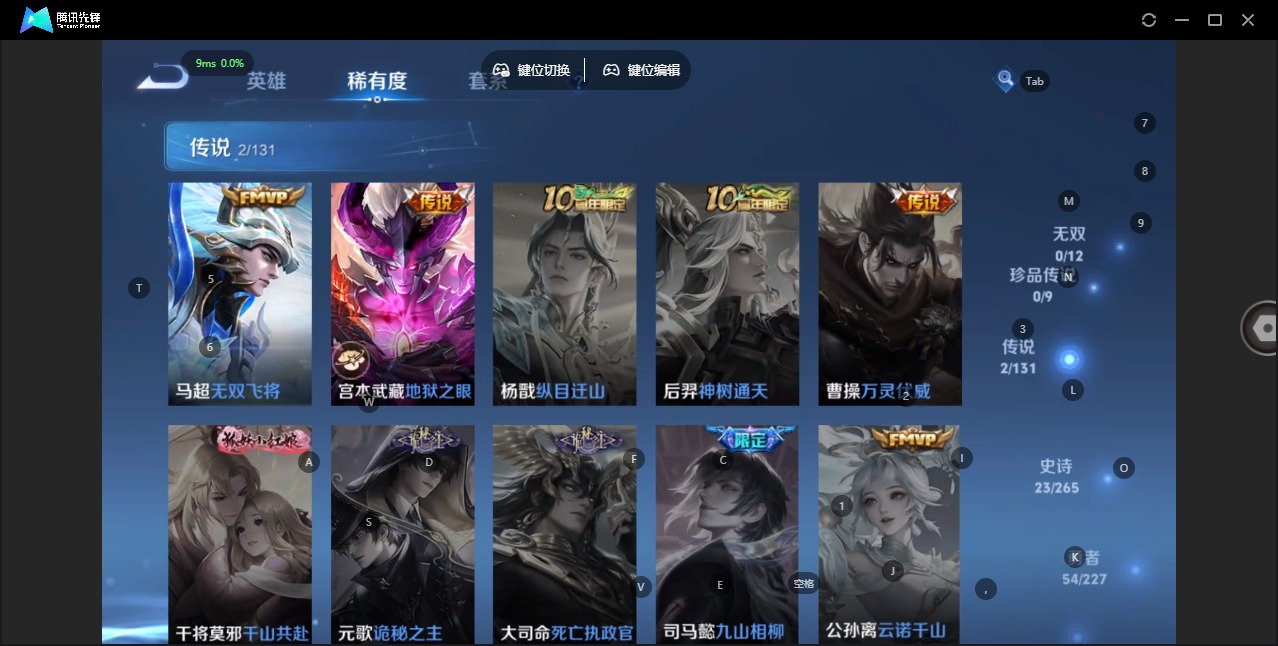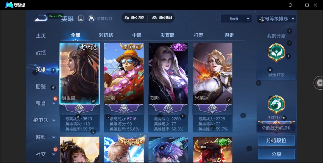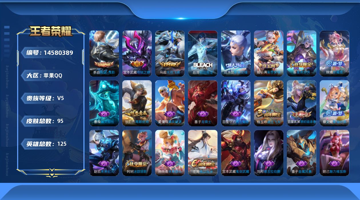 v5 1典藏 2传说 125英雄 95皮肤 可修改实名 【英雄全皮】:蚩奼全皮 【稀有英雄】:大司命韩信韩跳跳夏洛特夏师傅艾琳橘右京橘子娜可露露鸟人不知火舞赵云金蝉唐僧戈娅 【荣耀水晶】:鸣剑·曳影 【传说皮】:地狱之眼无双飞将 【珍宝阁皮】:妄想食味 【赛