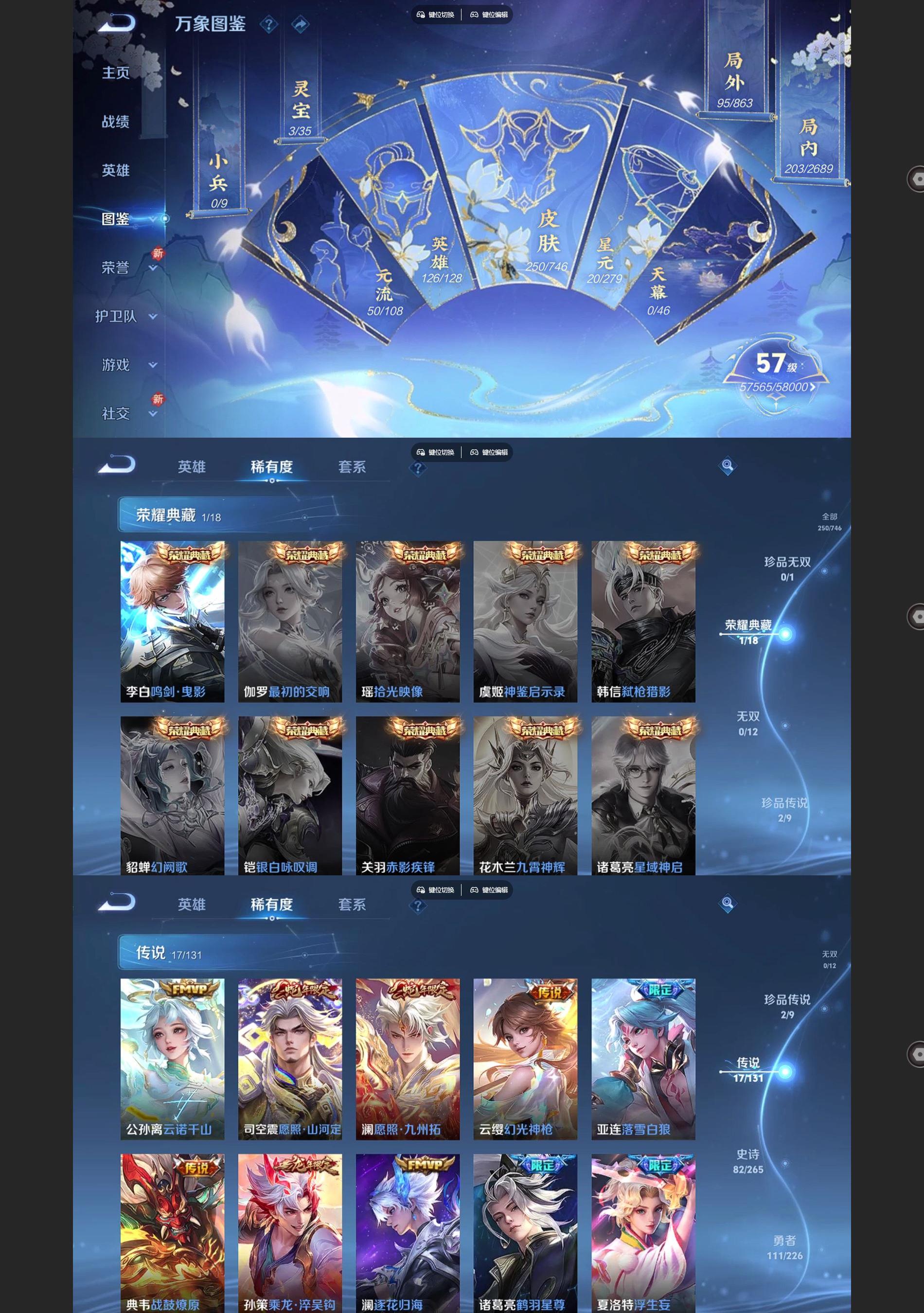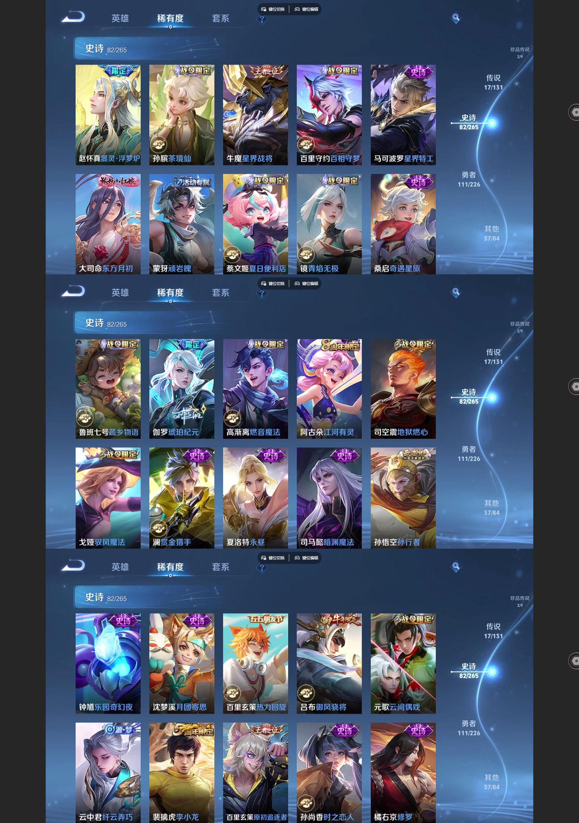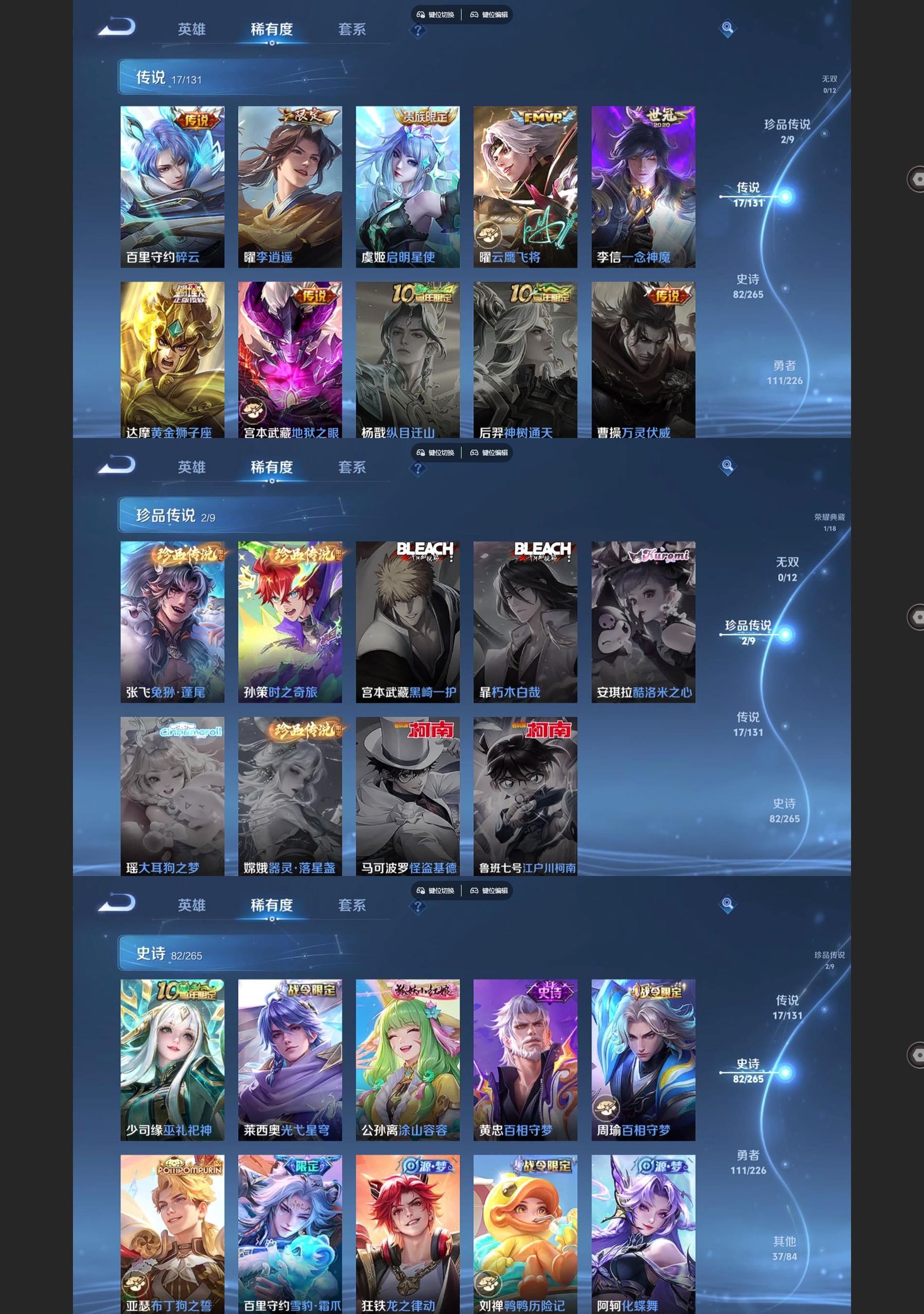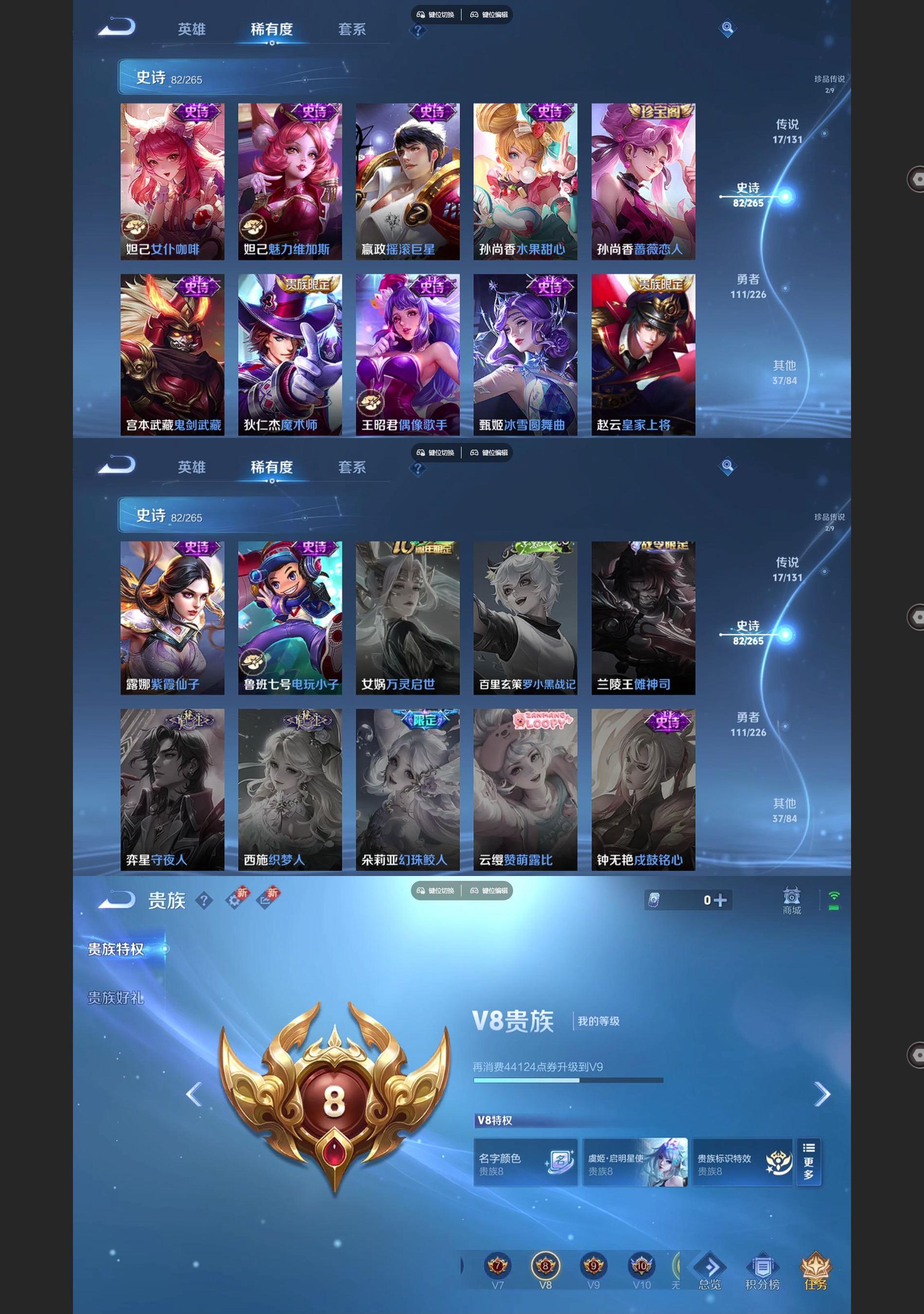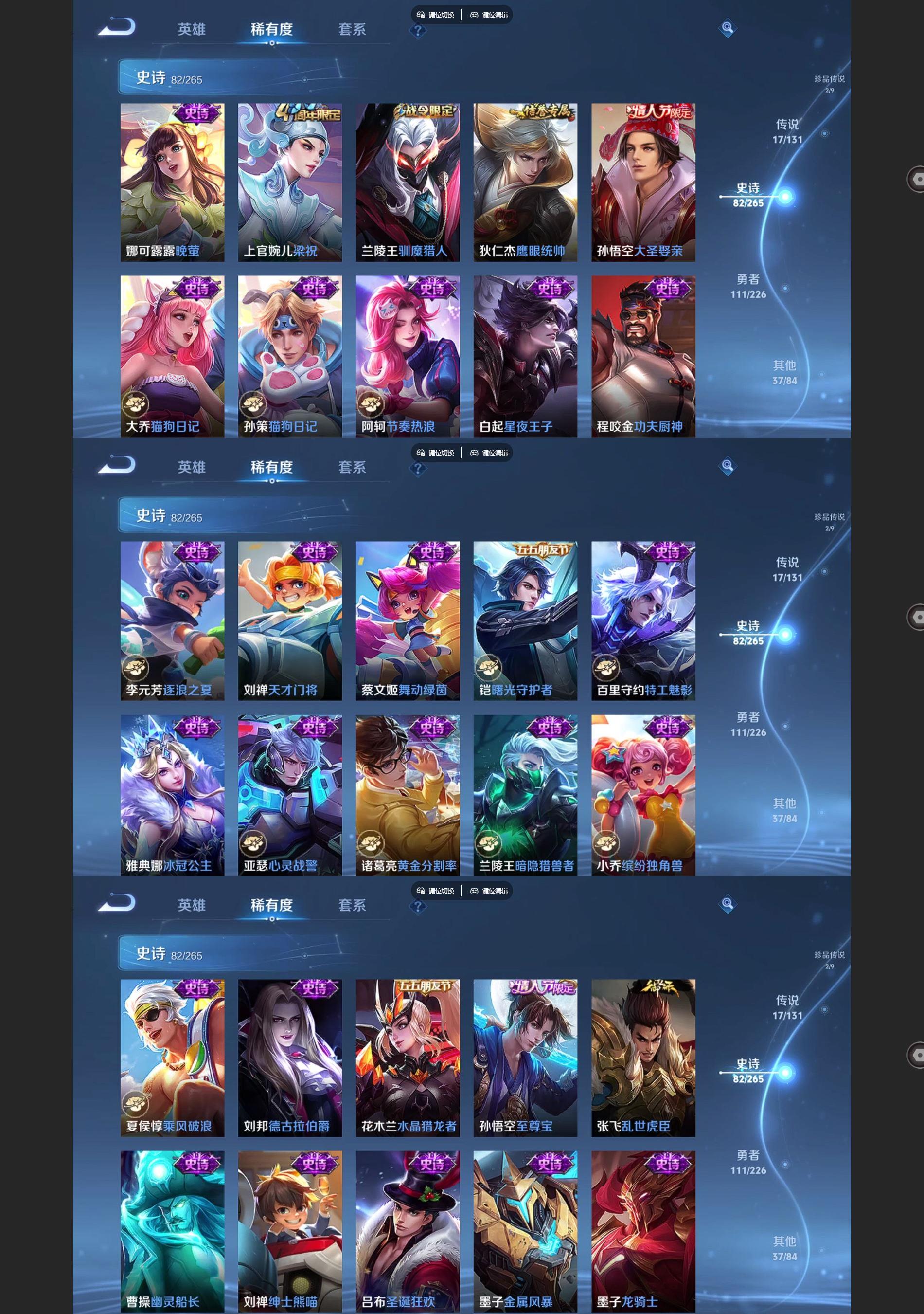 2273703-苹果q-v8-250皮肤1典藏2珍品传说17传说2778紫星币 258幸运值 【全皮英雄】 司空震全皮 刘邦全皮 夏洛特全皮 影全皮 戈娅全皮 【典藏】 鸣剑曳影 【珍品传说】 兔狲蓬尾 时之奇旅孙策 【传说】 落雪白狼 乘龙淬吴钩 战鼓燎原 逐花归海 云诺千山 幻光神呛 愿照九州拓 愿照山河定 鹤羽星尊 启明星使 李 浮生妄 碎云 云鹰飞将 一念神魔 黄金狮