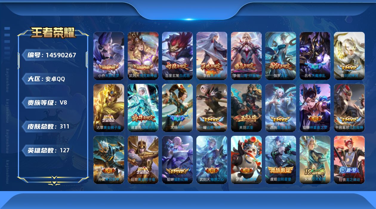 v8 2典藏 21传说 127英雄 311皮肤 典藏英雄武则天 可修改实名 【英雄全皮】:雅典娜全皮空空儿全皮金蝉全皮 【稀有英雄】:大司命嬴政始皇帝韩信韩跳跳夏洛特夏师傅艾琳橘右京橘子娜可露露鸟人不知火舞赵云金蝉唐僧戈娅 【荣耀水晶】:天鹅之梦小