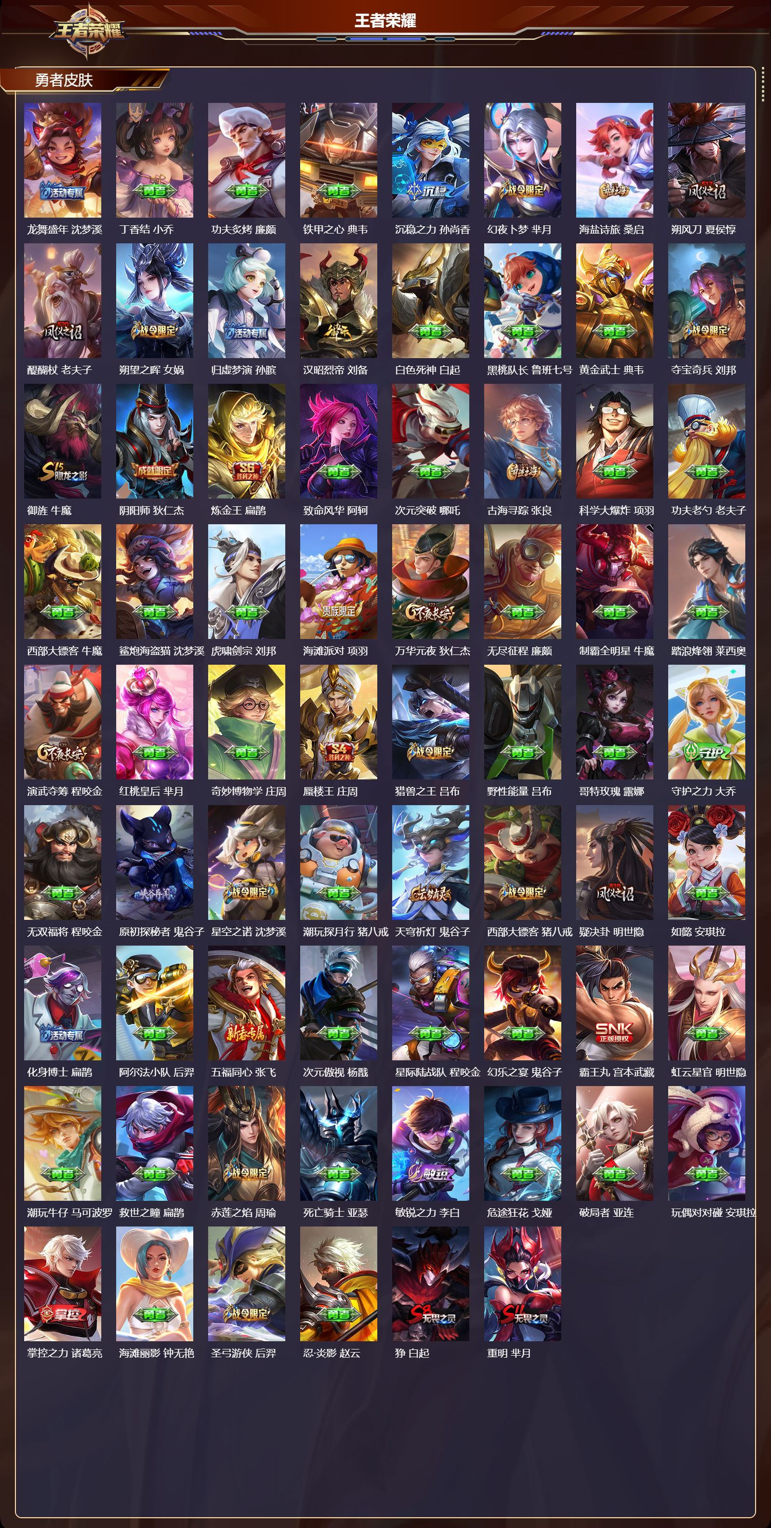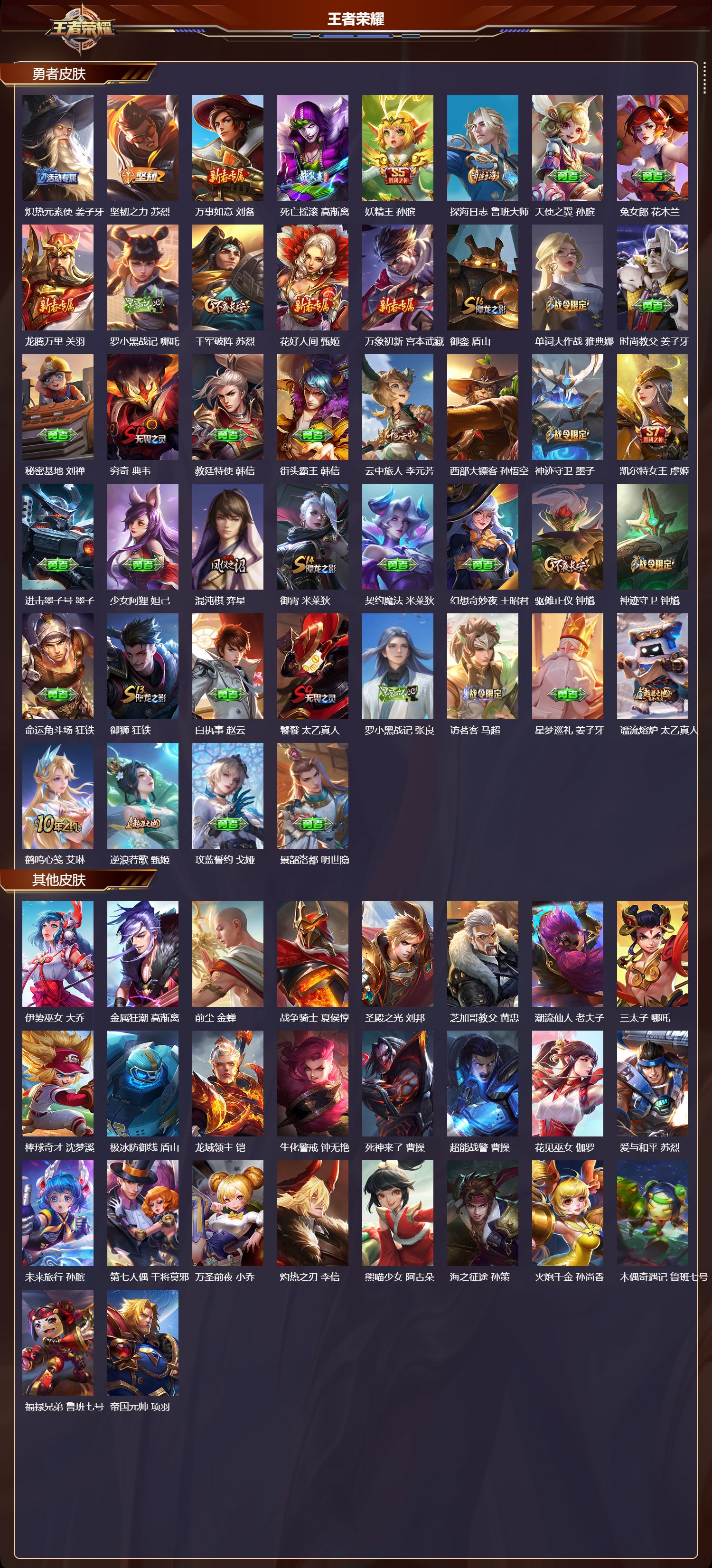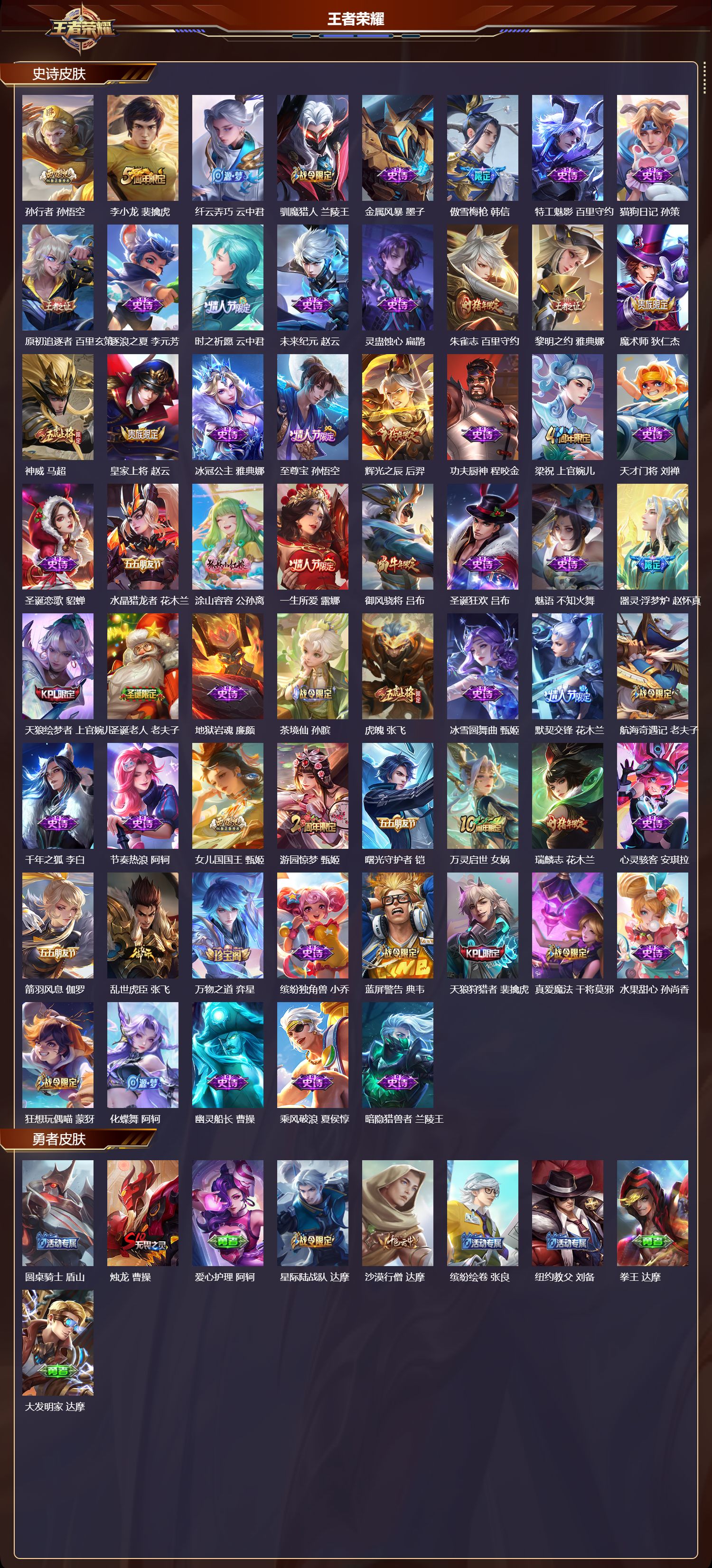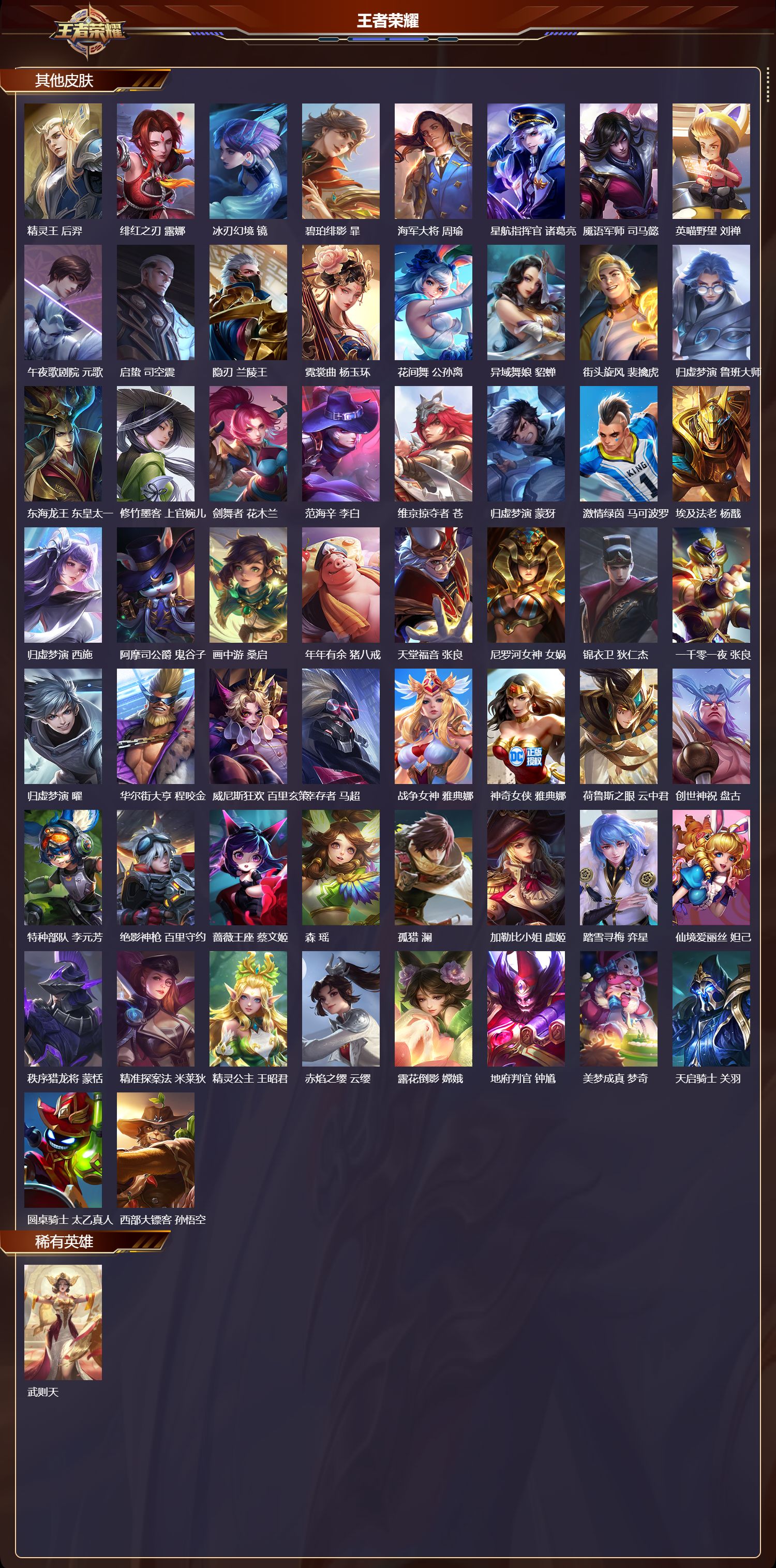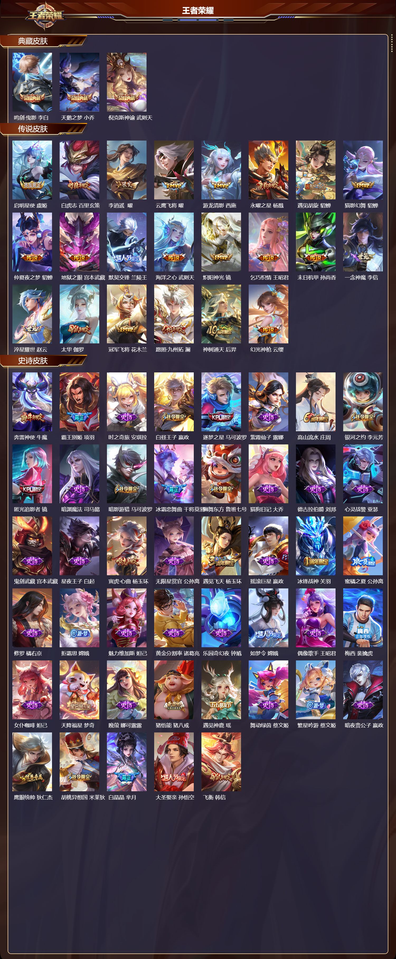 安卓qq/绝世王者/337皮肤/127英雄/3典藏/0珍品无双/0无双/0珍品传说/22传说/106史诗/9稀有英雄【3 典藏皮肤】鸣剑·曳影 李白天鹅之梦 小乔倪克斯神谕 武则天【22 传说皮肤】启明星使 虞姬白虎志 百里玄策李 曜云鹰飞将 曜游龙清影 西施永曜之星 杨戬遇见胡旋 貂蝉猫影幻舞 貂蝉仲夏夜之梦 貂蝉地狱之眼 宫本武藏默契交锋 兰