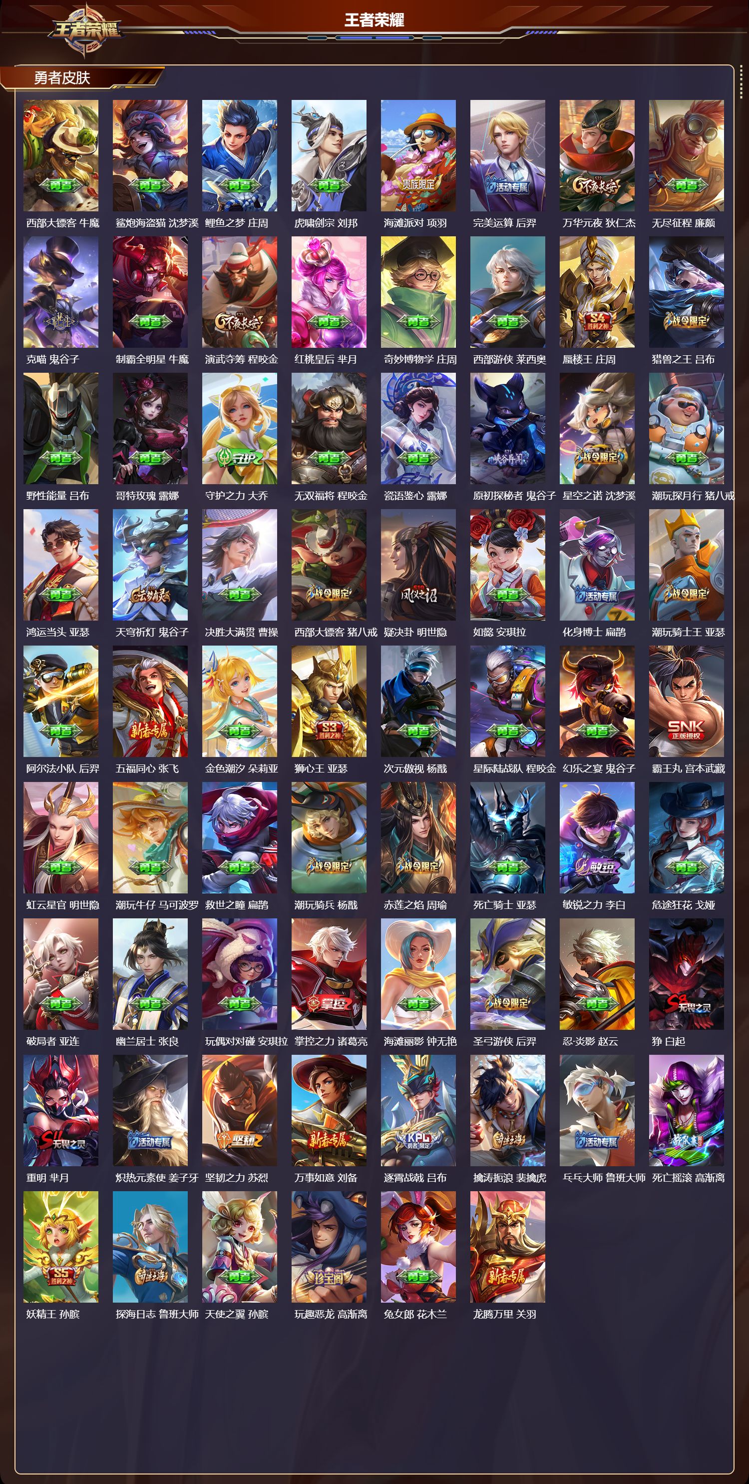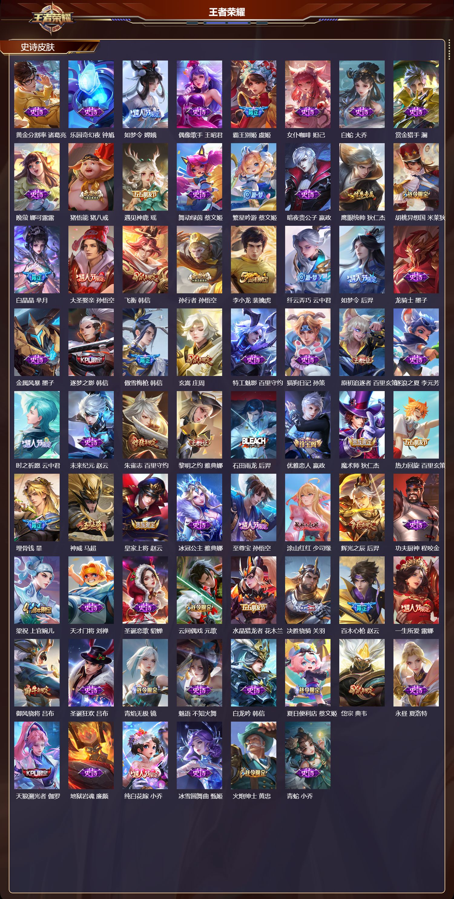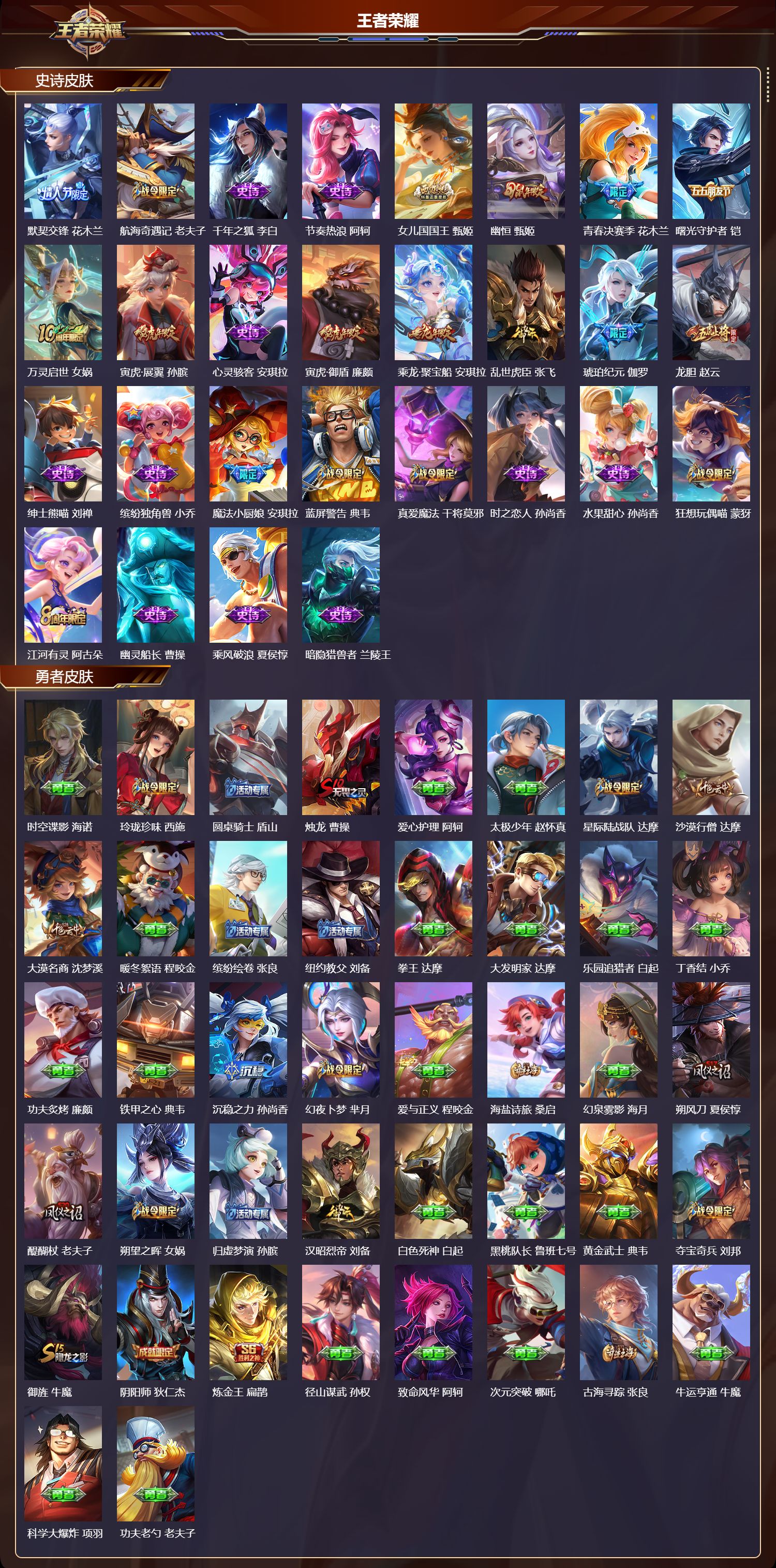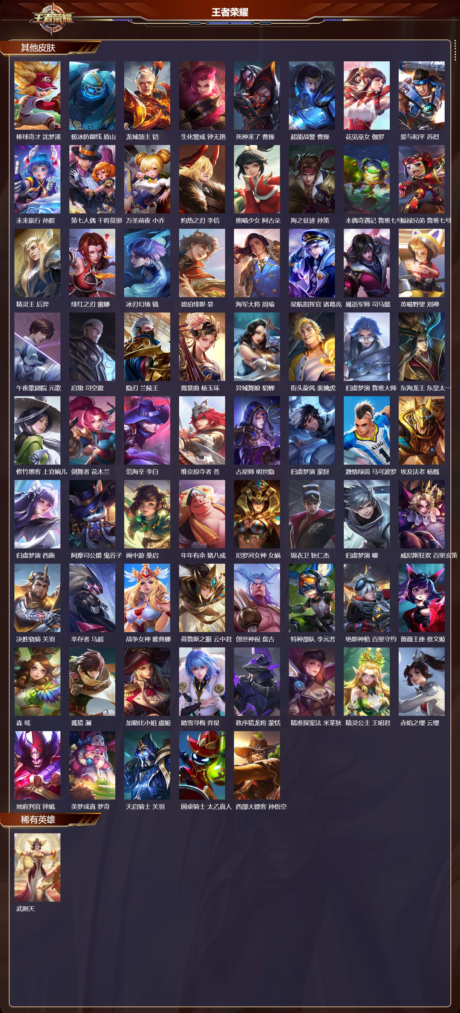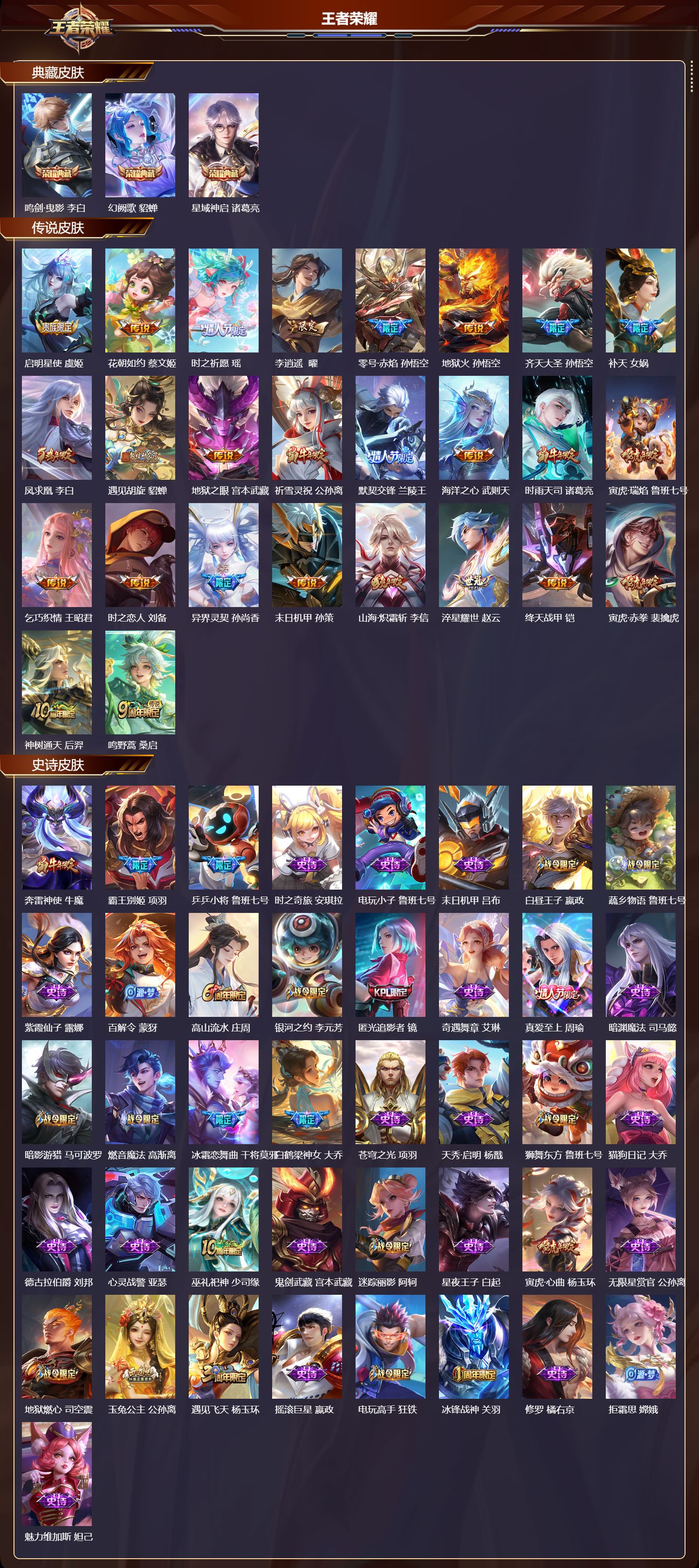 安卓qq/尊贵铂金/417皮肤/128英雄/3典藏/0珍品无双/0无双/0珍品传说/26传说/139史诗/10稀有英雄【3 典藏皮肤】鸣剑·曳影 李白幻阙歌 貂蝉星域神启 诸葛亮【26 传说皮肤】启明星使 虞姬花朝如约 蔡文姬时之祈愿 瑶李 曜零号·赤焰 孙悟空地狱火 孙悟空齐天大圣 孙悟空补天 女娲凤求凰 李白遇见胡旋 貂蝉地狱之眼 宫本武藏
